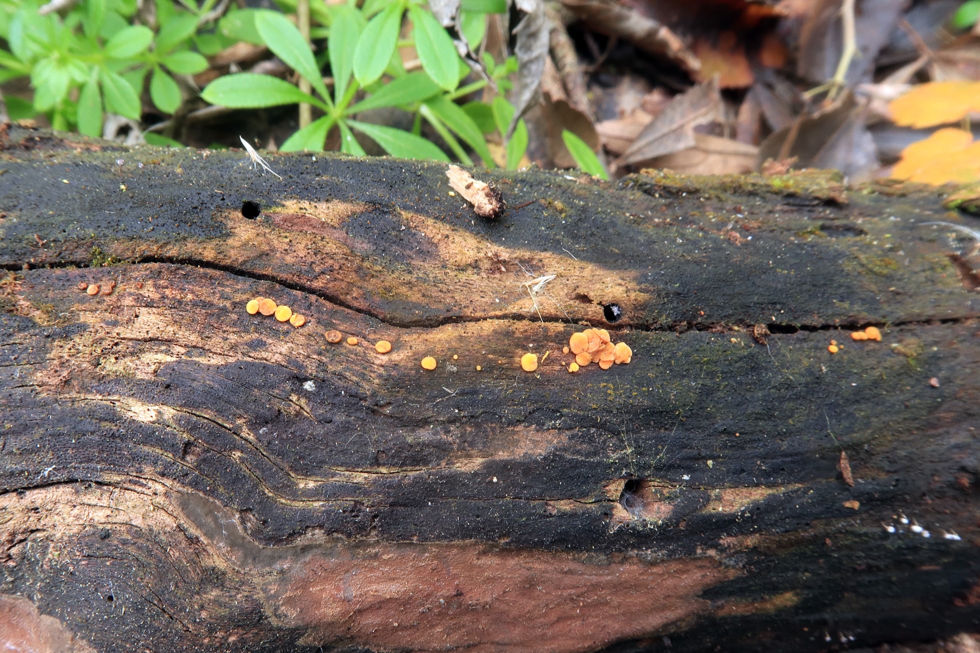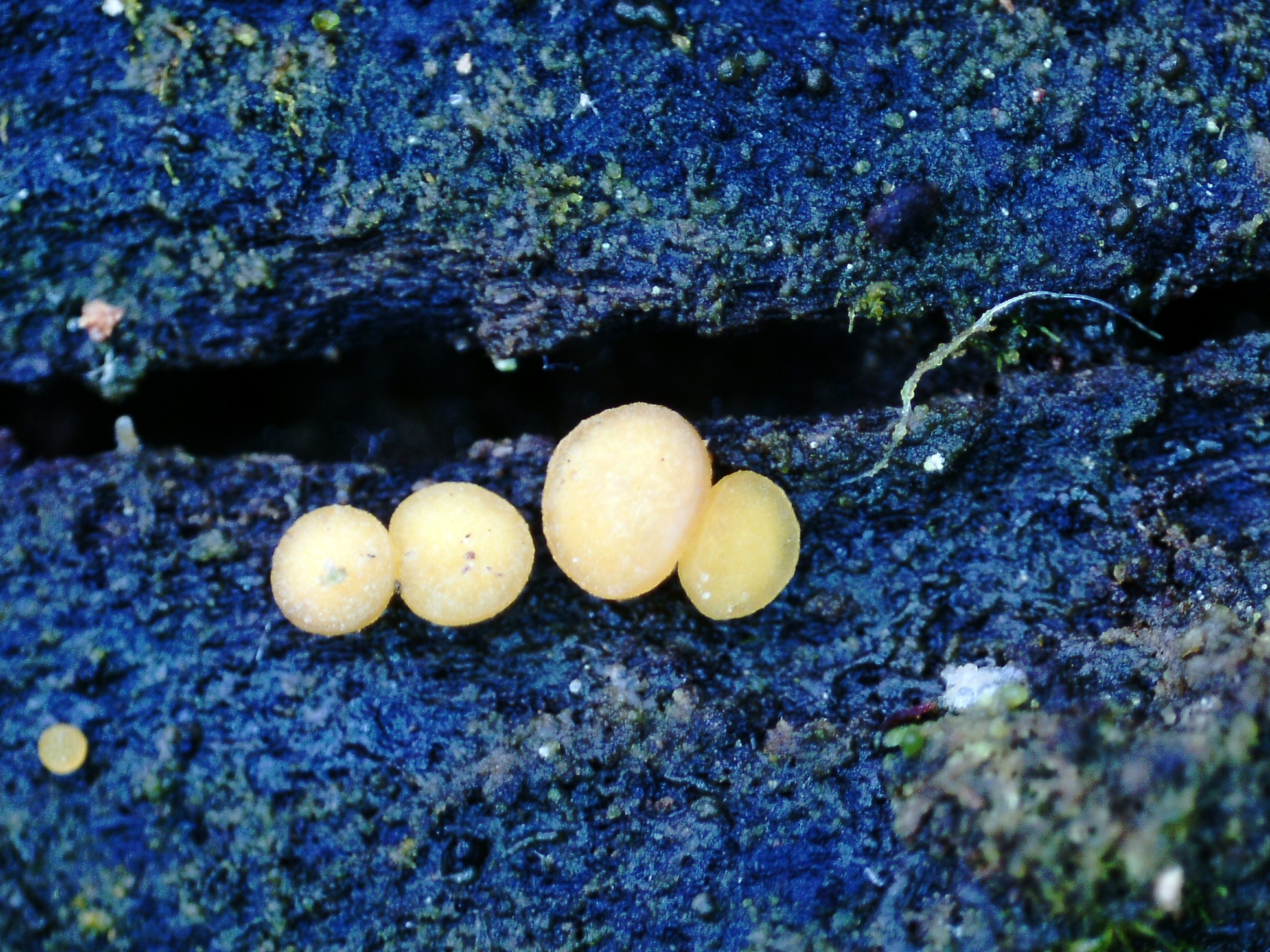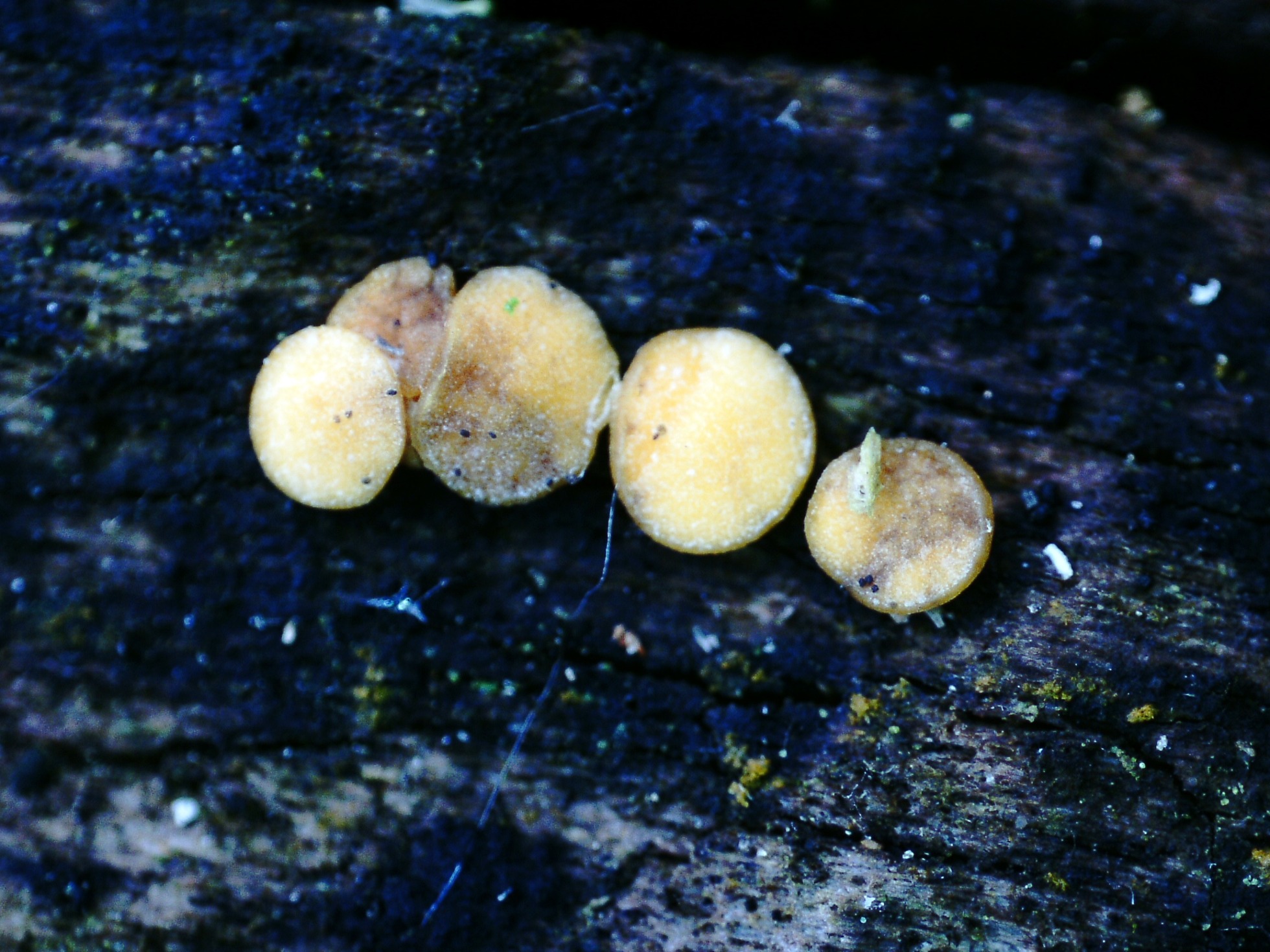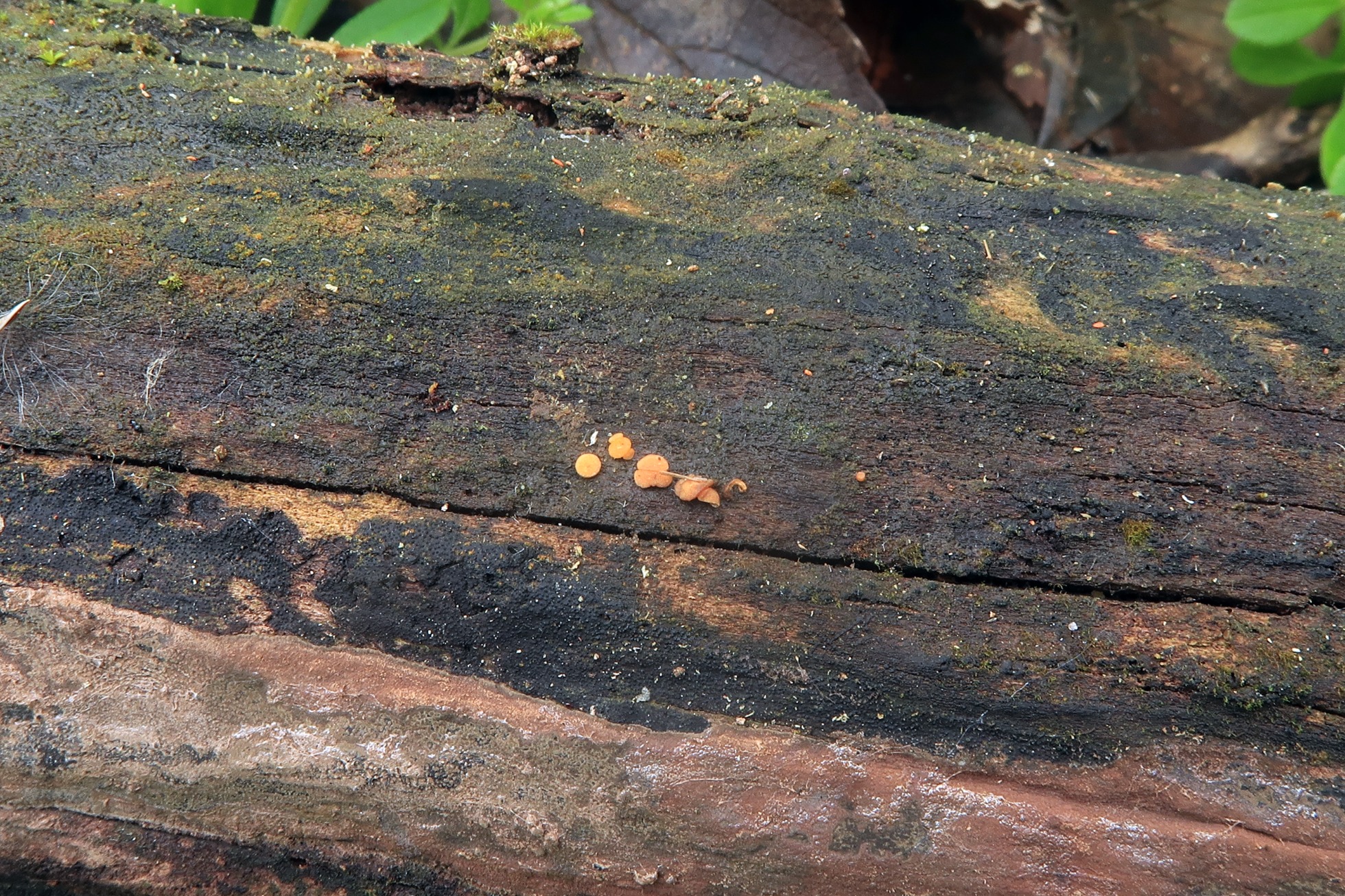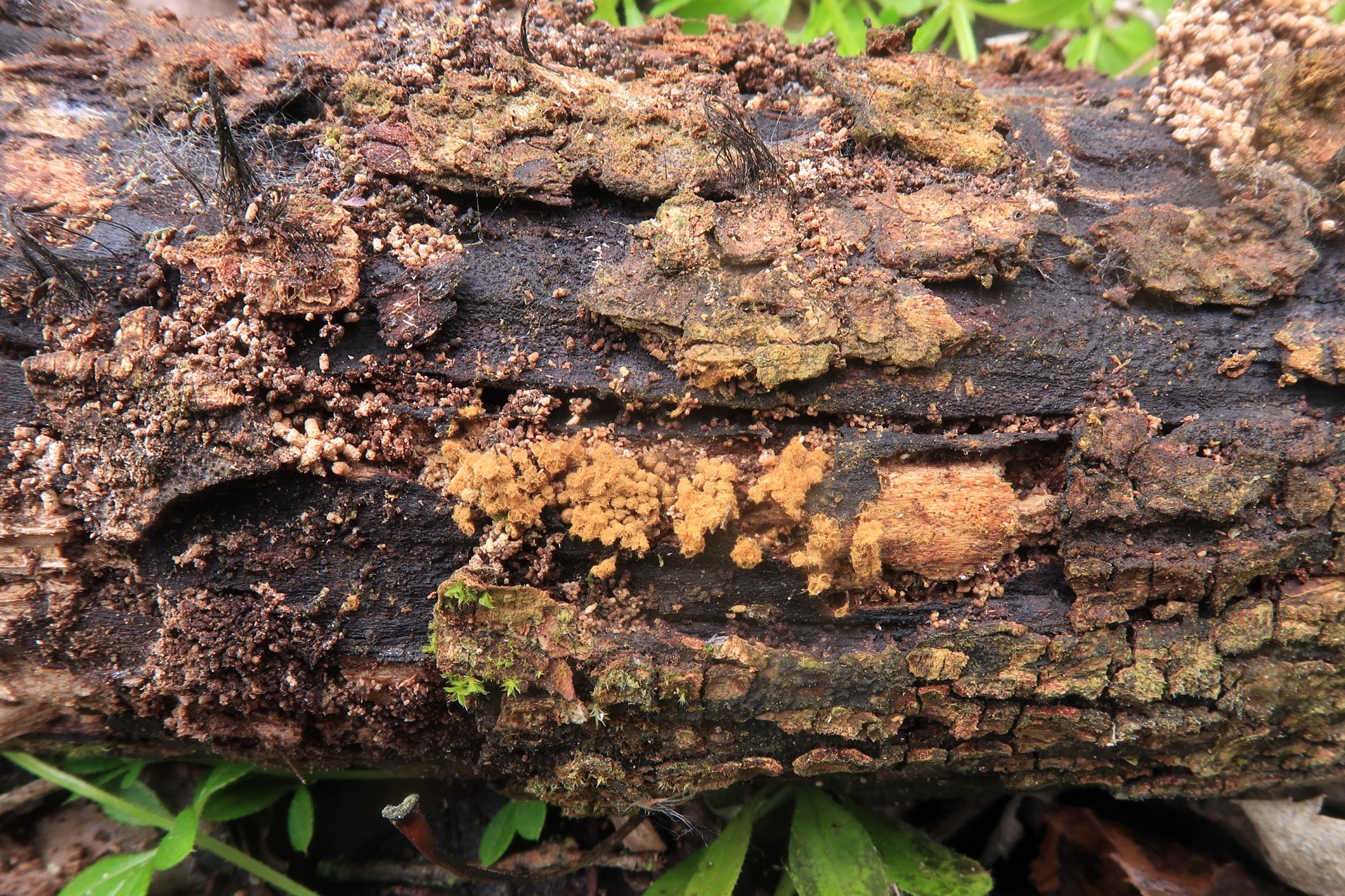 Un ascomiceto en forma de granos sobre la superficie de un tronco tumbado del suelo, el Claussenomyces prasinulus, y en la parte baja de la imágen a la derecha, su anamorfo, los sinemas de la Dendrostylbella prasinula.