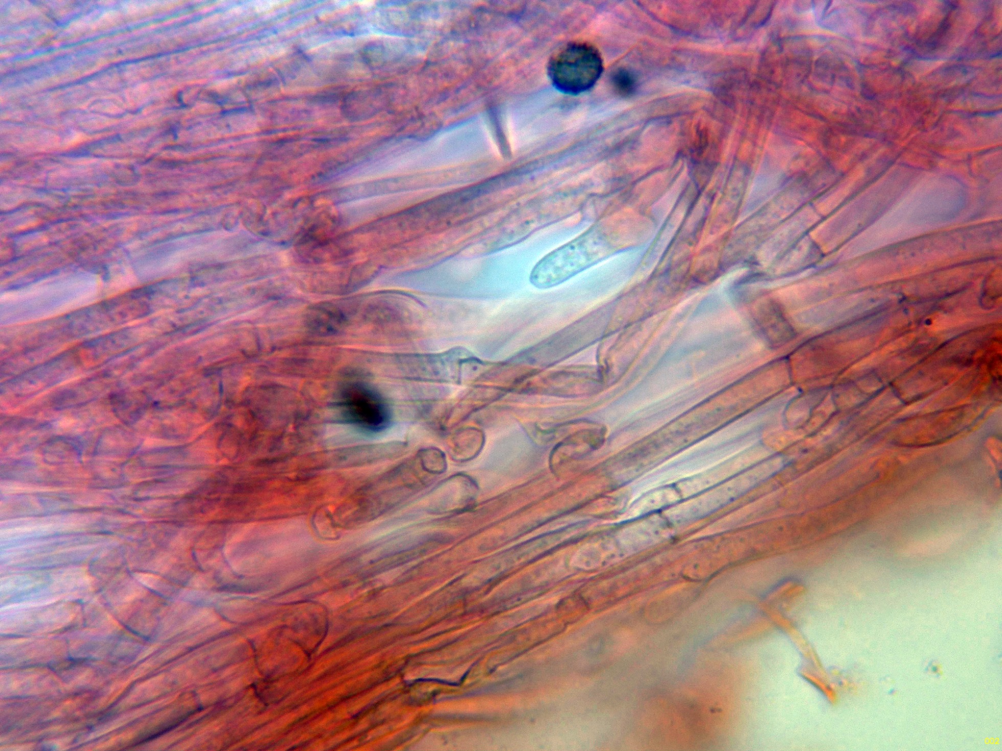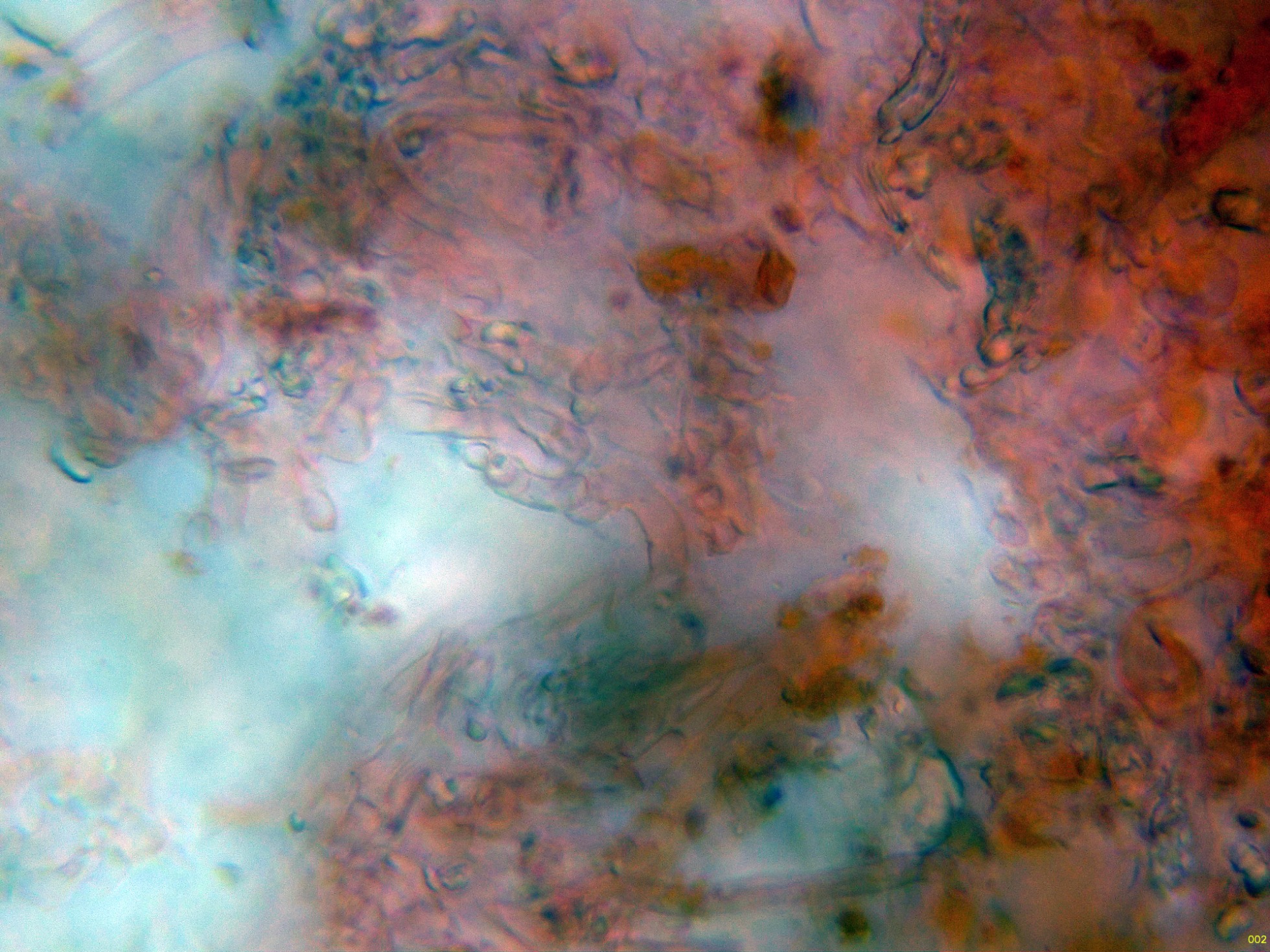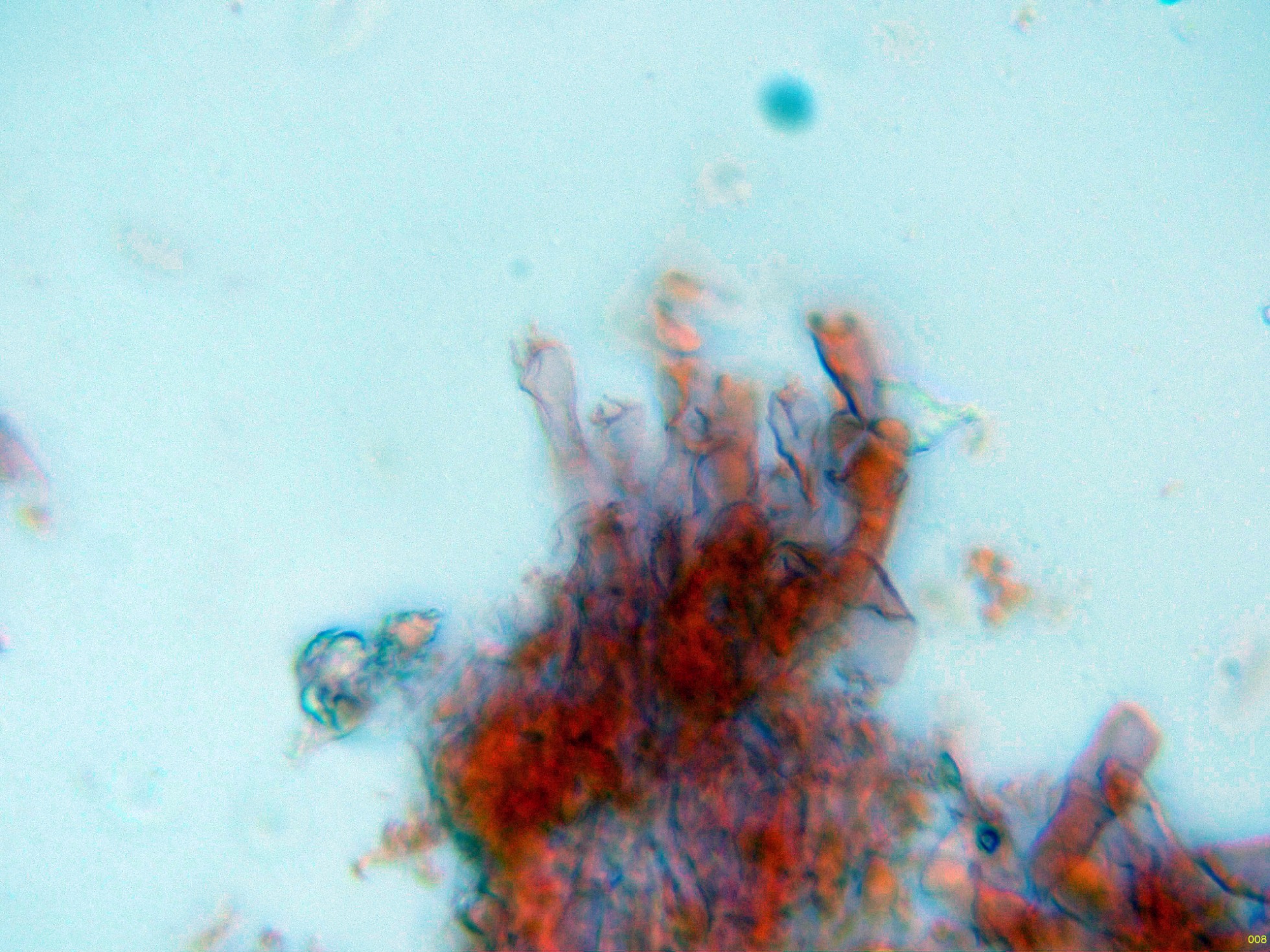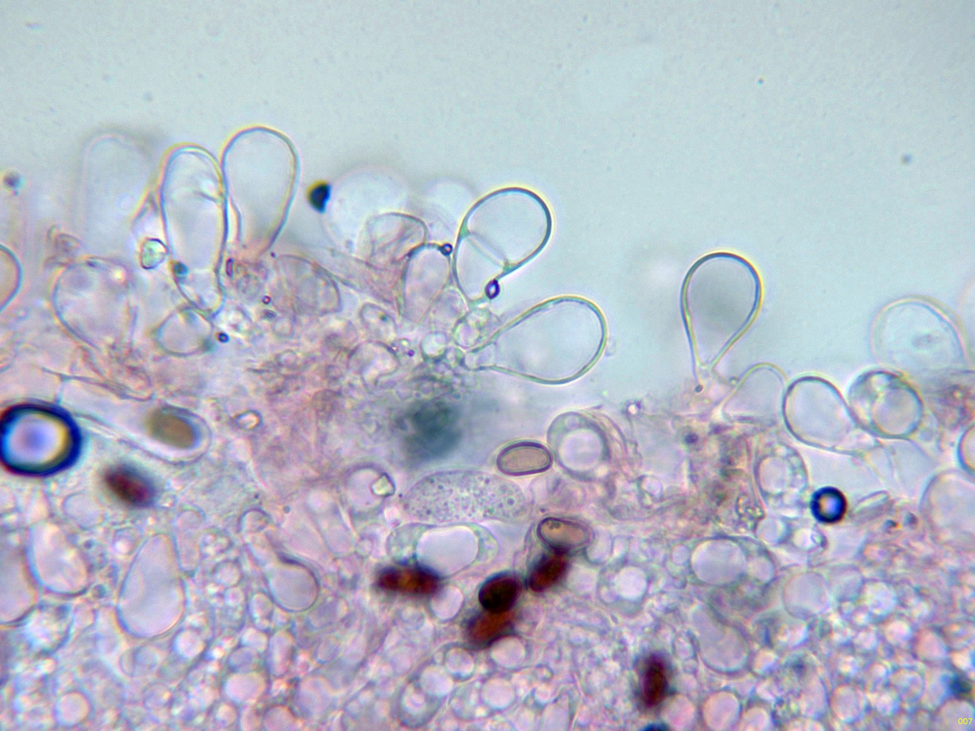 Basidios muy hundidos en el himenio y muy difíciles de observar, solo en esta imágen parecen intuirse en el centro: