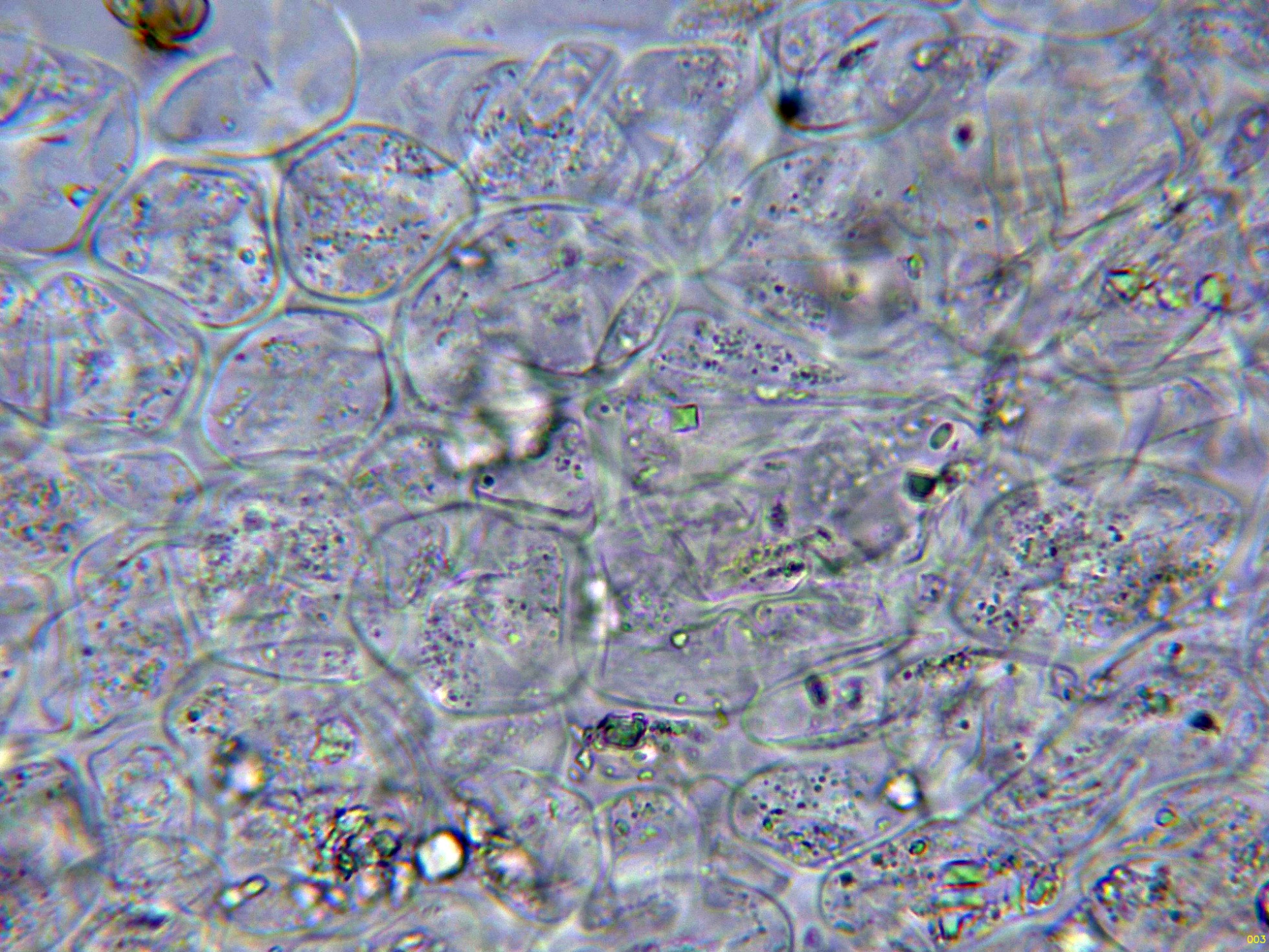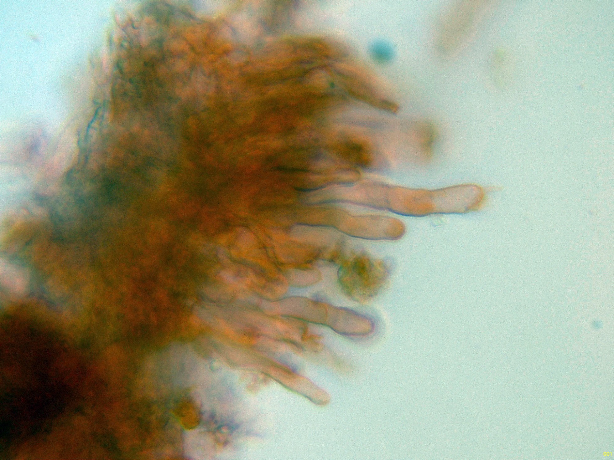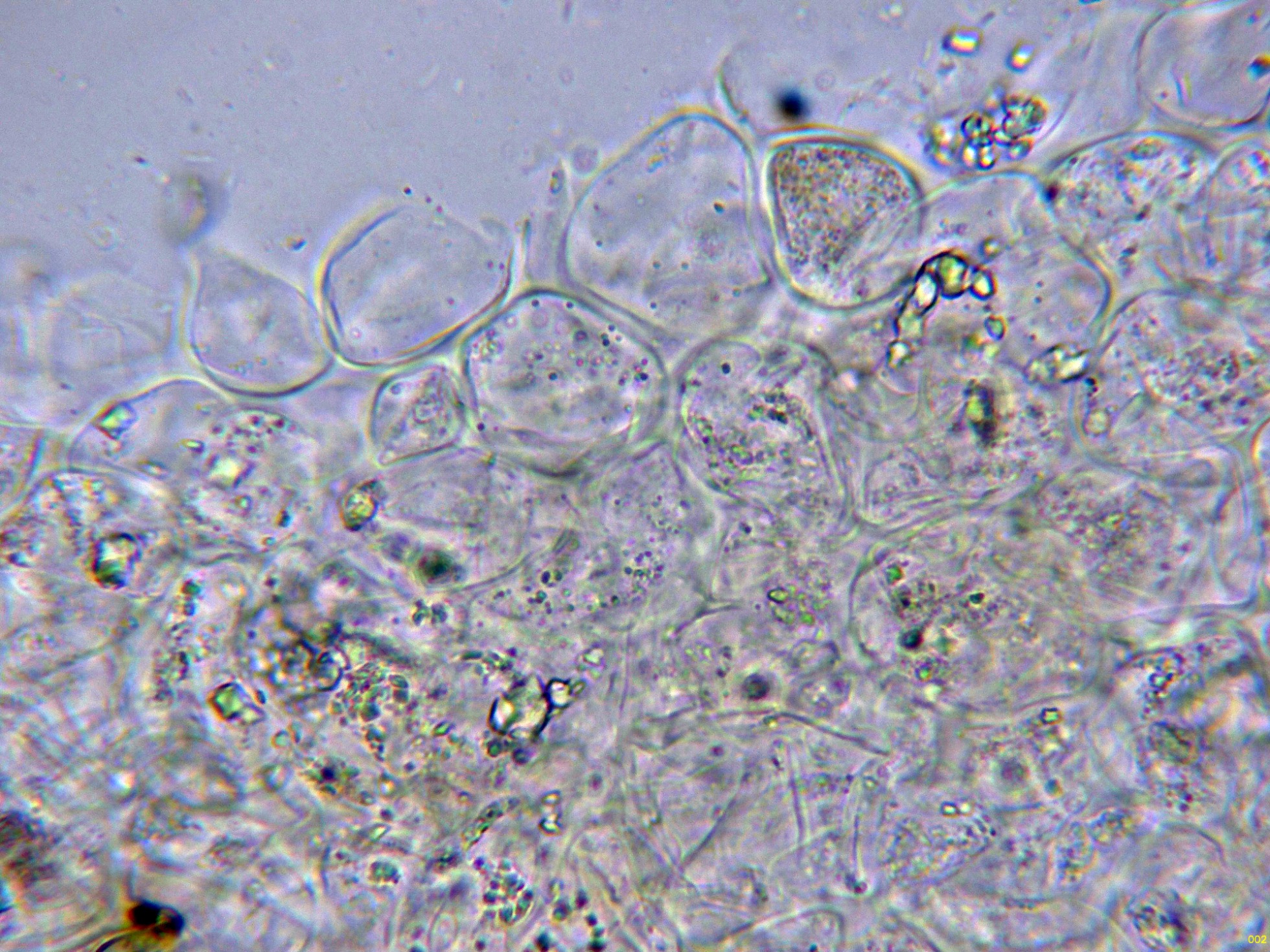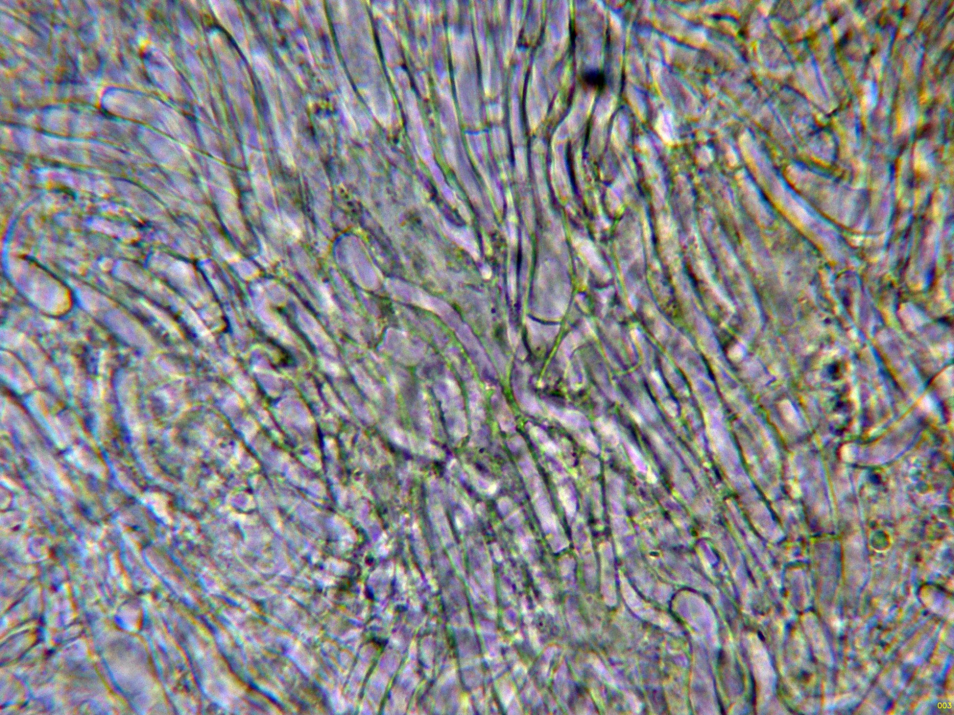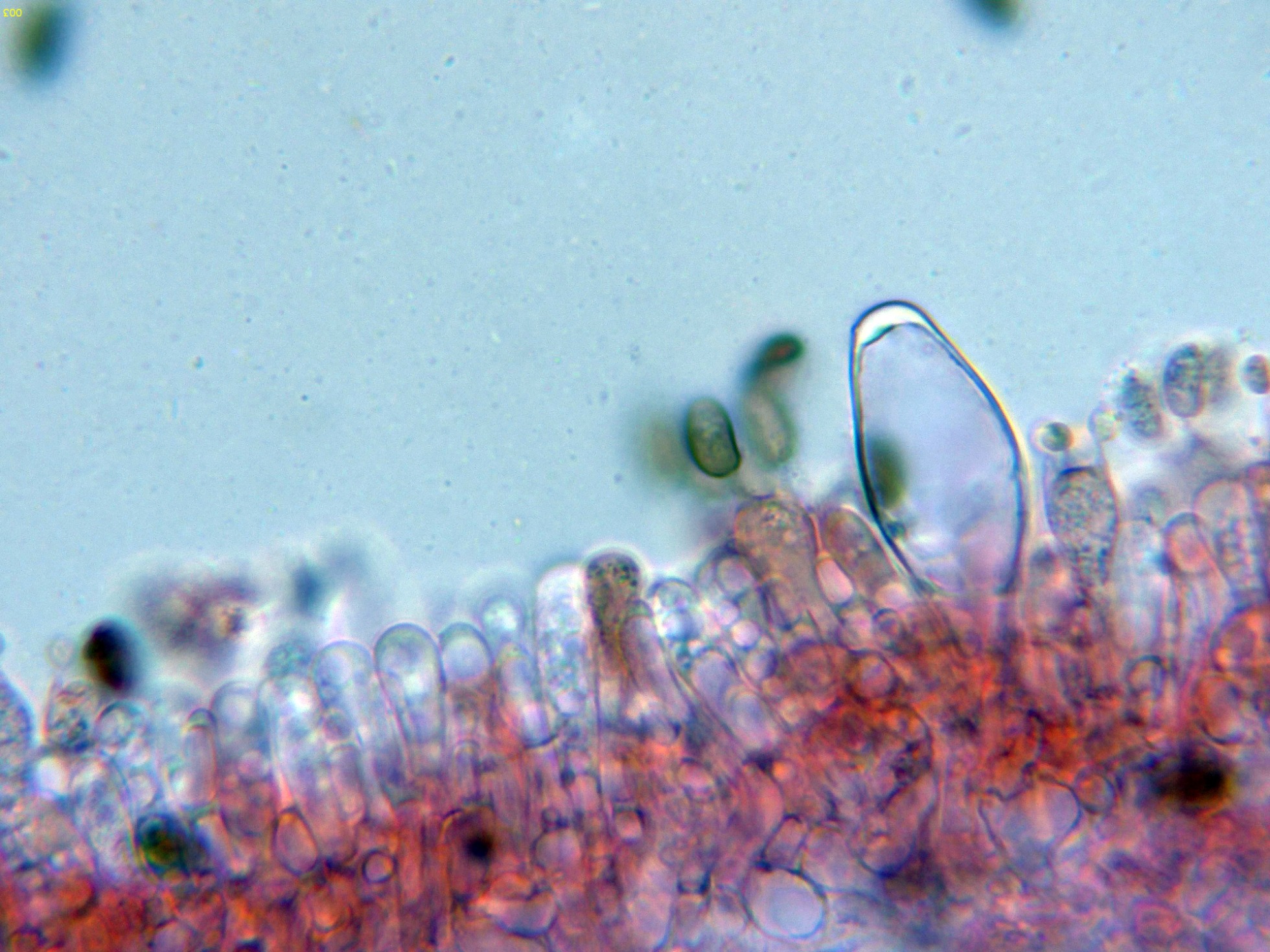 Basidios muy hundidos en el himenio y muy difíciles de observar, solo en esta imágen parecen intuirse en el centro: