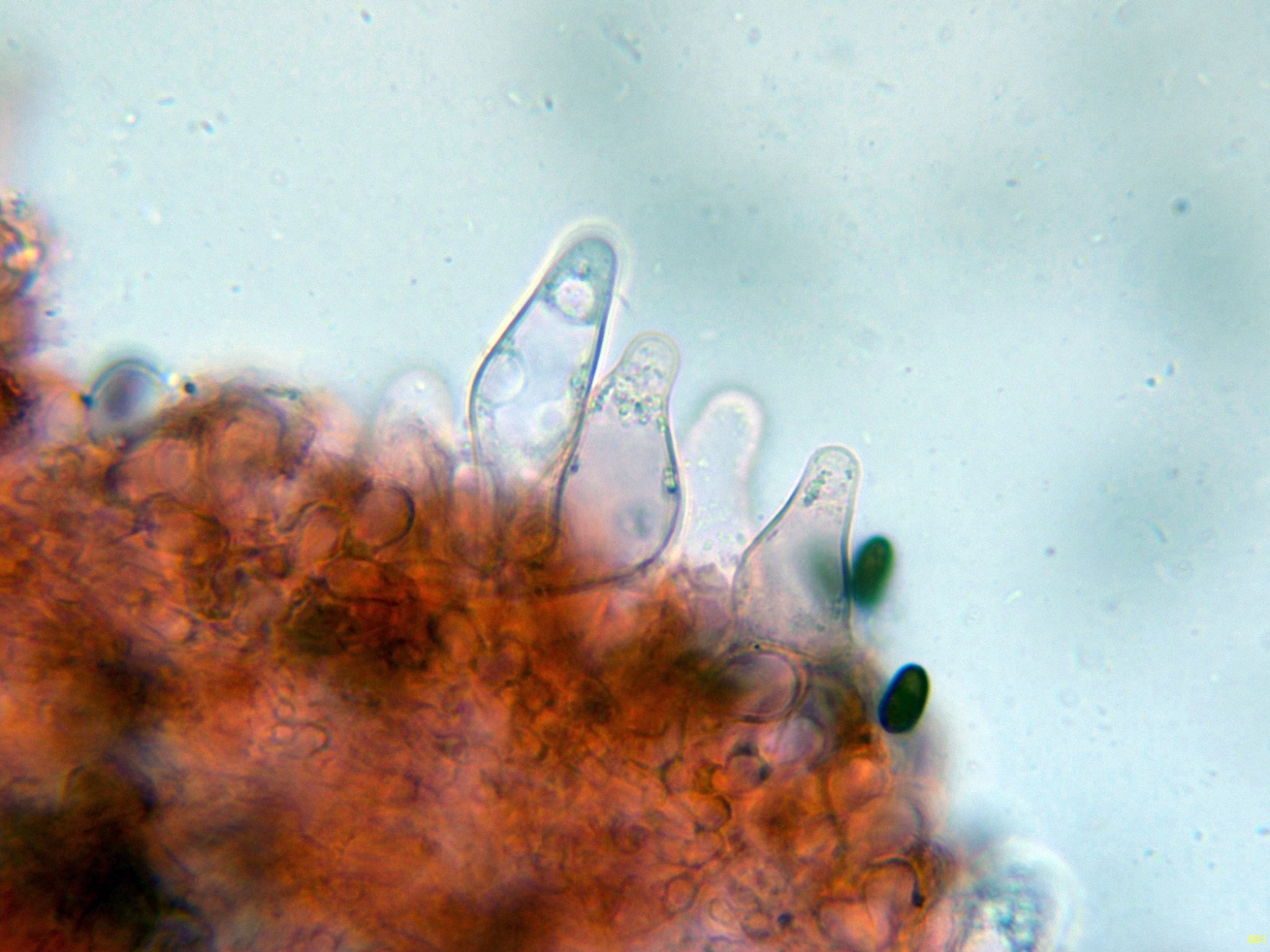 Los queilocistidios, con dos formas distintas, los de mayor proyección con unas medidas de (21.3) 24.9 - 52.6 (56.1) × (8.8) 9.5 - 15.8 (17.2) µm.: