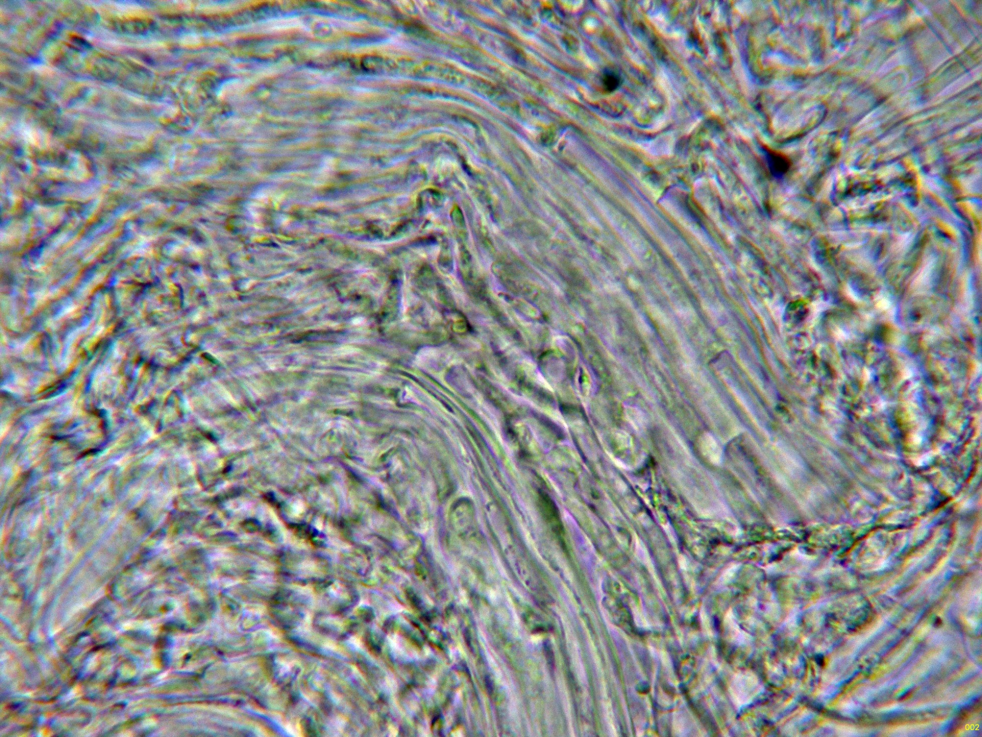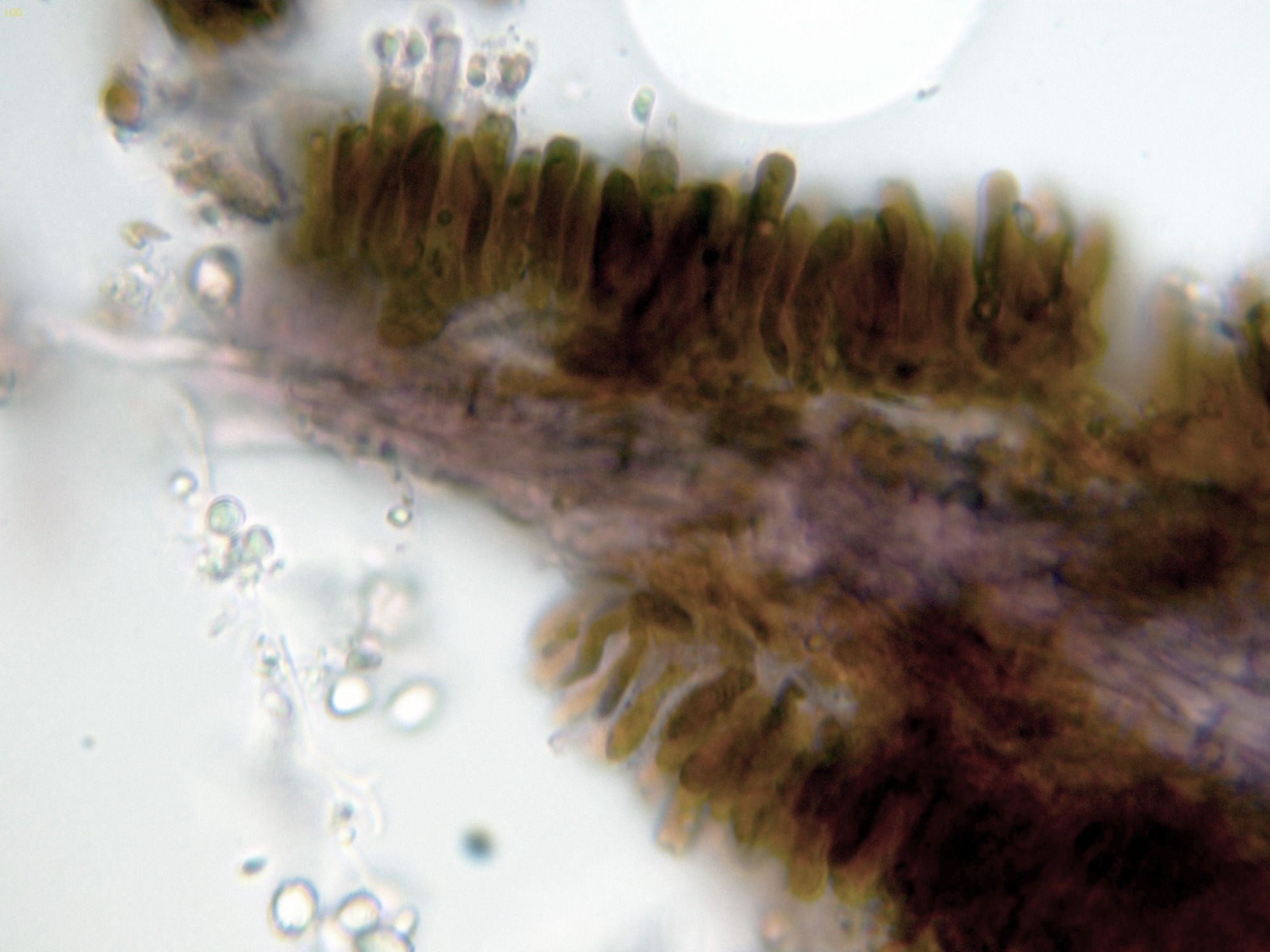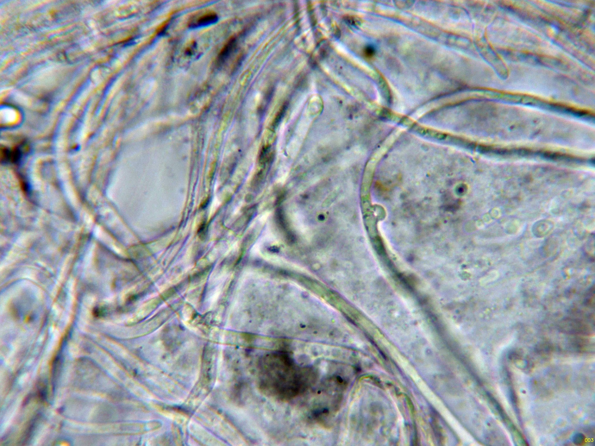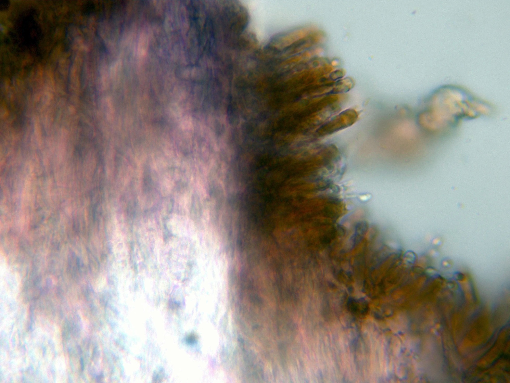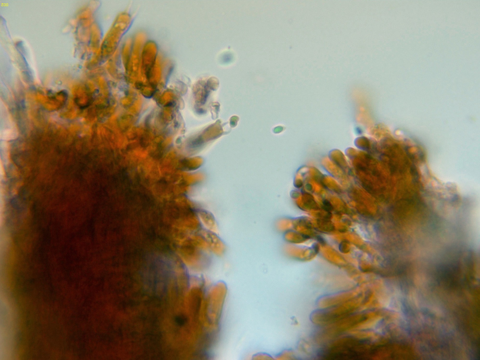 Observadas en la superficie del pileo unas hifas terminales emergentes con terminaciones redondeadas:
