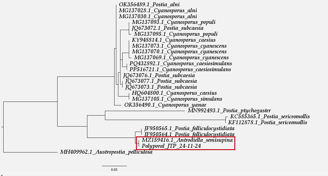 Y ya para terminar el árbol filogenético, donde se ve claramente ubicada dentro del Clado de lo que podemos considerar como Antrodiella semisupina, la secuencia del presente estudio es el Polyporal JTP_24-11-24.