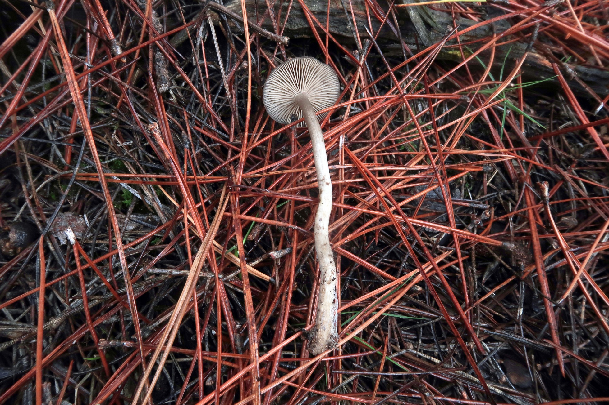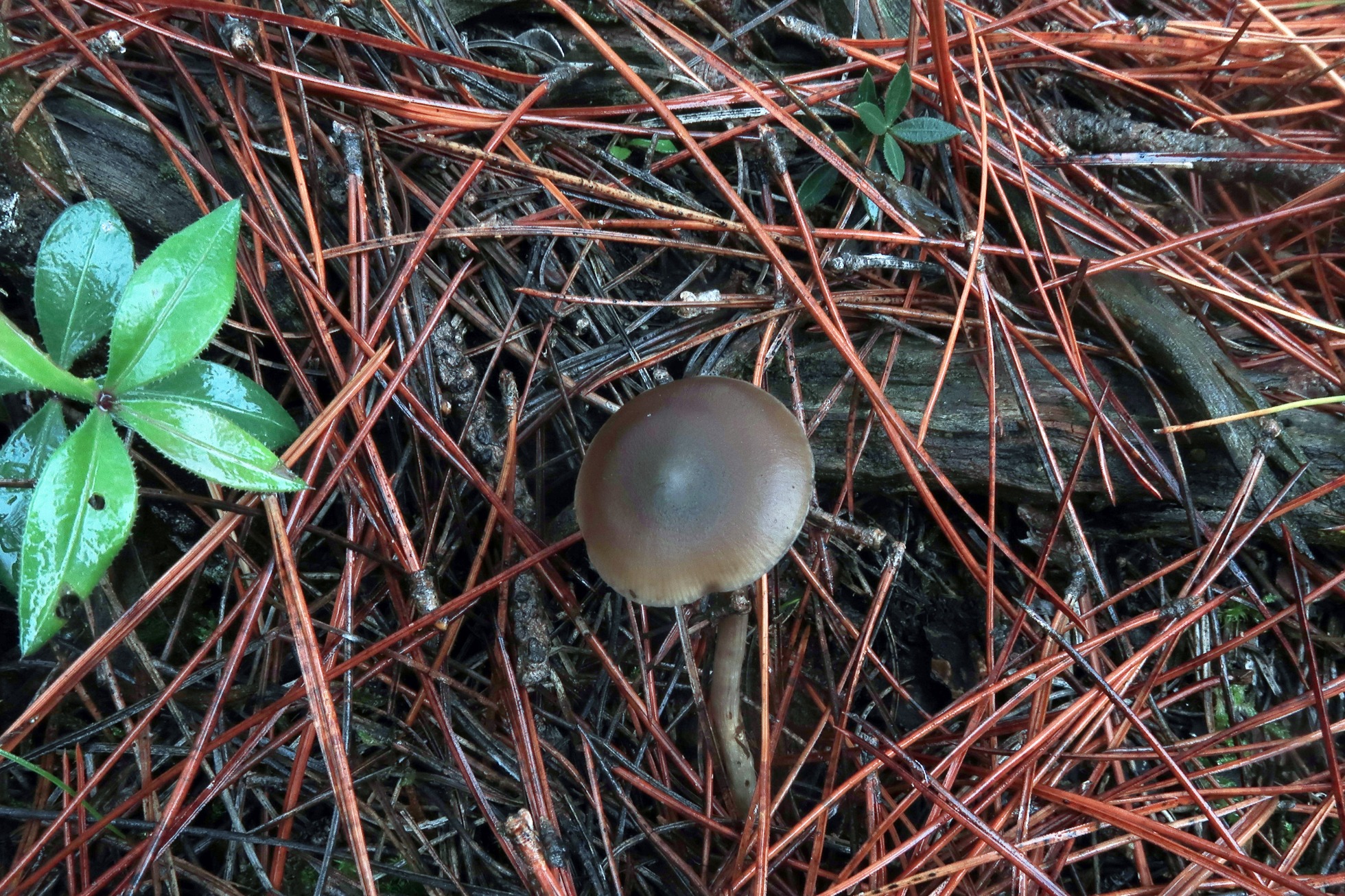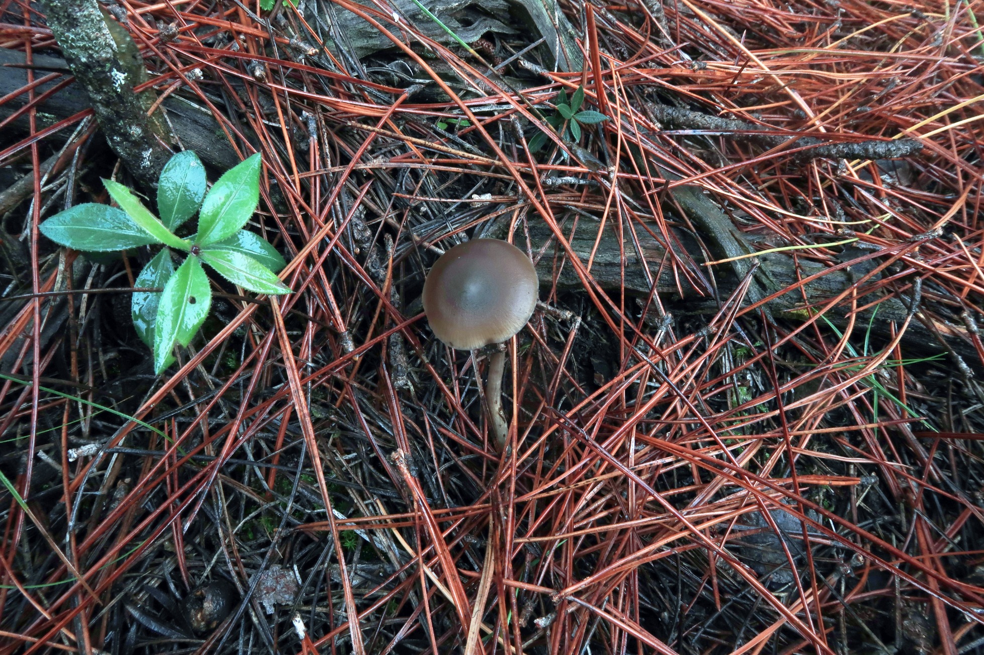 Un solo ejemplar brotando entre las acículas y los restos leñosos del suelo:
