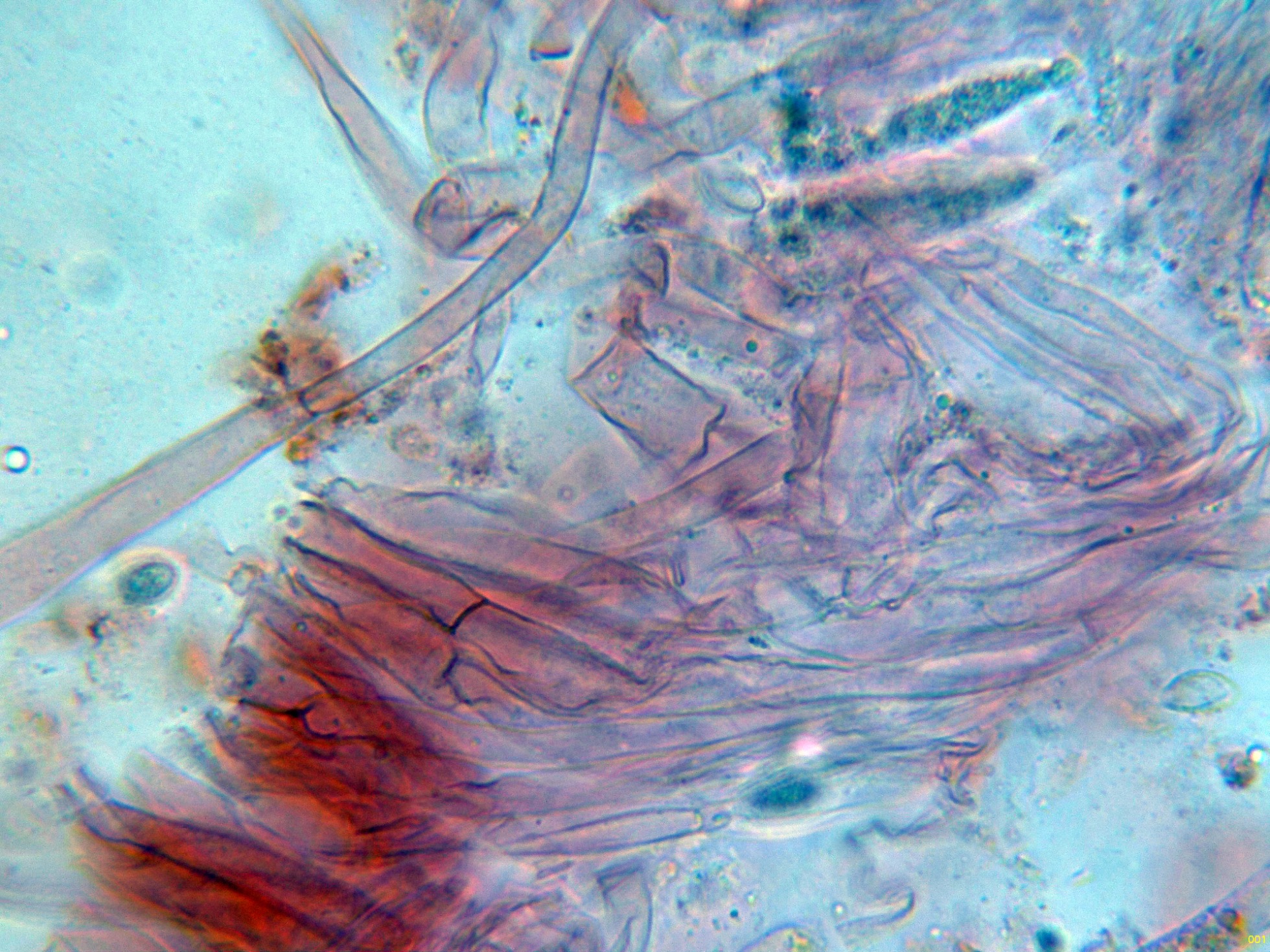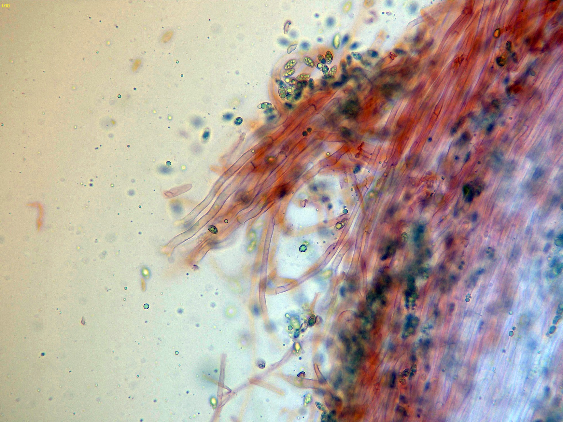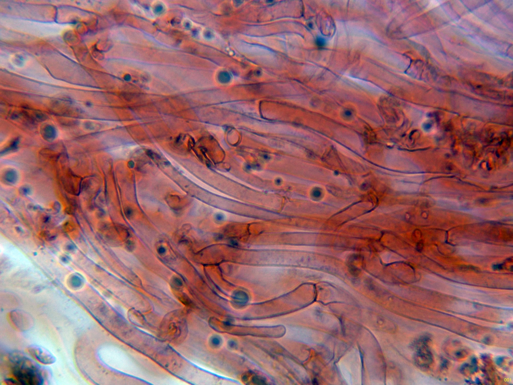 Las hifas del estípite en solución de Rojo Congo a 1000 aumentos:
