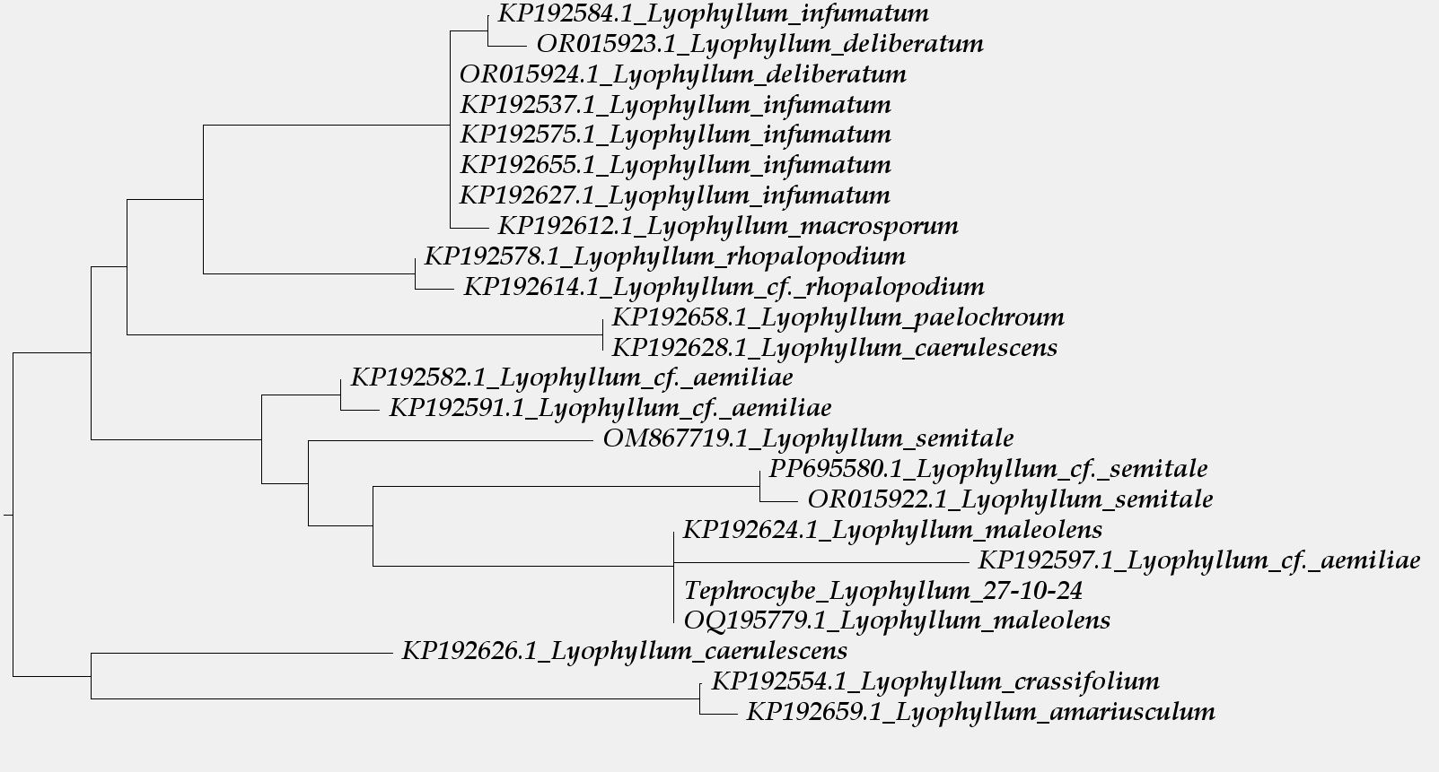 En este primer intento mi especie (Tephrocybe_Lyophyllum_27-10-24) aparece dentro del clado del Lyophyllum maleolens, aquí vemos que dentro del mismo clado aparece una secuencia del Lyophyllum cf. aemiliae, aunque muy separado a nivel molecular de los otros tres, es por lo que decido dar la vuelta al árbol filogenético, dejo el resultado:
