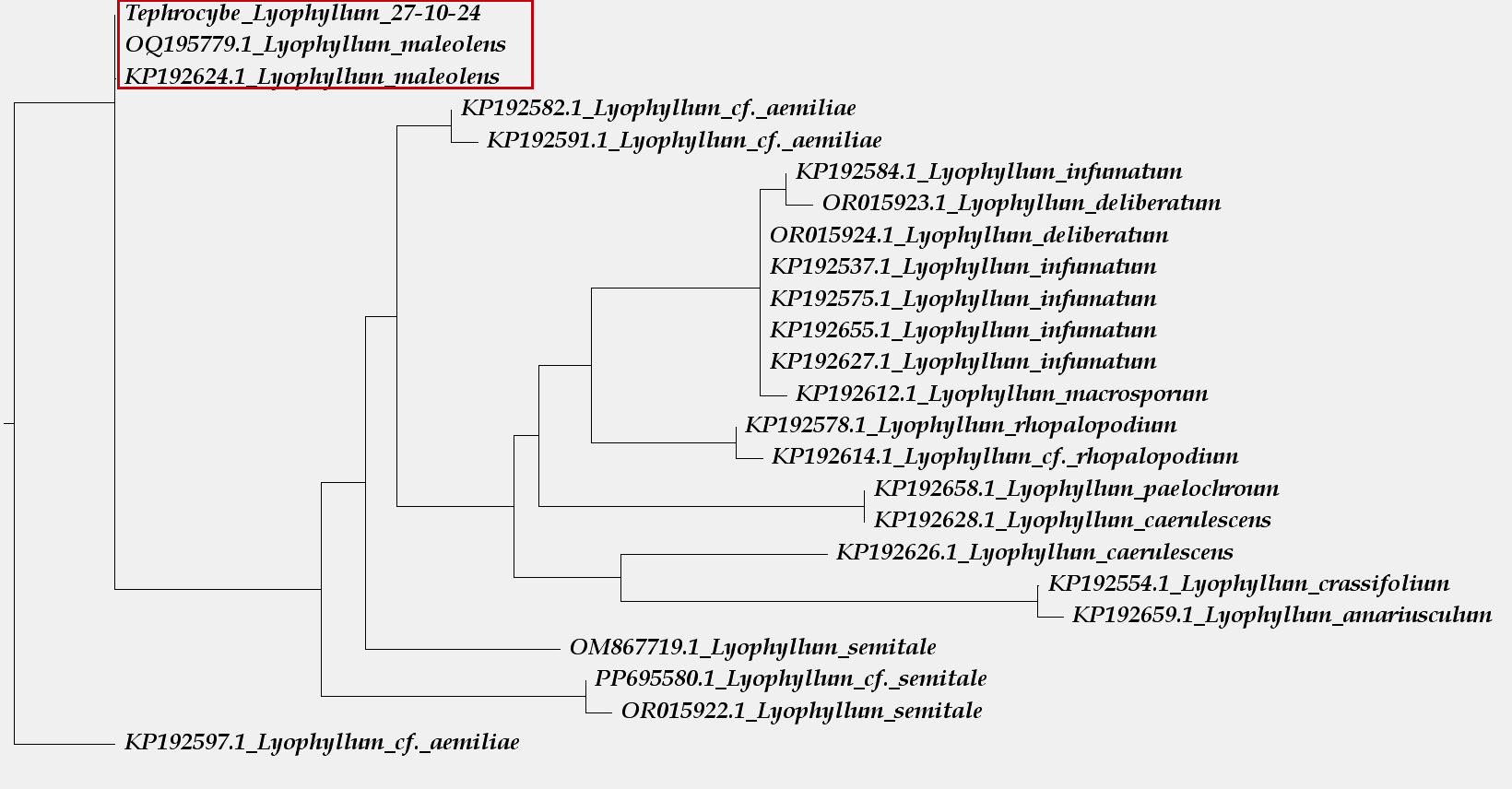 Observaciones: Aunque desde el minuto uno ya tenía muy claro que se trataba de un Lyophyllum / Tephrocybe, utilizando las Claves que suelo usar habitualmente ("Les Champignons de Suisse" y las de "Funga Nordica") no pude encontrar ninguno que se ajustara a los parámetros de este estudio, ya que el Lyophyllum maleolens no aparece en ninguna de las dos Claves, es por lo que mandé las muestras para análisis molecular, la extracción del ADN salió limpia y la secuenciación del gen ITS determinó que se trataba con una coincidencia tanto por cobertura como por identidad del 100%, de Lyophyllum maleolens, añado el árbol filogenético: