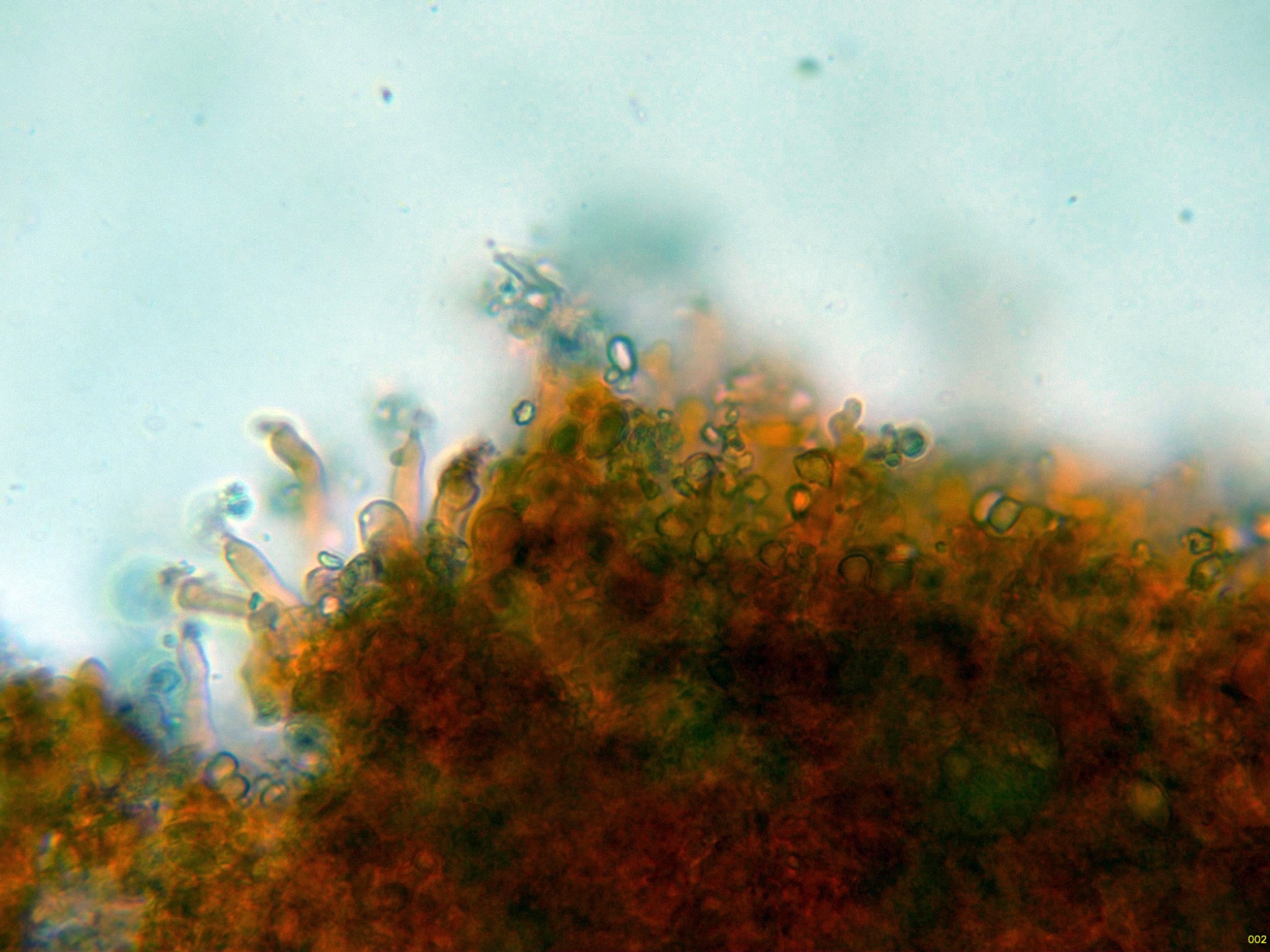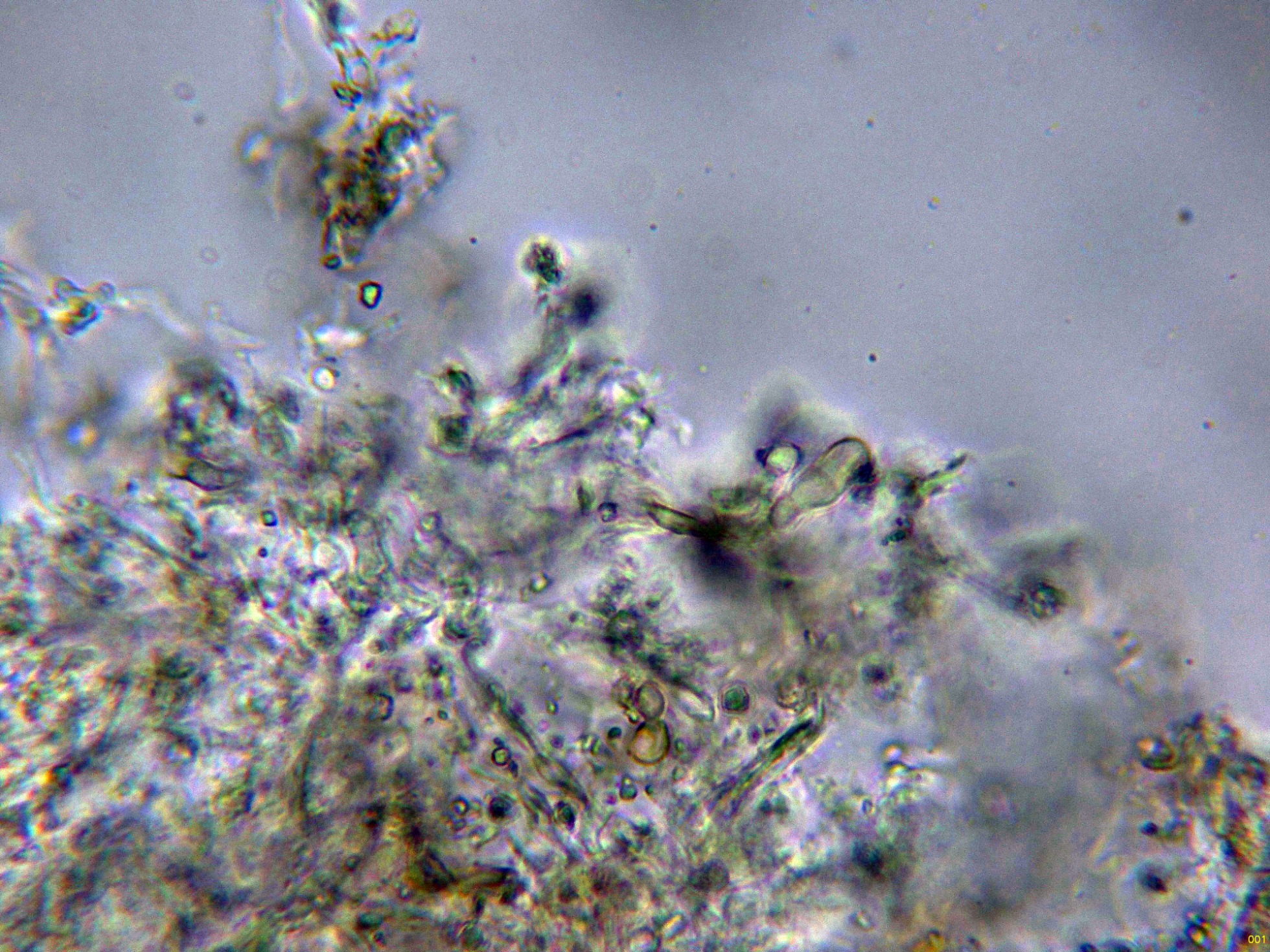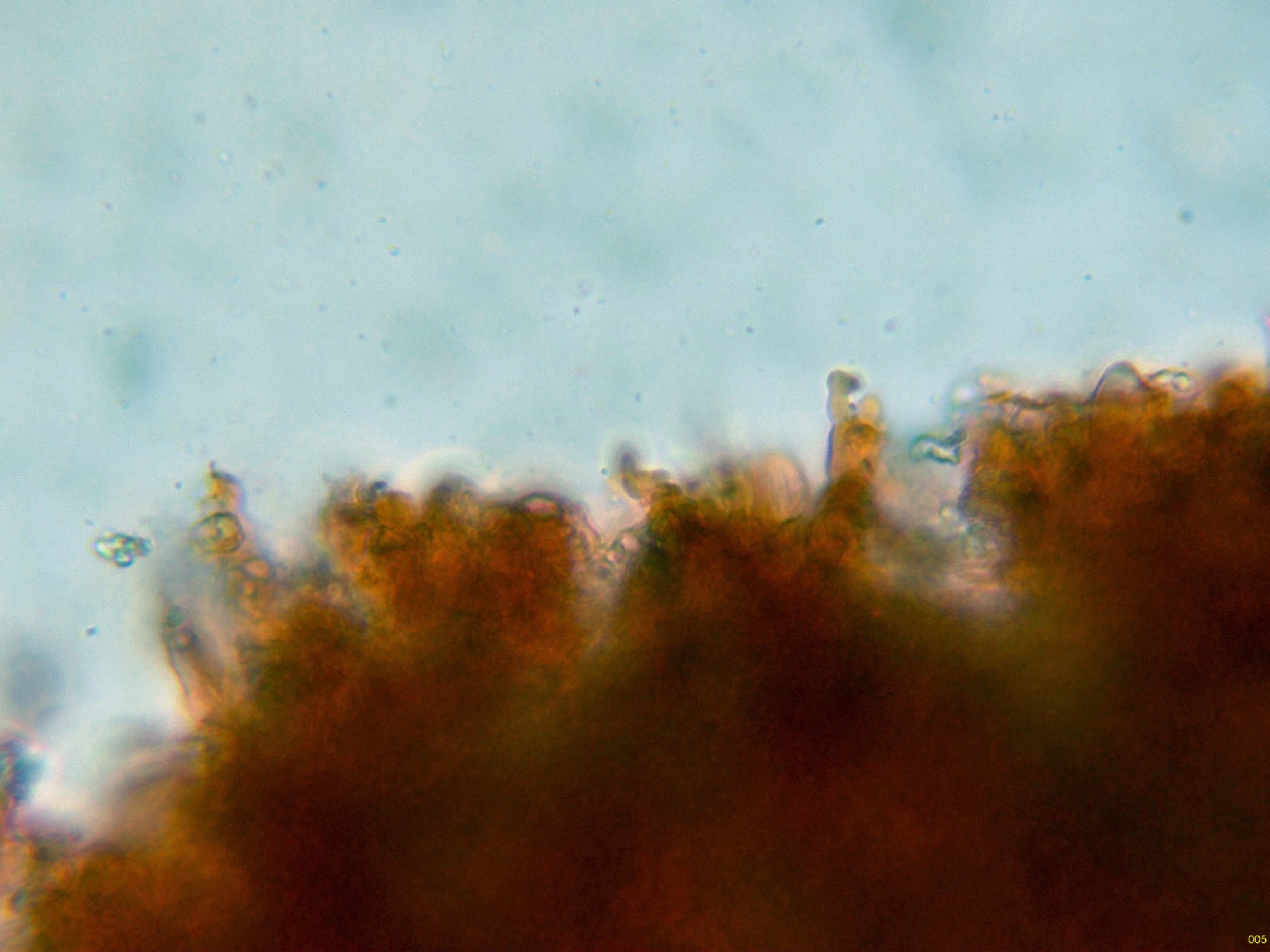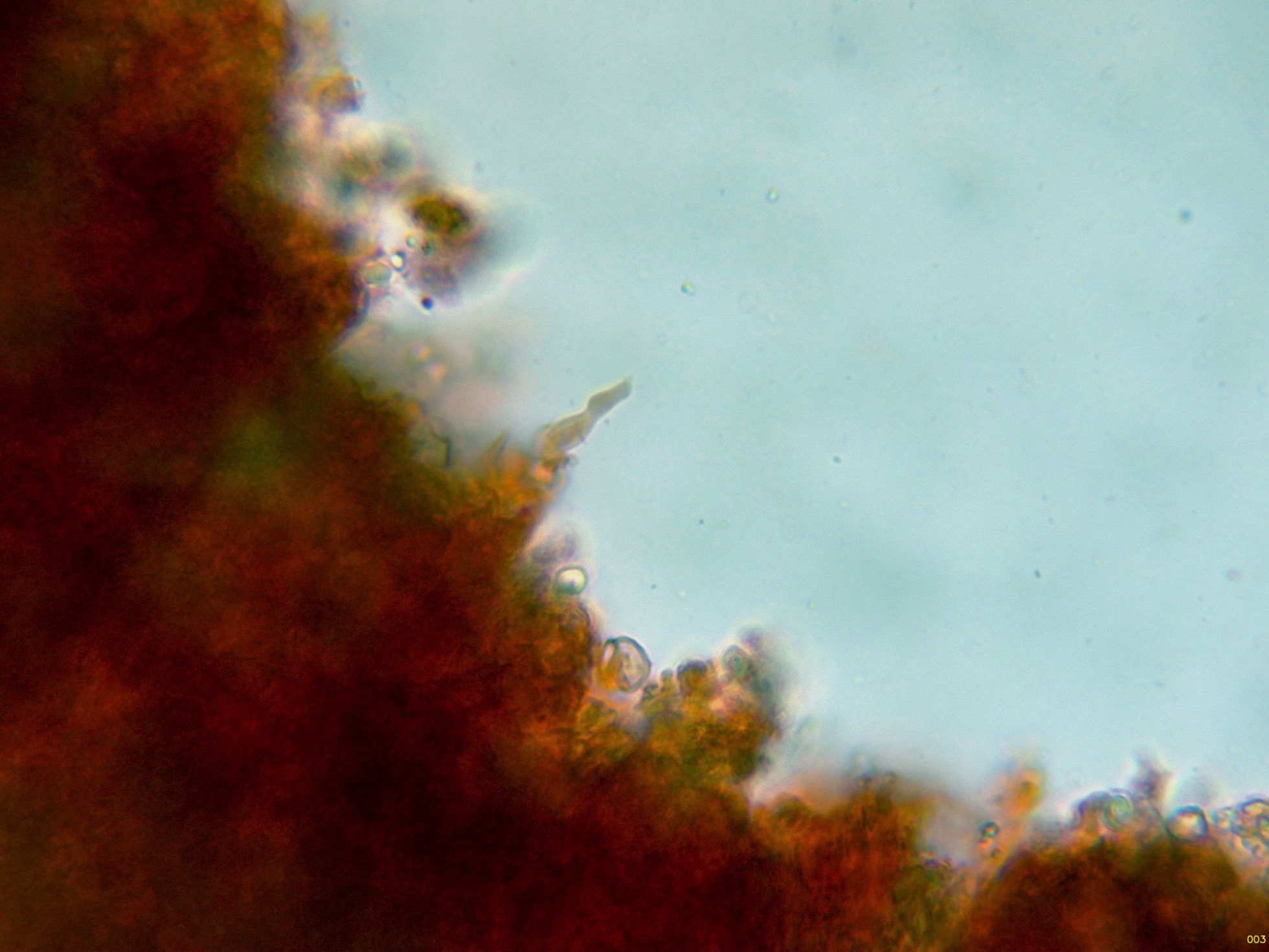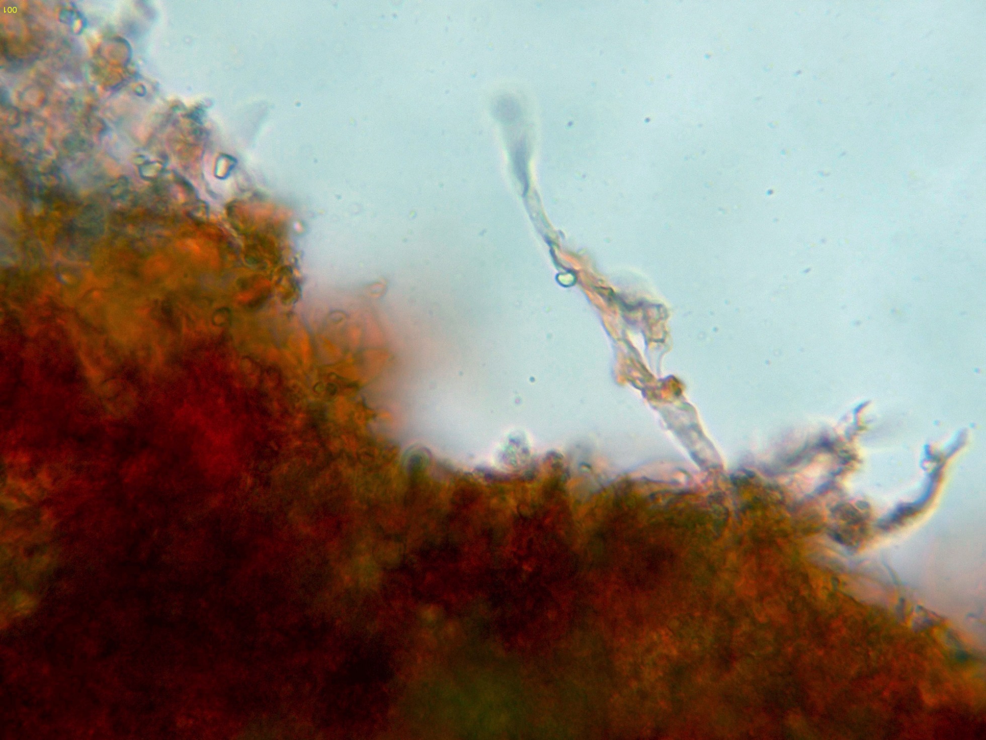 En el himenio algunos elementos dispersos a modo de cistidios, cilíndricos y sinuosos, algunos de ellos ligeramente capitados: