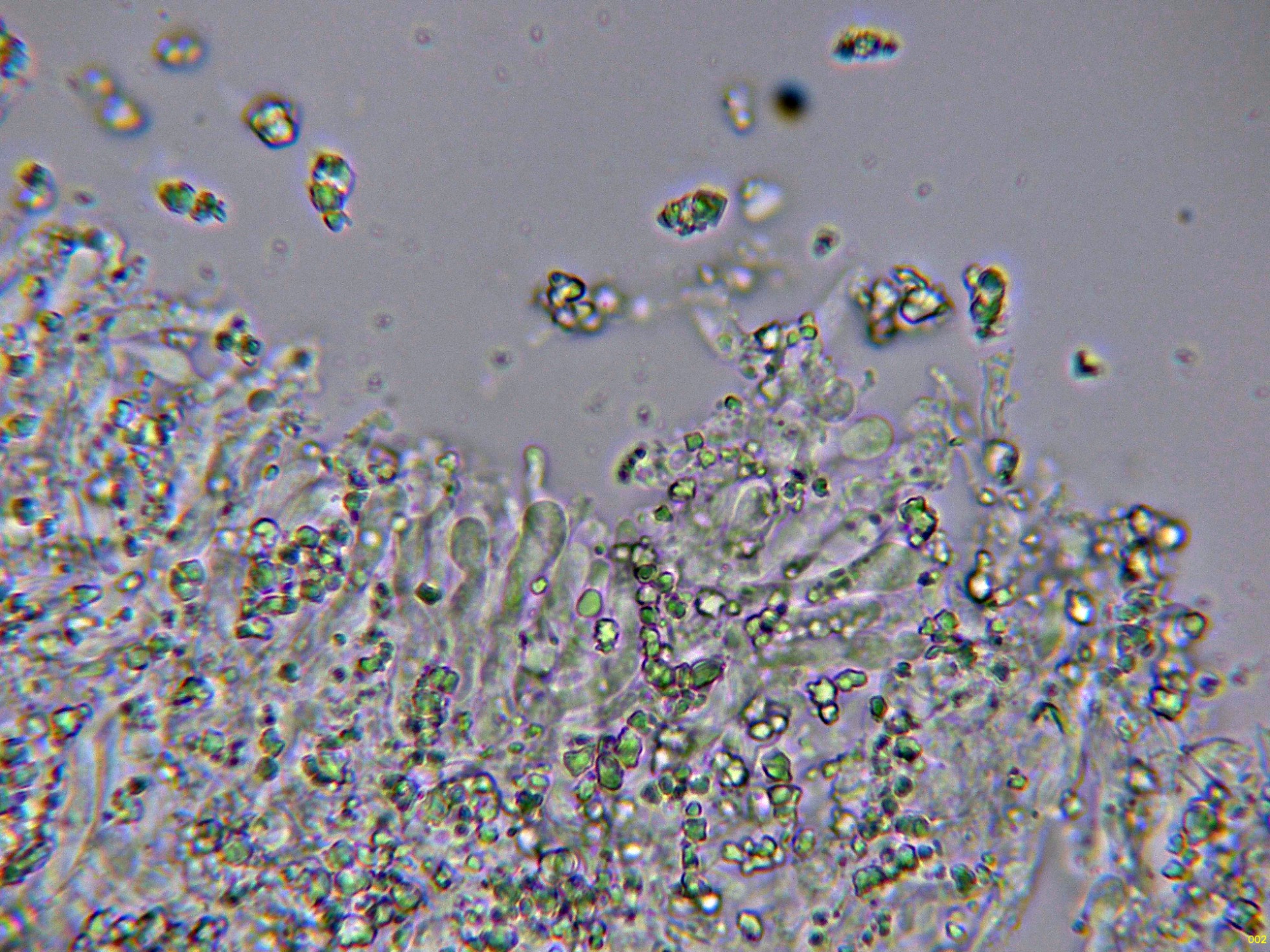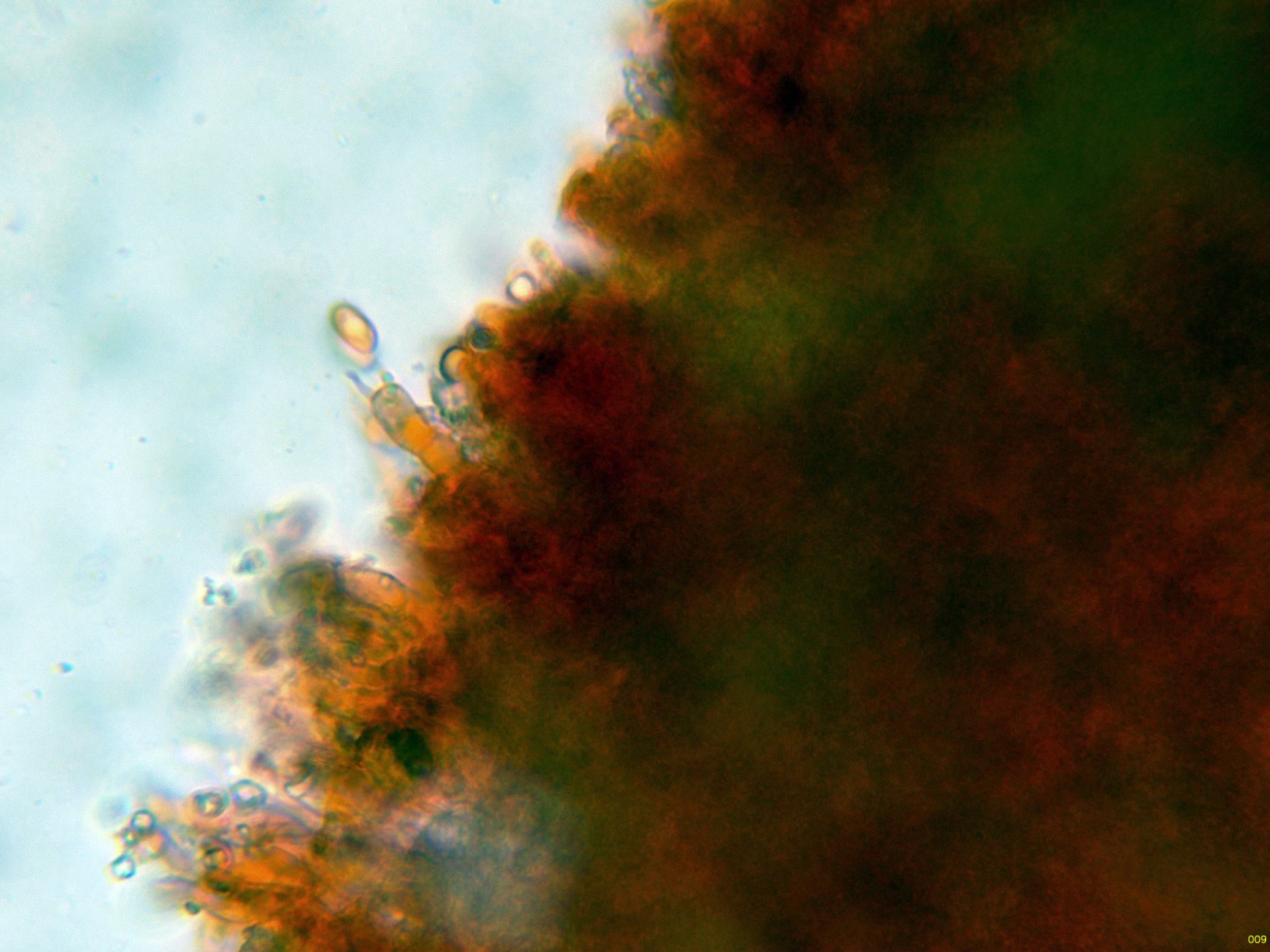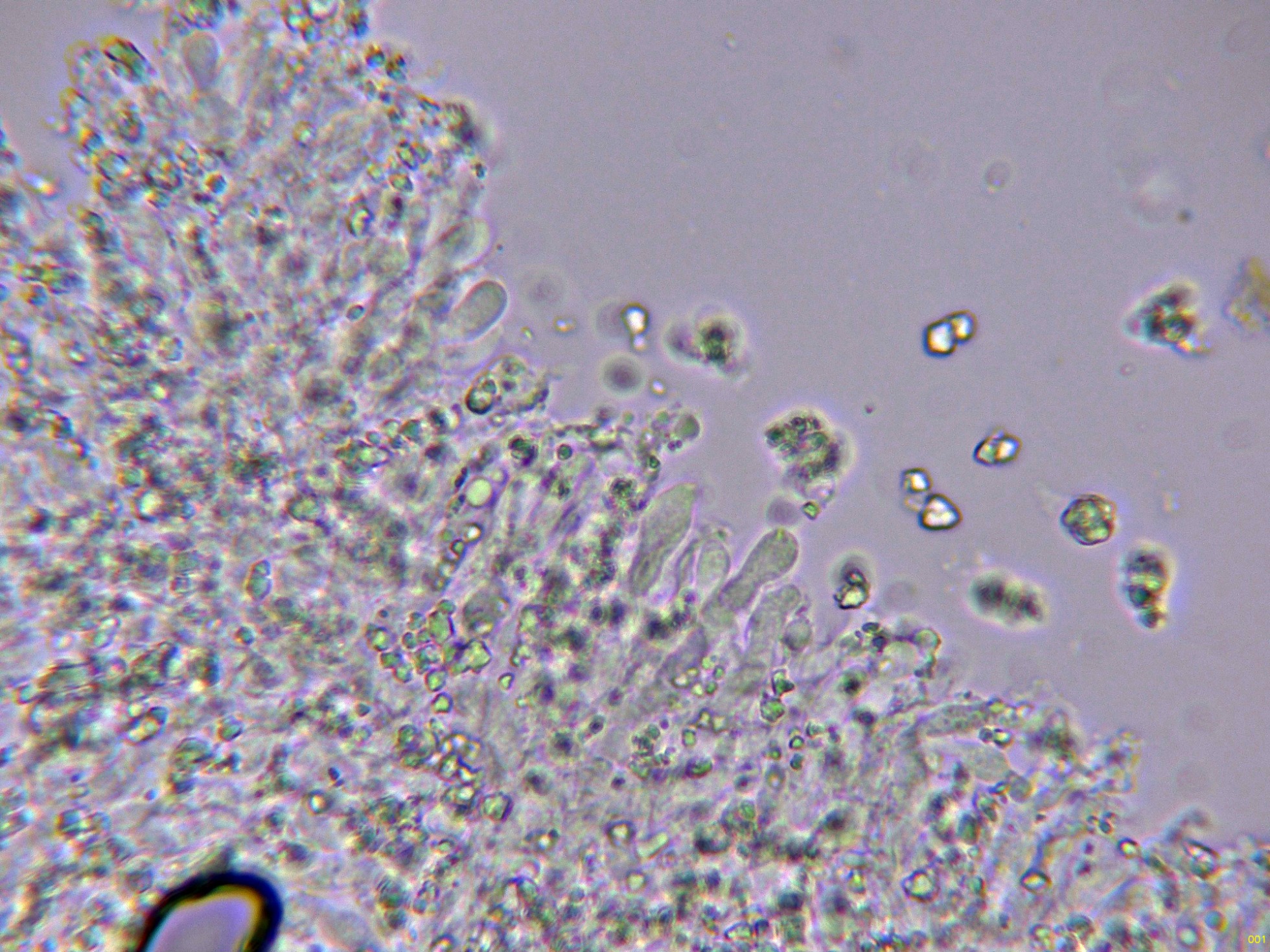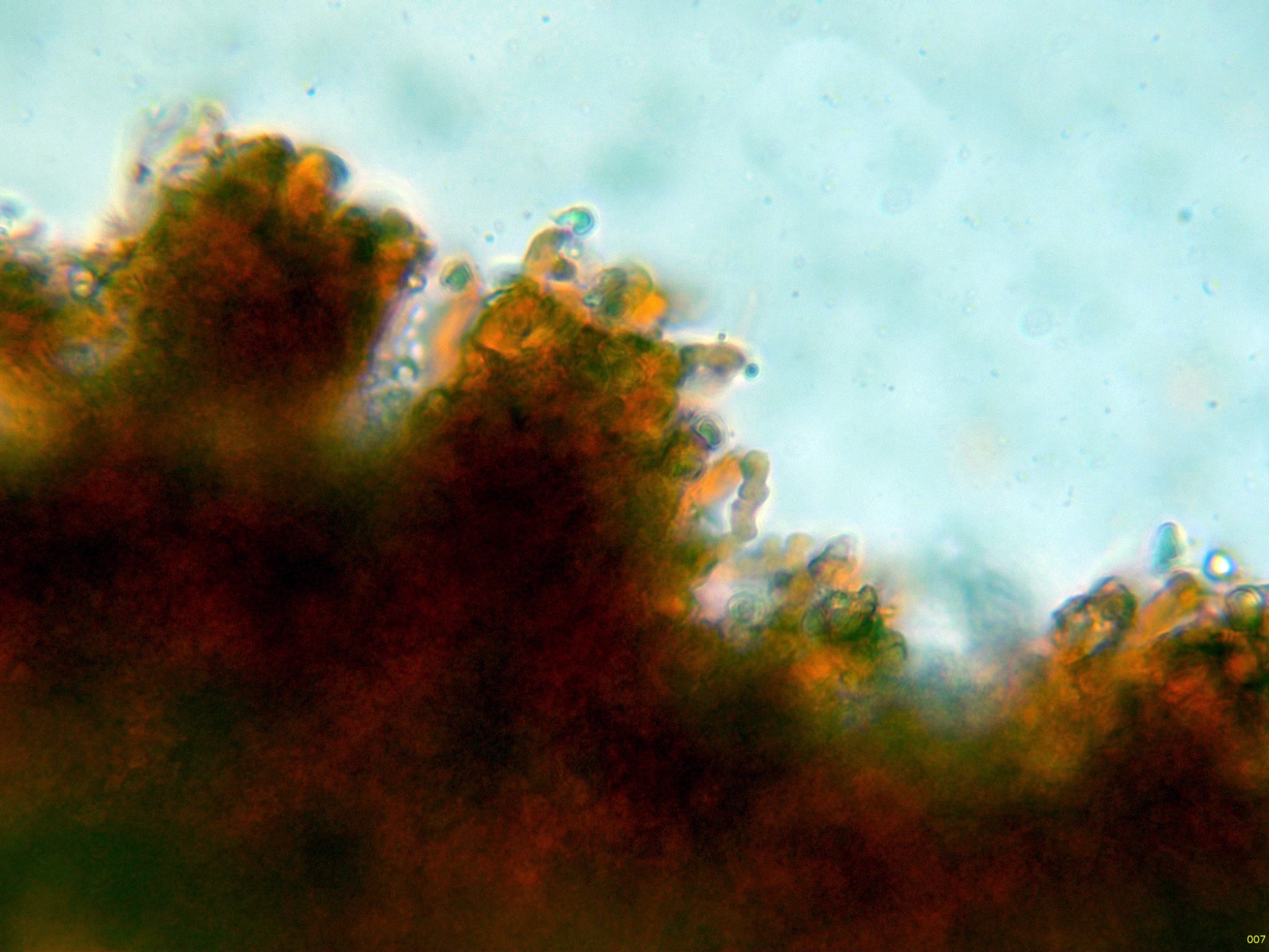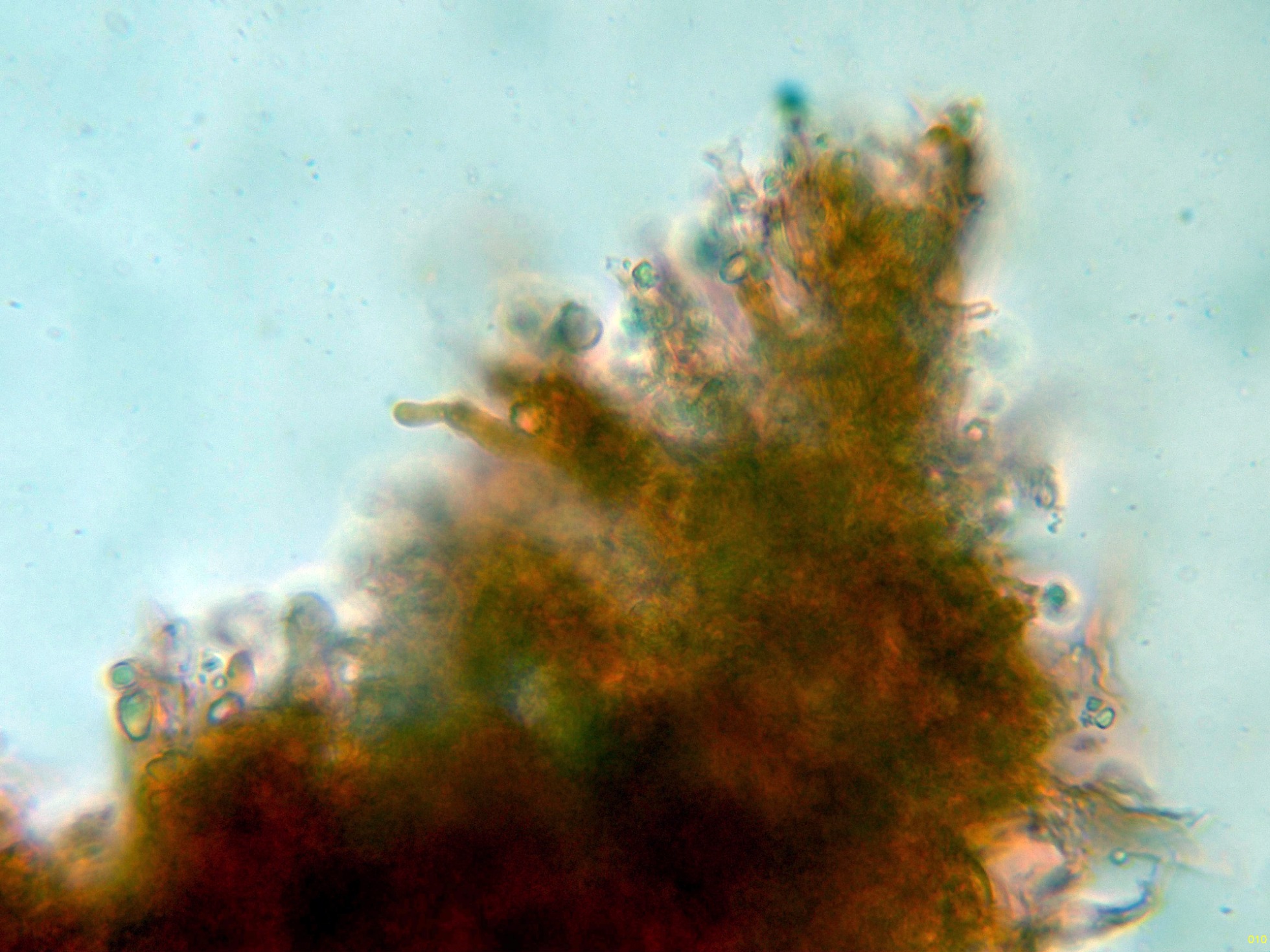 En el himenio algunos elementos dispersos a modo de cistidios, cilíndricos y sinuosos, algunos de ellos ligeramente capitados: