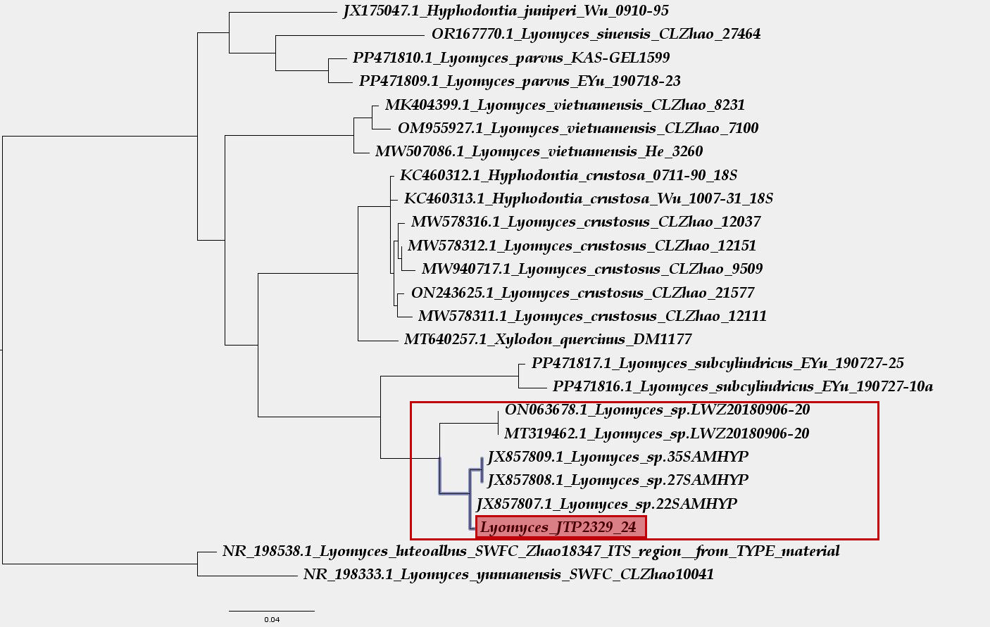 Se puede ver claramente que mi propuesta encaja muy bien dentro del Clado de lo que podemos considerar como Lyomyces sp., es decir de un Lyomyces que a día de hoy no tiene apellido, aunque bastante cercano molecularmente al Lyomyce subcylindricus.