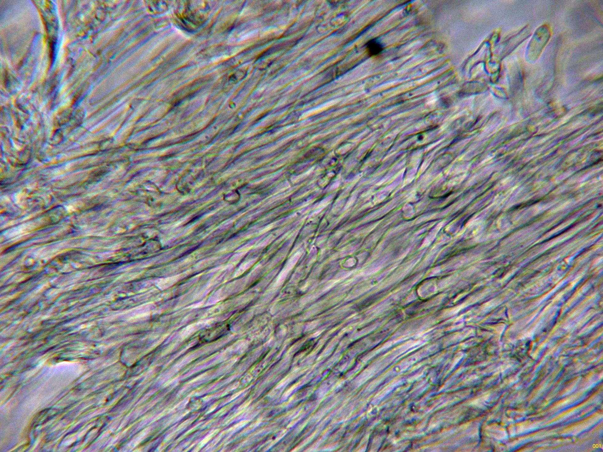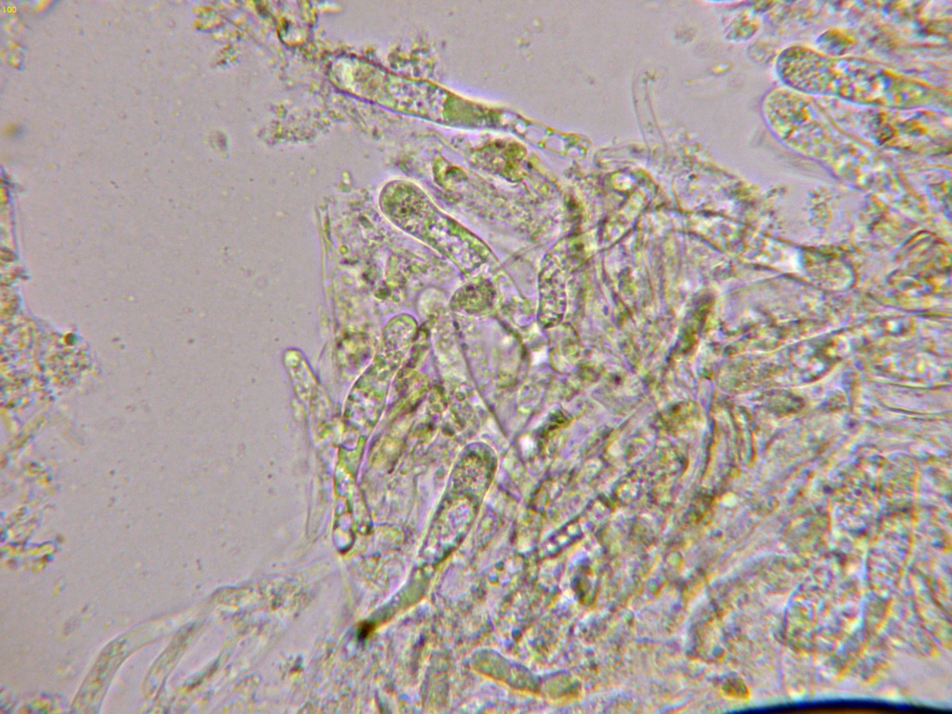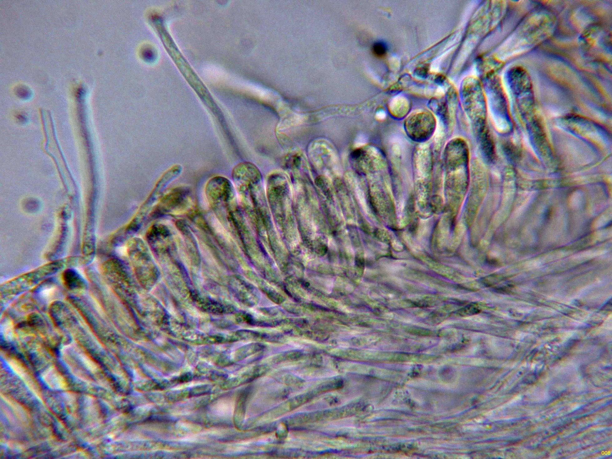 A falta de esporas, para su correcta identificación opté por los datos moleculares, y aunque la secuenciación resultó parcialmente ruidosa, los datos del gen ITS apuntan claramente a la Hydnocristella himantia KY769580.1.