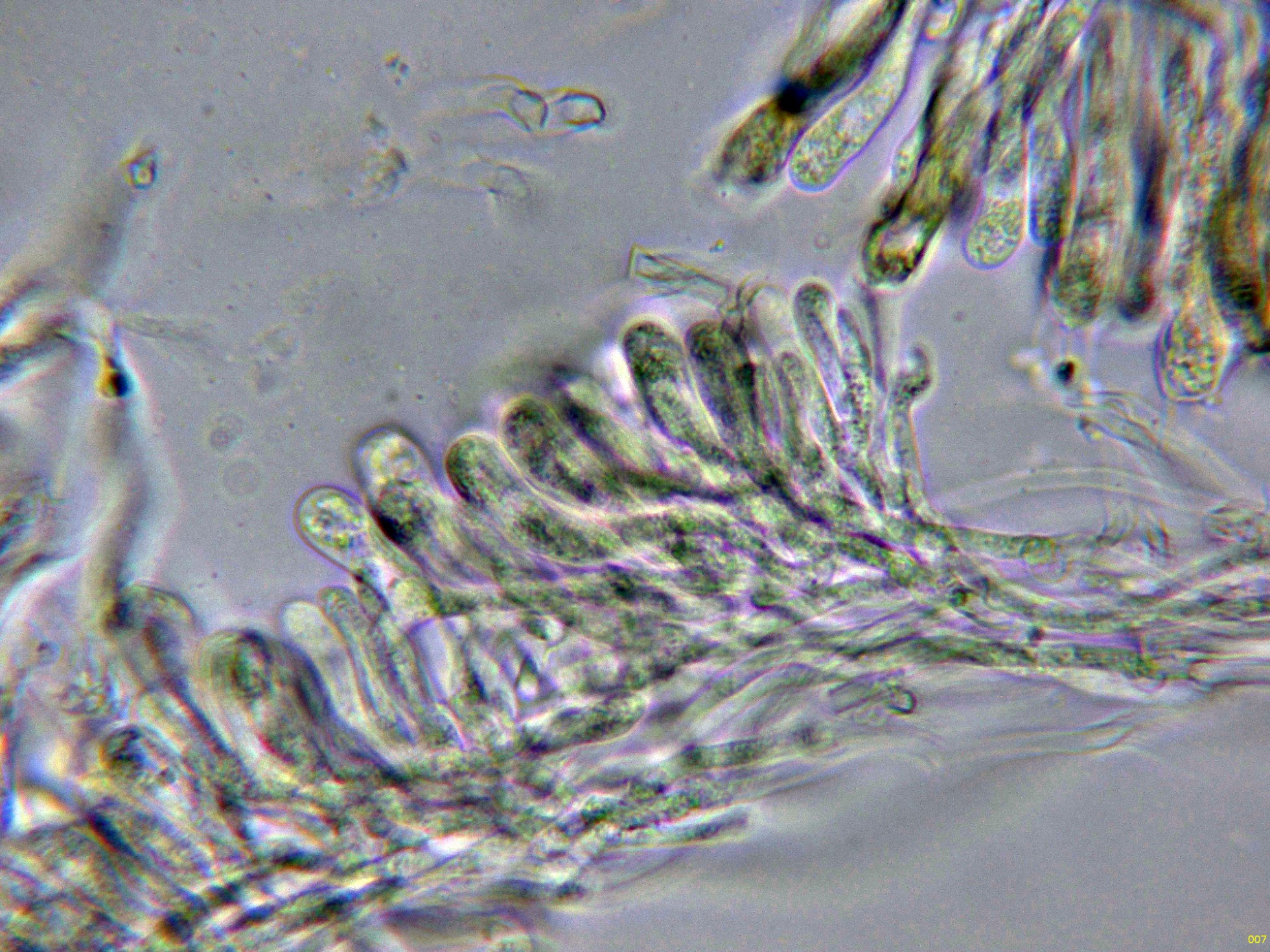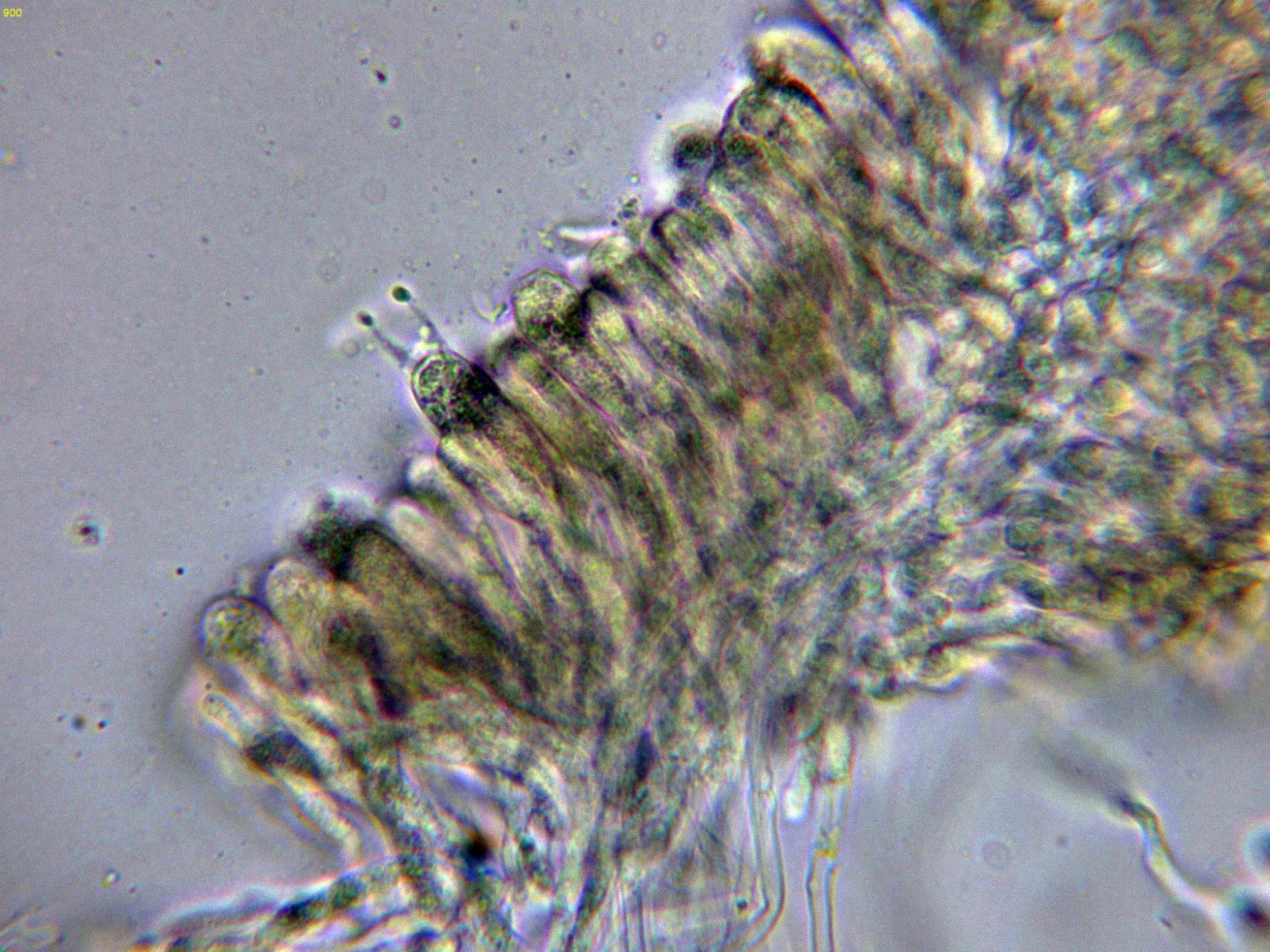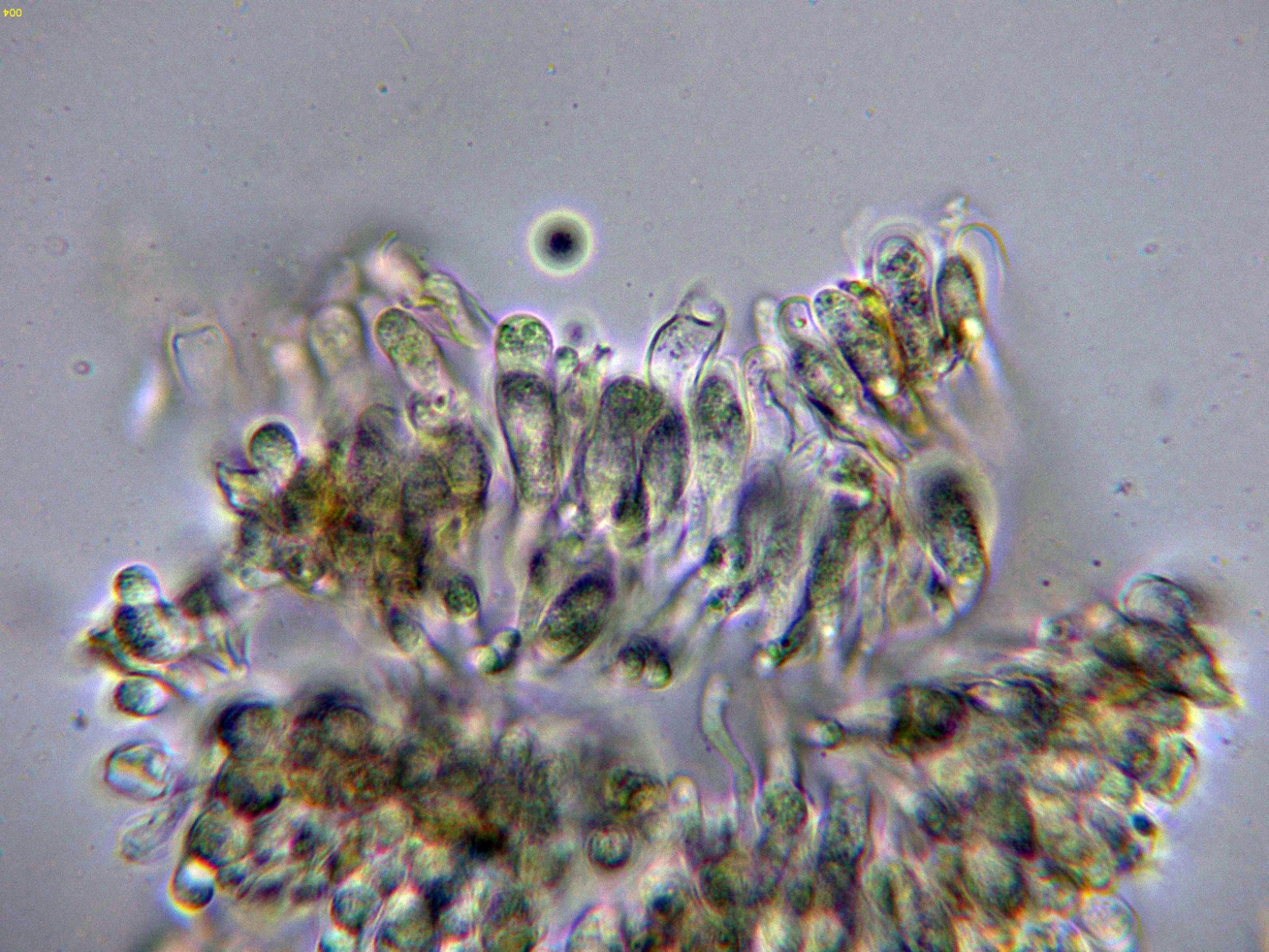 A falta de esporas, para su correcta identificación opté por los datos moleculares, y aunque la secuenciación resultó parcialmente ruidosa, los datos del gen ITS apuntan claramente a la Hydnocristella himantia KY769580.1.