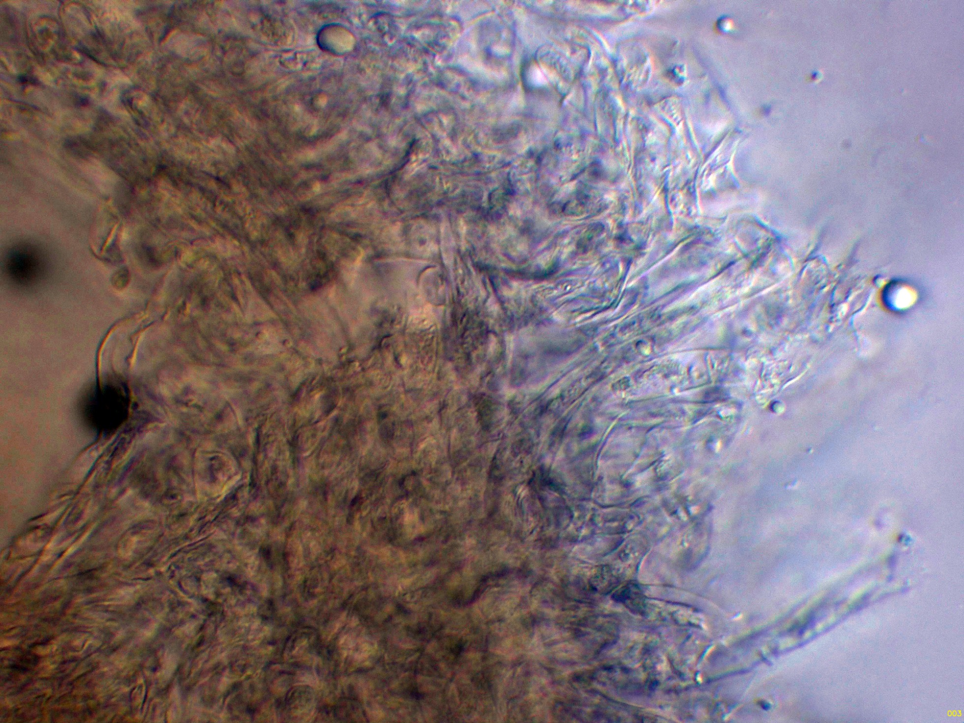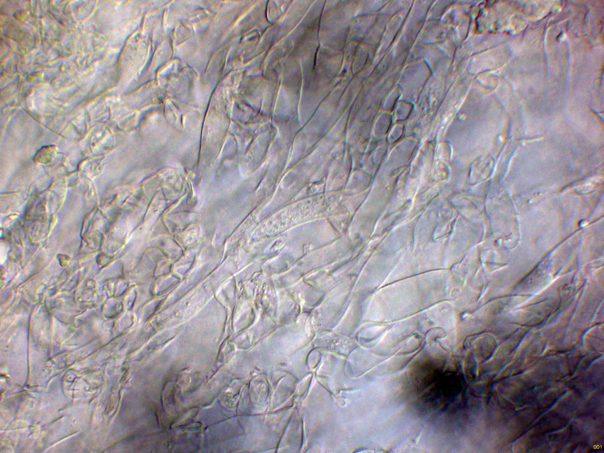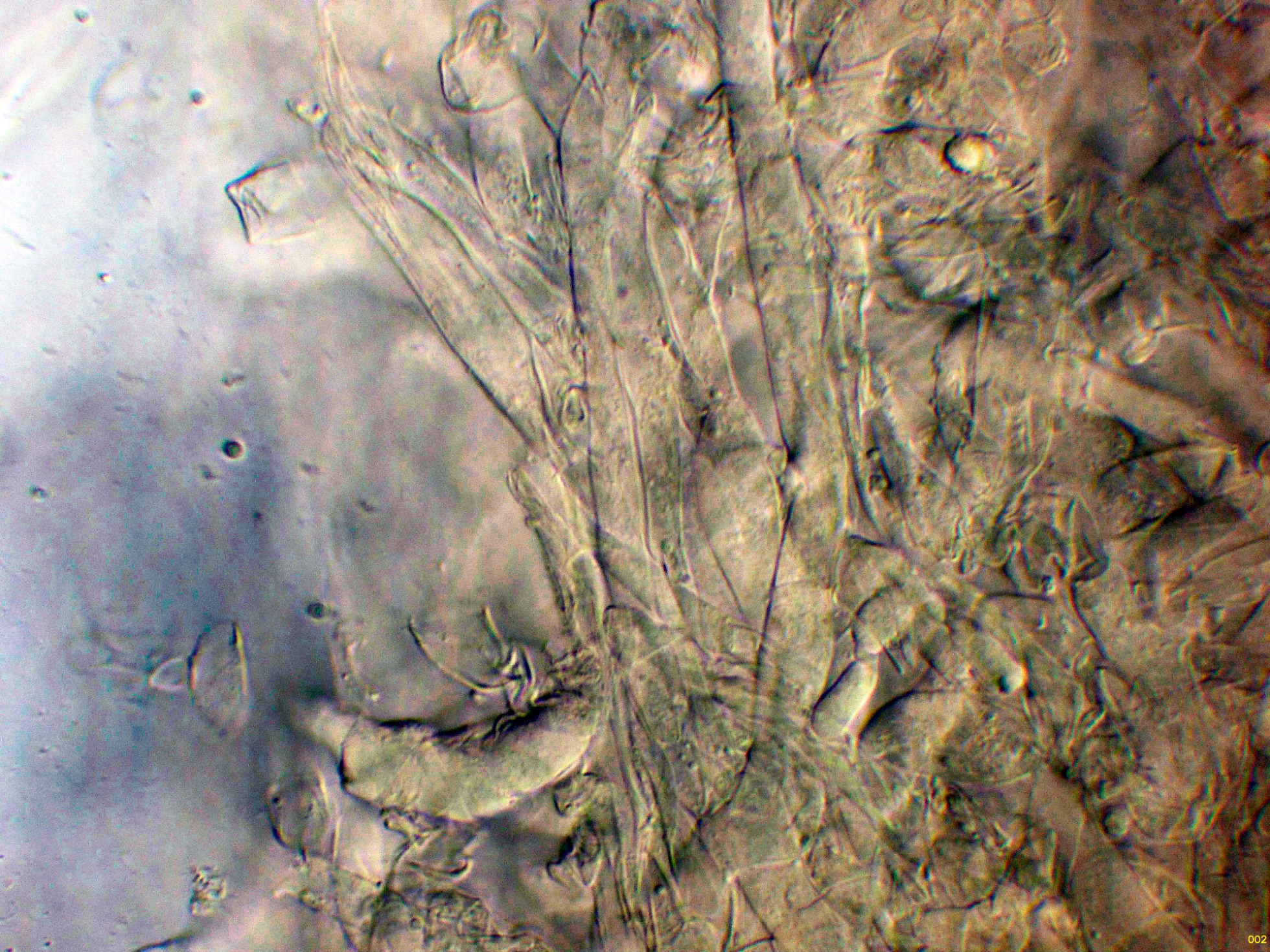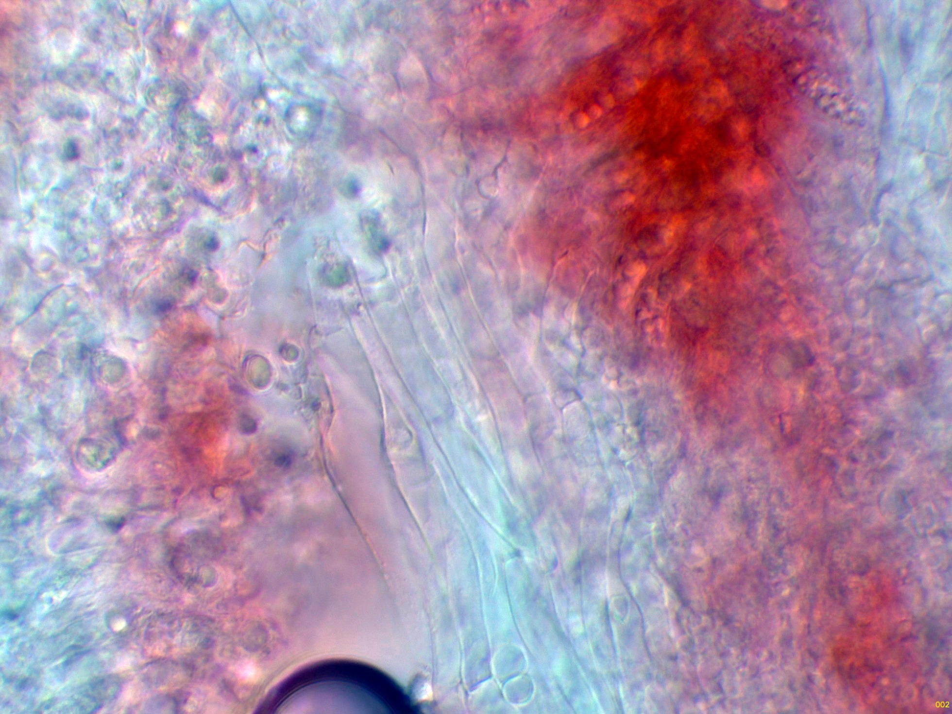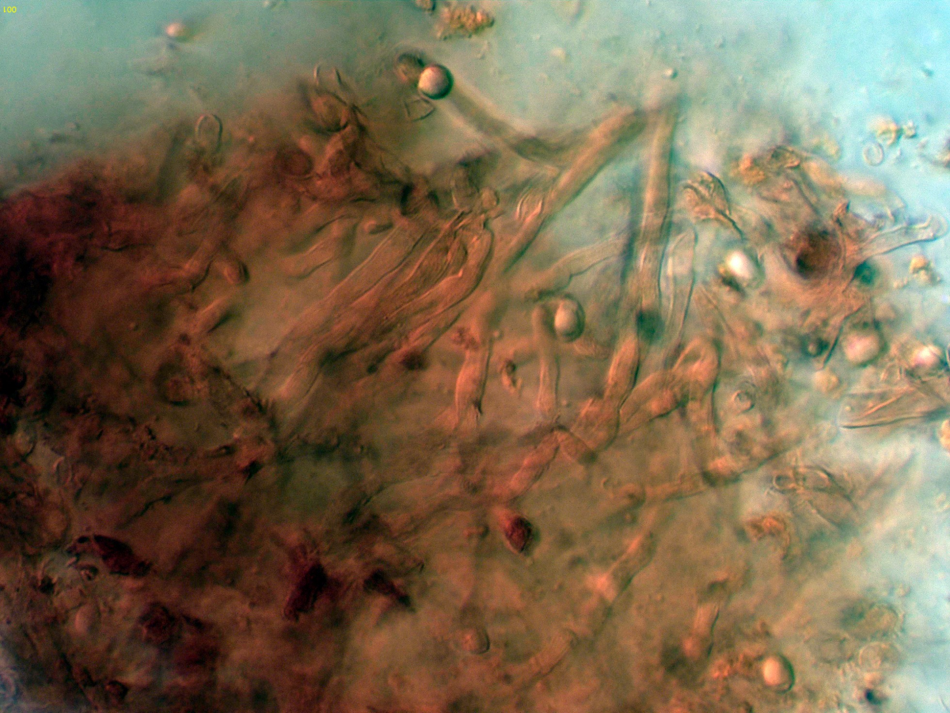 Las hifas de la suprapellis filamentosa, con pigmento intracelular ocráceo y algunas fíbulas dispersas.