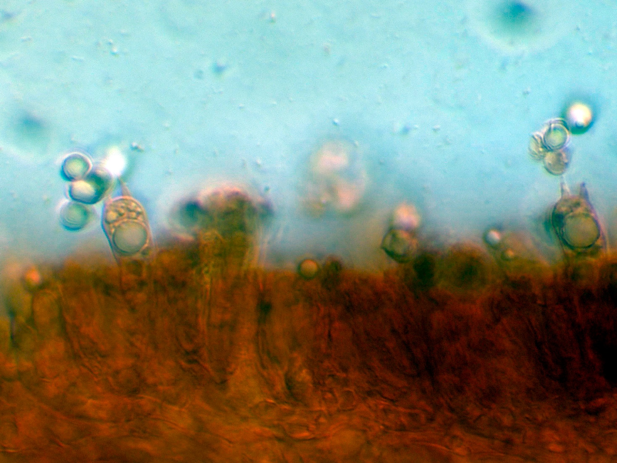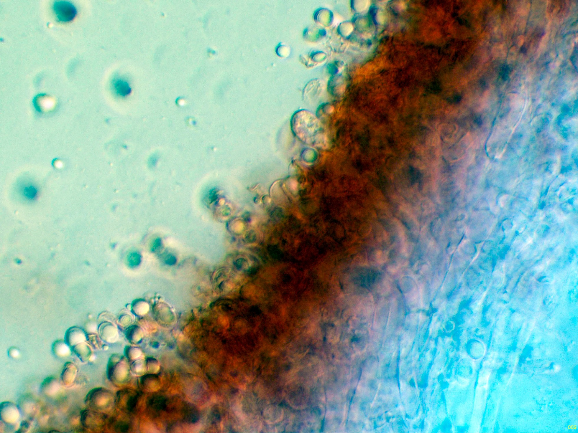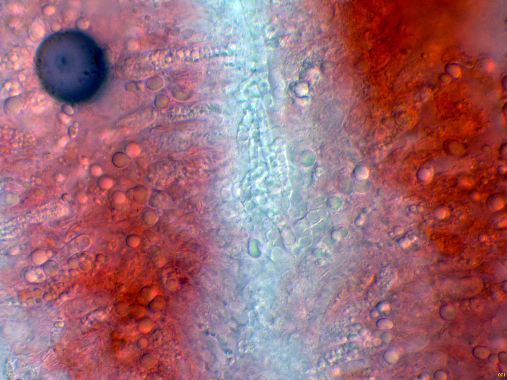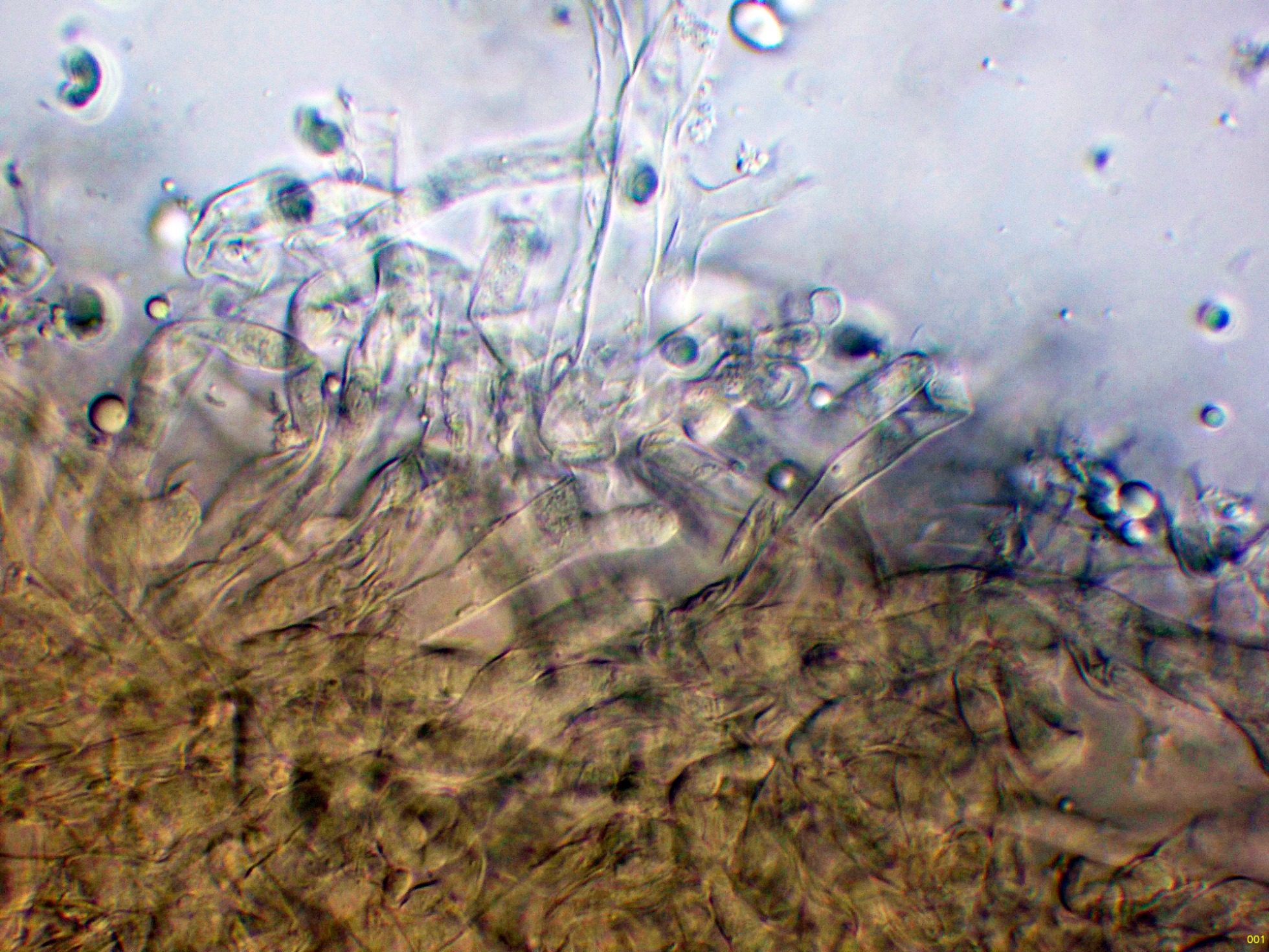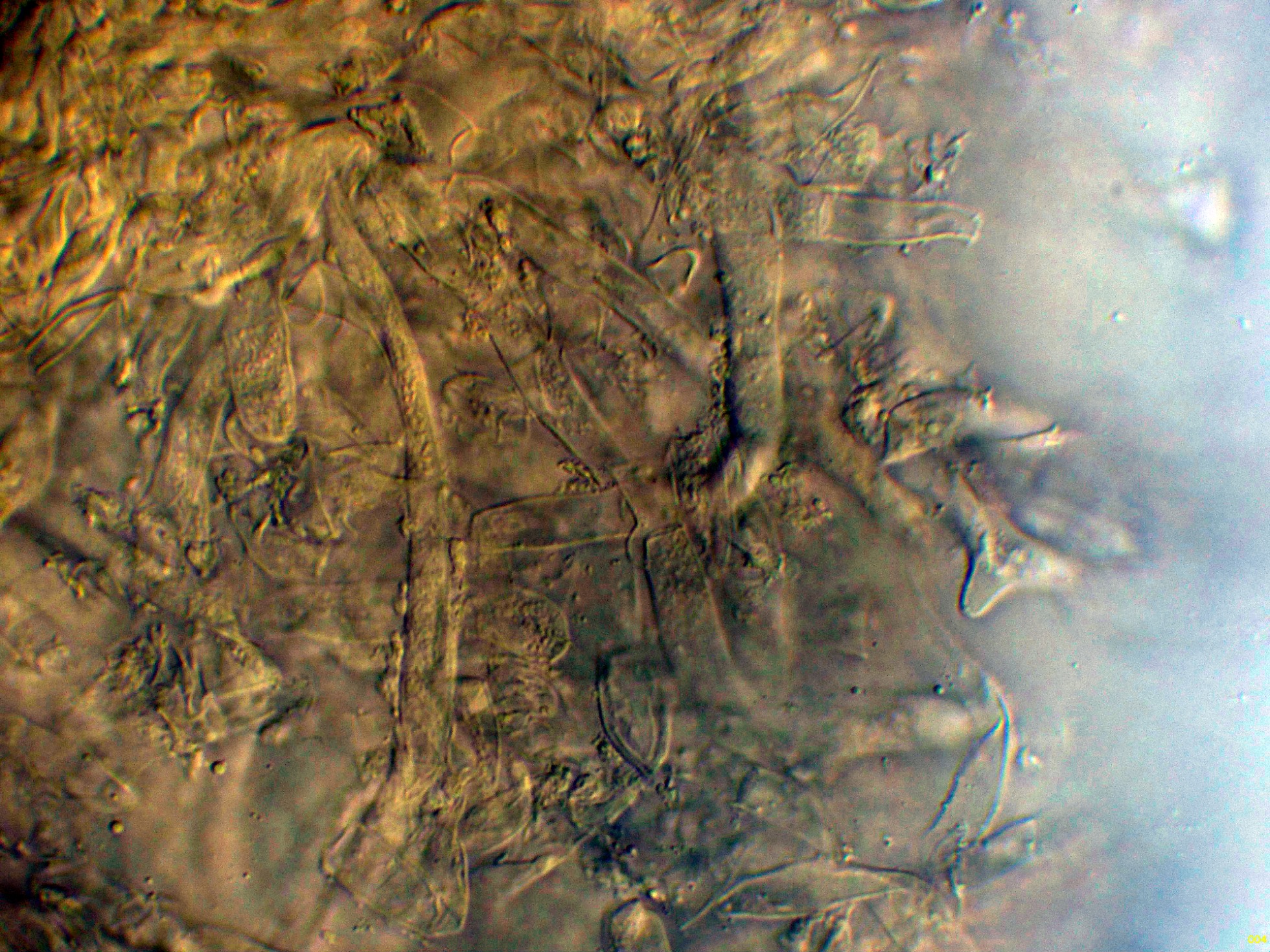 Las hifas de la suprapellis filamentosa, con pigmento intracelular ocráceo y algunas fíbulas dispersas.
