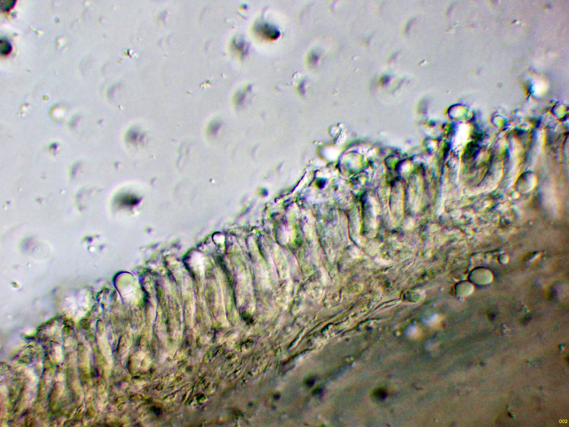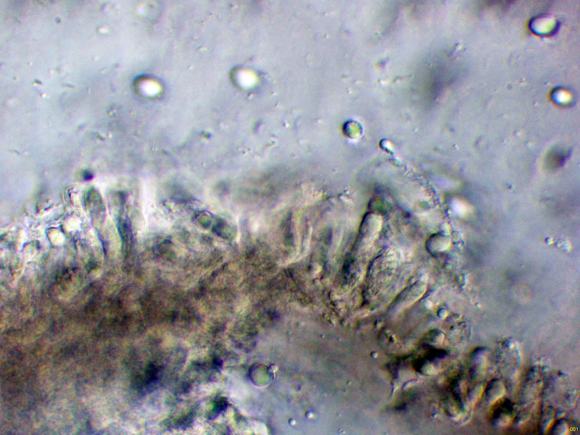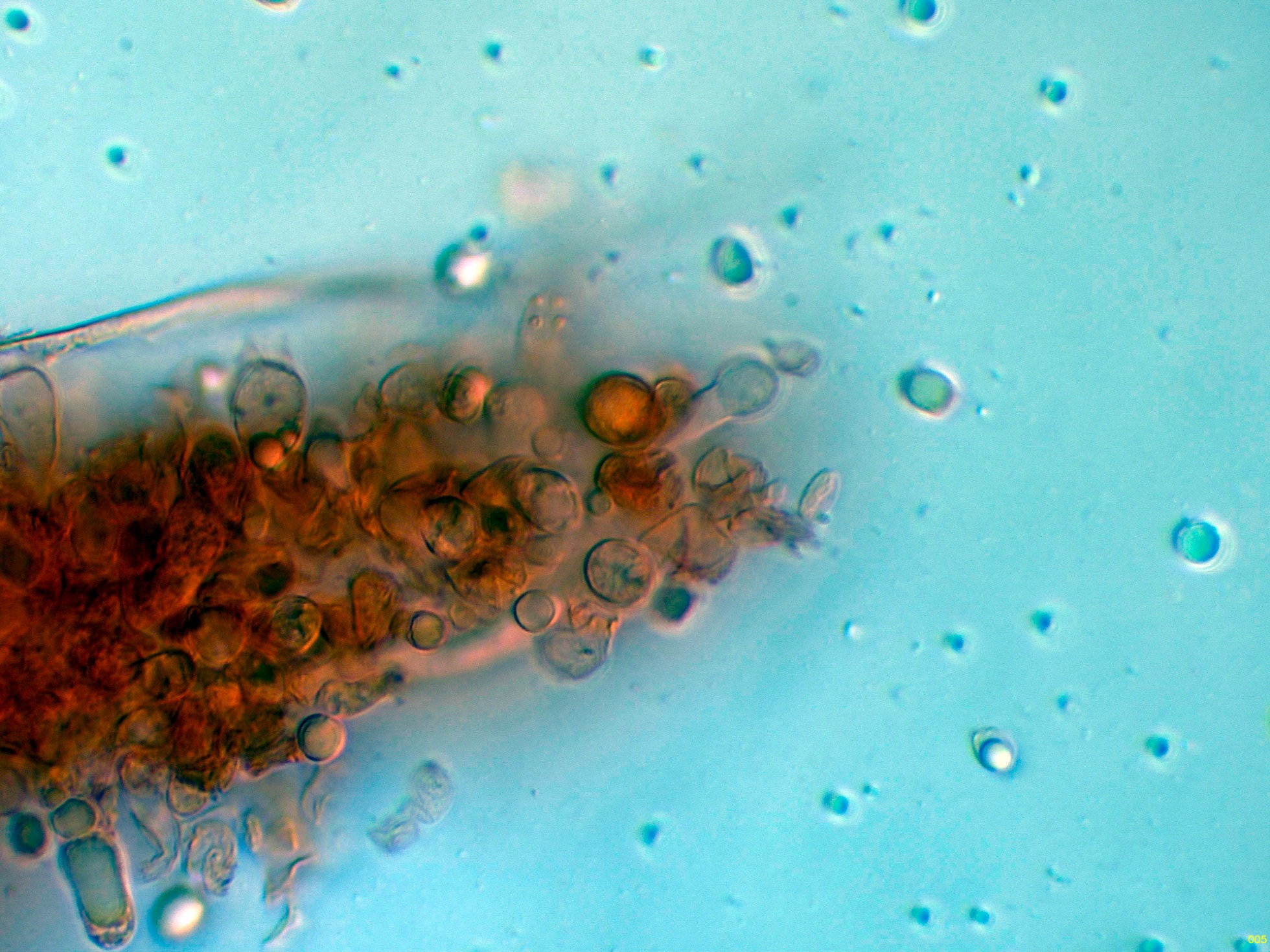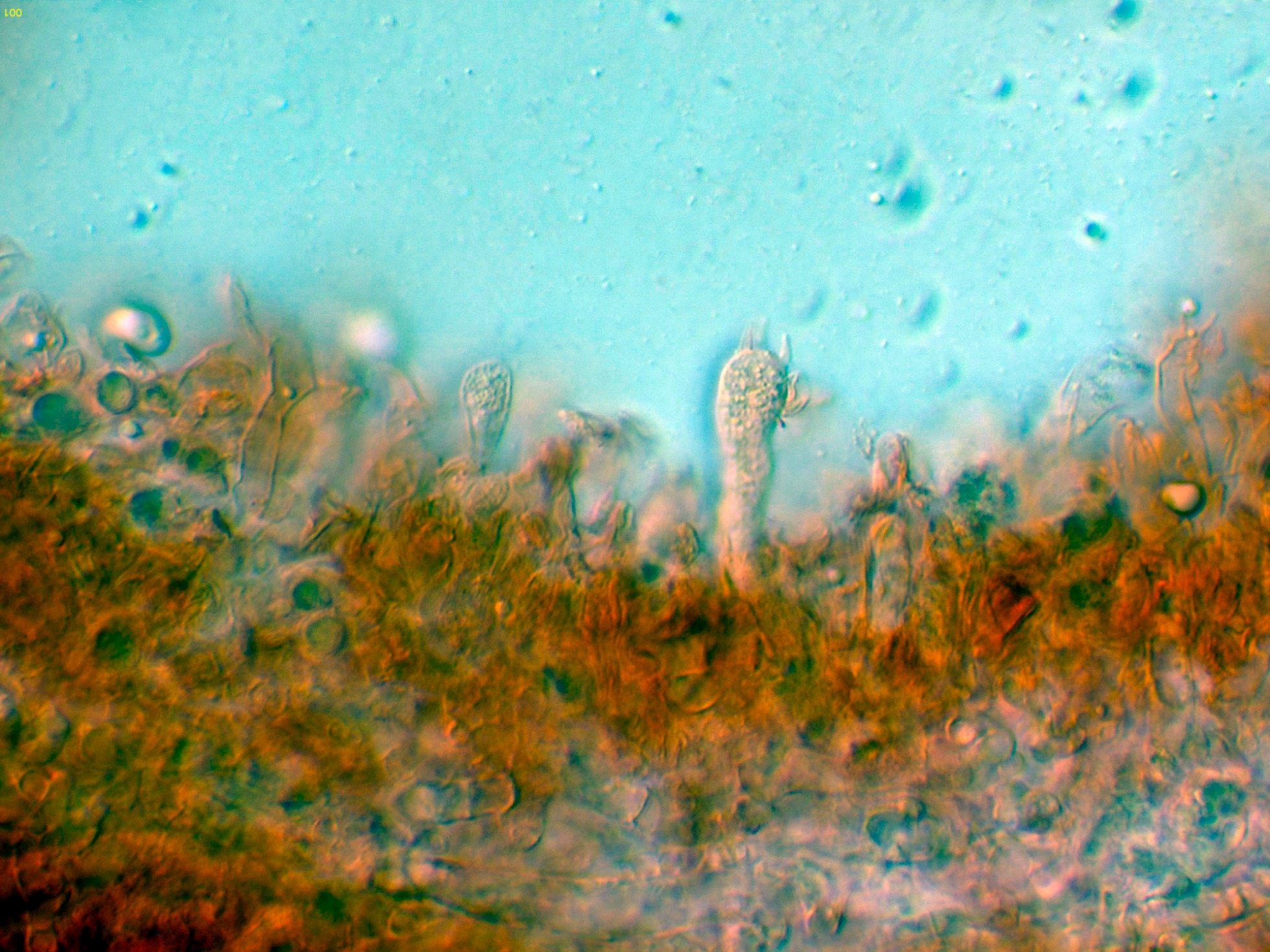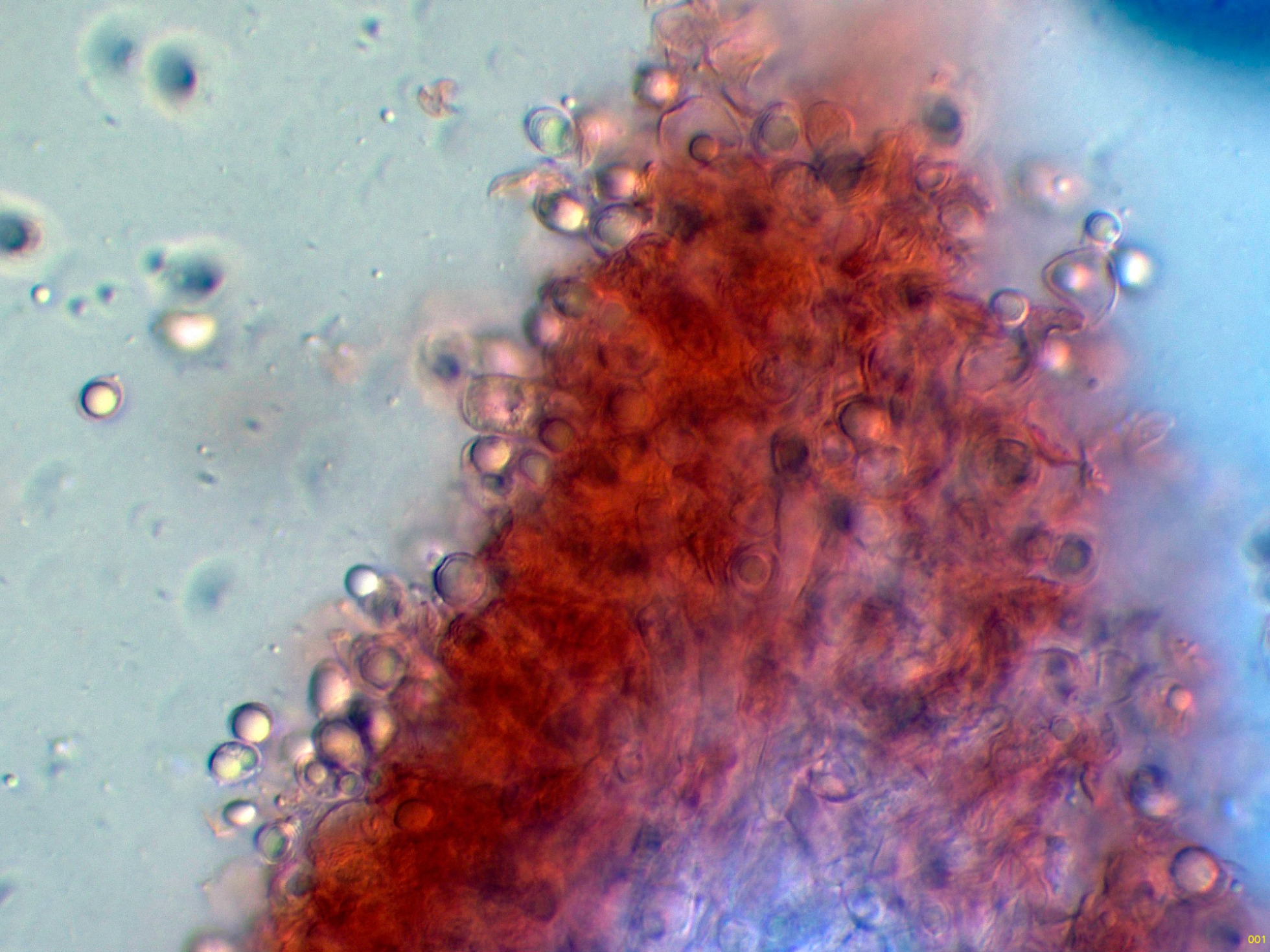 Las hifas de la suprapellis filamentosa, con pigmento intracelular ocráceo y algunas fíbulas dispersas.