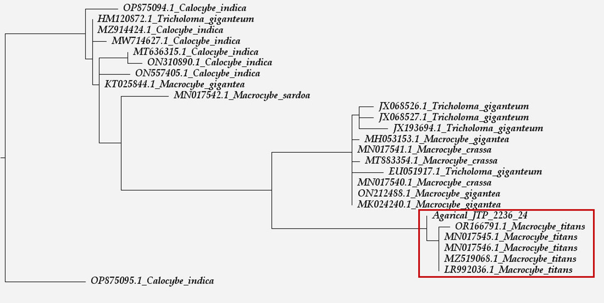 Para cerrar el tema añado una imágen del árbol filogenético, mi especie el Agarical_JTP_2236_24, queda bien alineada filogenéticamente dentro del clado de lo que se considera como Macrocybe titans.