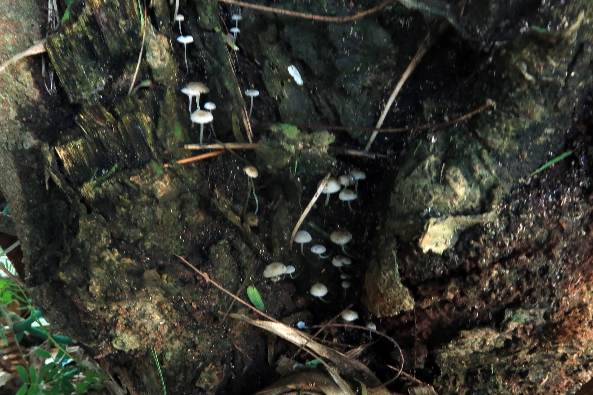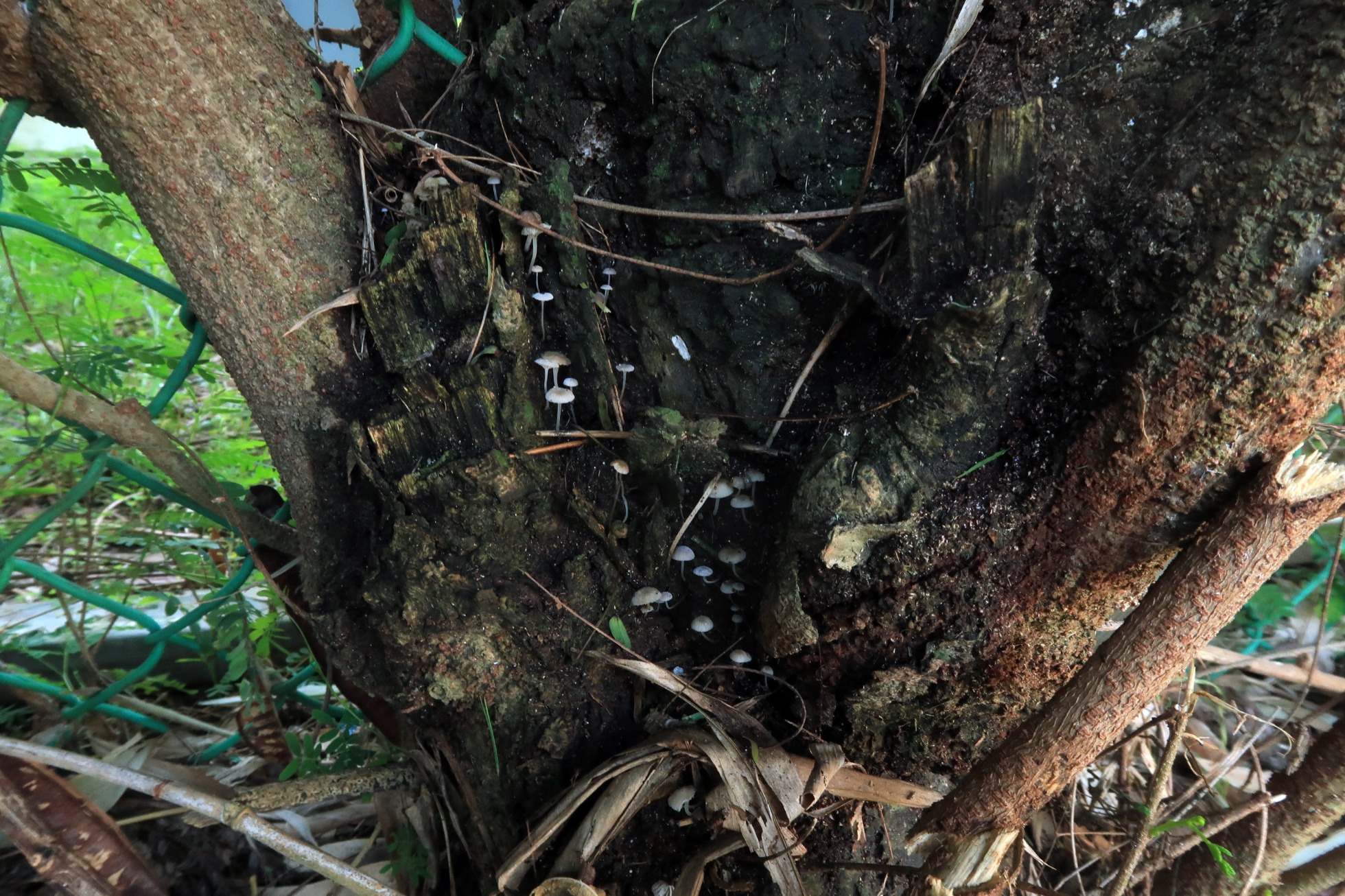 Un hongo Mycenoide fotografiado y recolectado el 13 de noviembre del año pasado brotando de manera dispersa sobre el tronco de un árbol vivo, aunque lo hacía sobre una zona que aparentemente ya estaba muerta, en una zona ajardinada de una urbanización cercana al pueblo de Bávaro (Punta Cana).