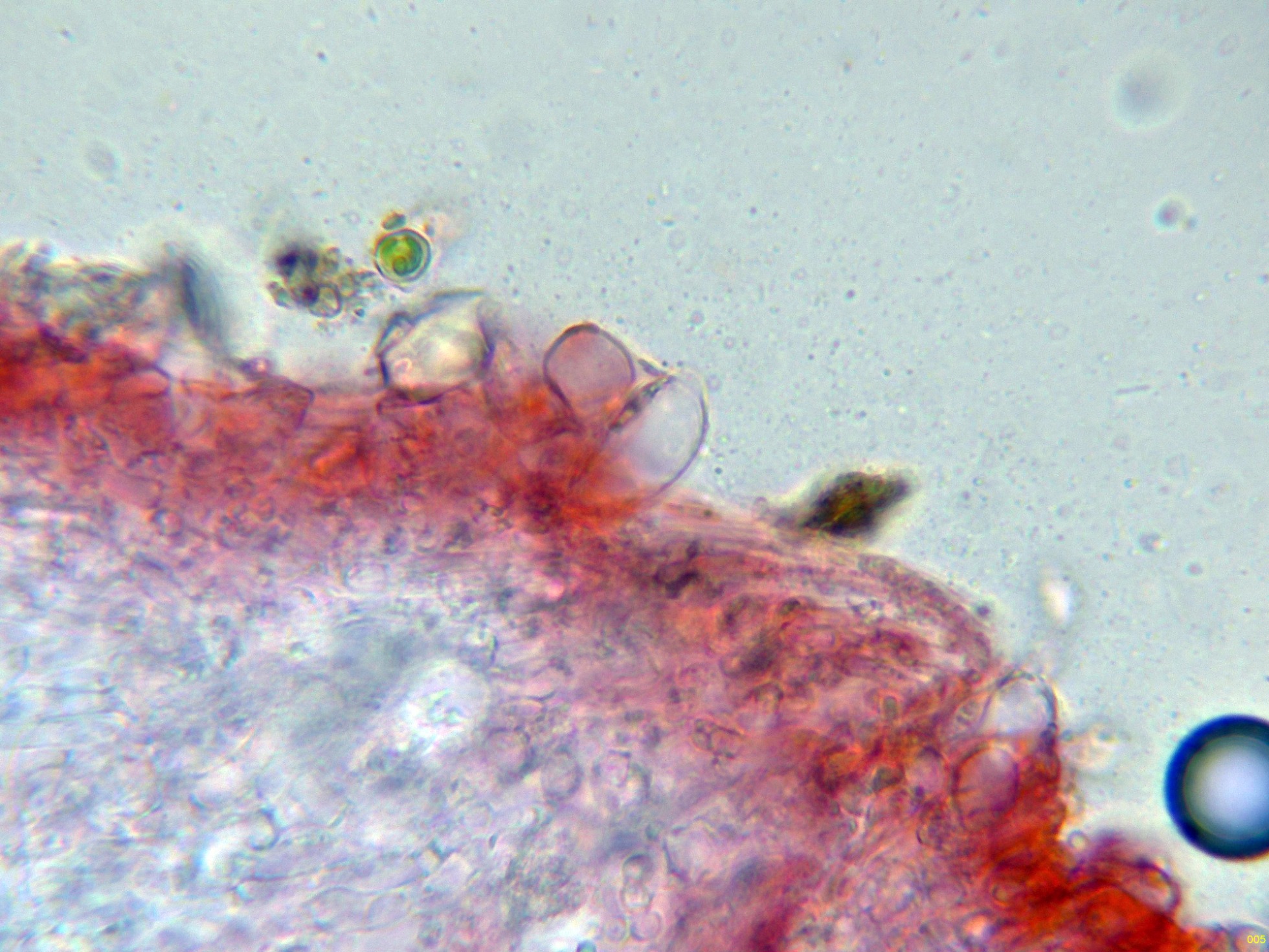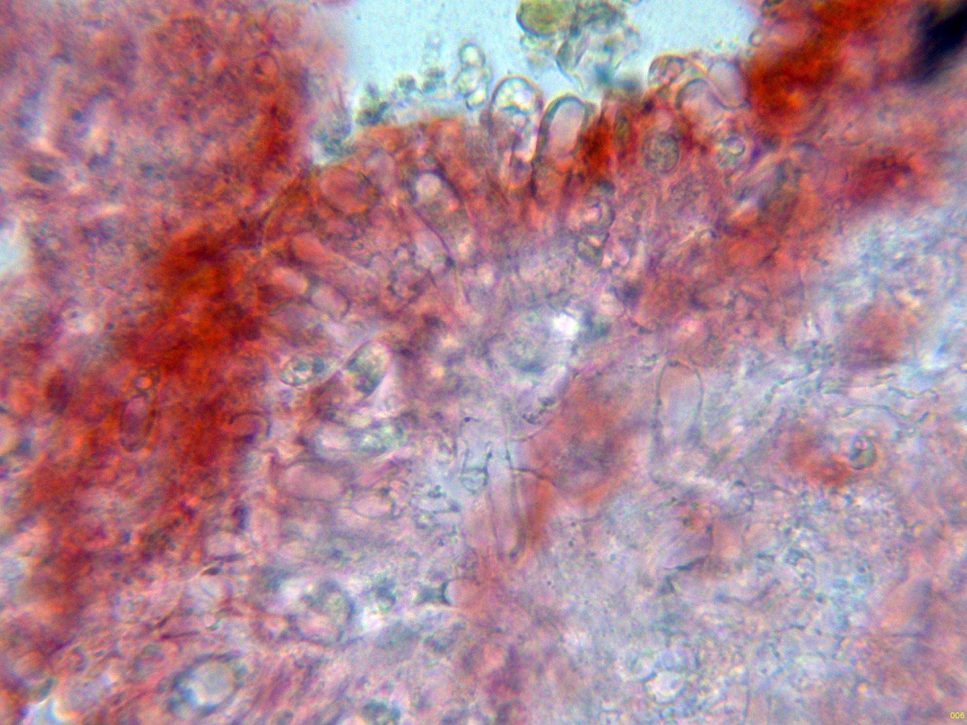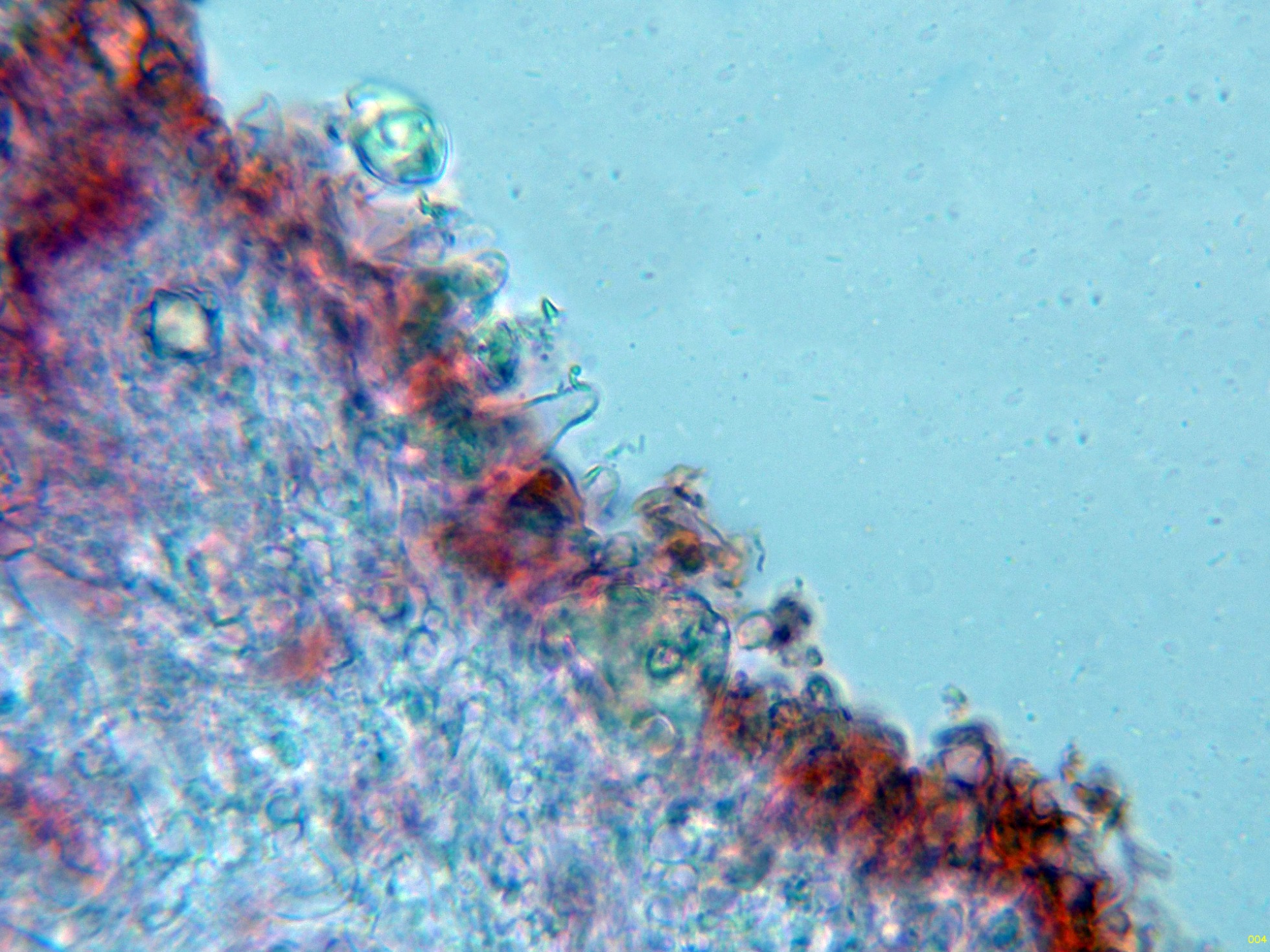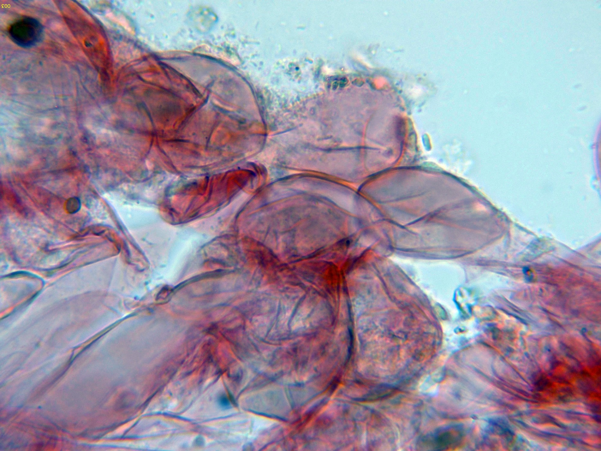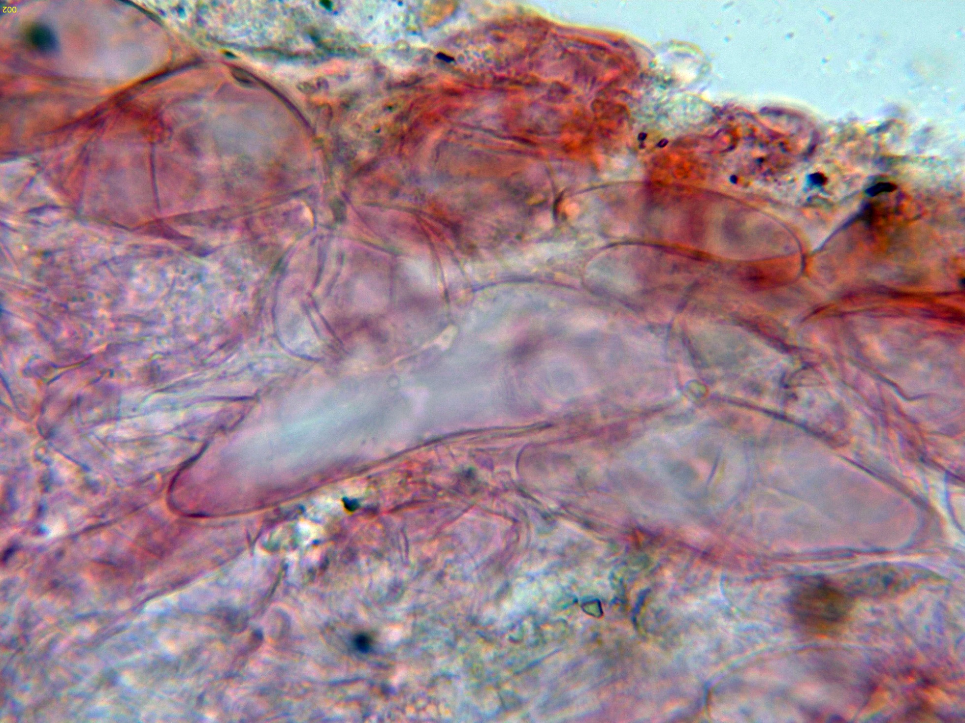 Hifas de la suprapellis, mayoritariamente entre globosas y cilíndrico elipsoidales, con una fina capa de hifas estrechas con discretas digitaciones cortas.
