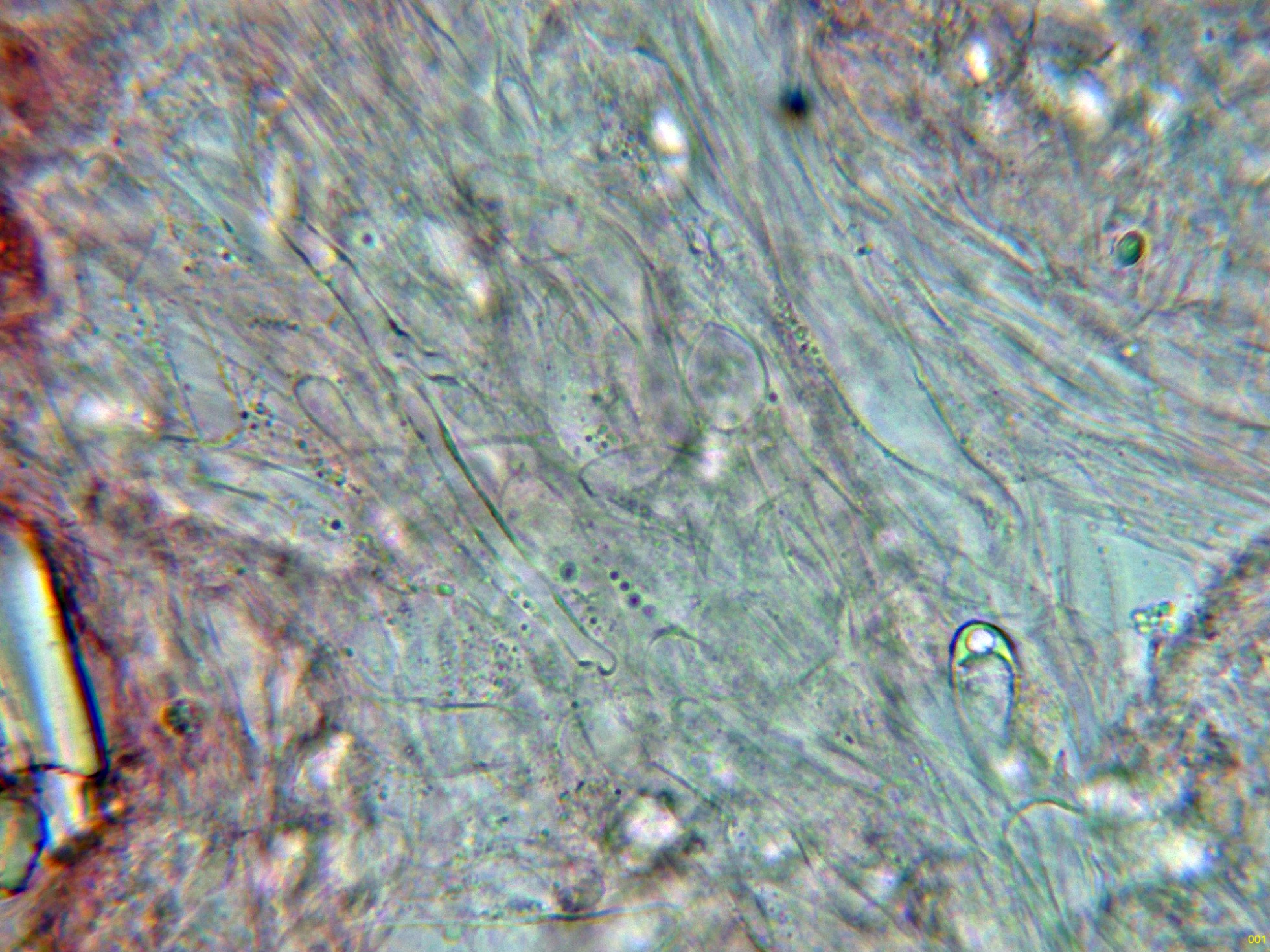 Hifas de la estipitipellis, dispuestas en forma paralela y fibuladas: