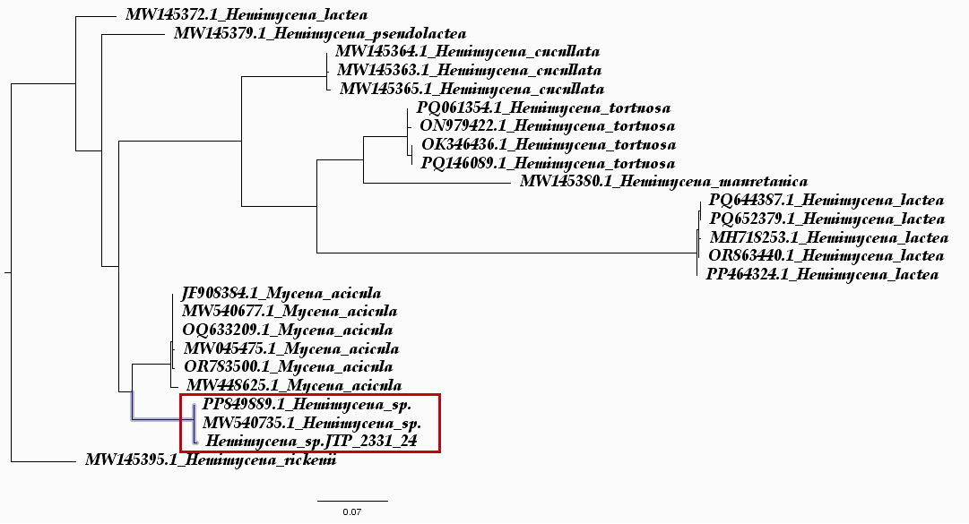 Ante la imposibilidad de llegar a ninguna propuesta convincente, opté como de costumbre el probar con el análisis molecular, la extracción del ADN salió limpia y la secuenciación del gen ITS dio como resultado con una coincidencia por cobertura del 100% y una coincidencia por identidad del 99,84% que se trataba de Hemimycena sp. MW540735.1, 99,53% Hemimycena sp. PP849889.1.Añado el árbol filogenético: