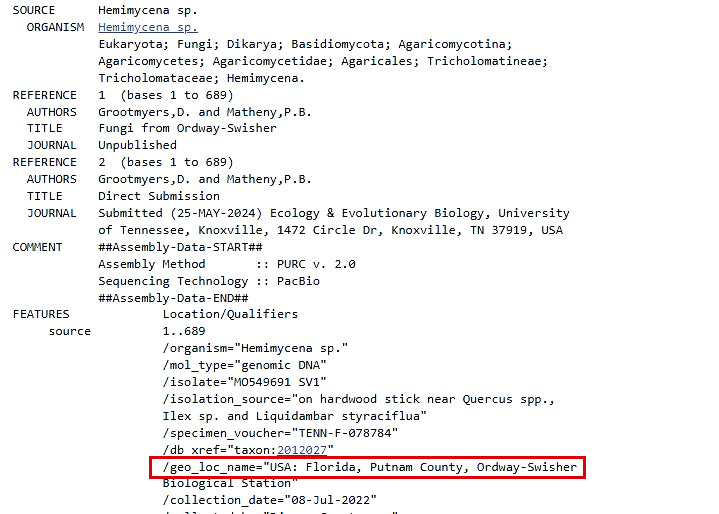 Lo desconcertante es cuando busco información de las dos secuencias más próximas a mi propuesta, la que a nivel molecular coincide con un 99,53% la PP849889.1, se corresponde con una recolecta efectuada en Florida (USA), añado una captura de pantalla donde he señalado el detalle.
