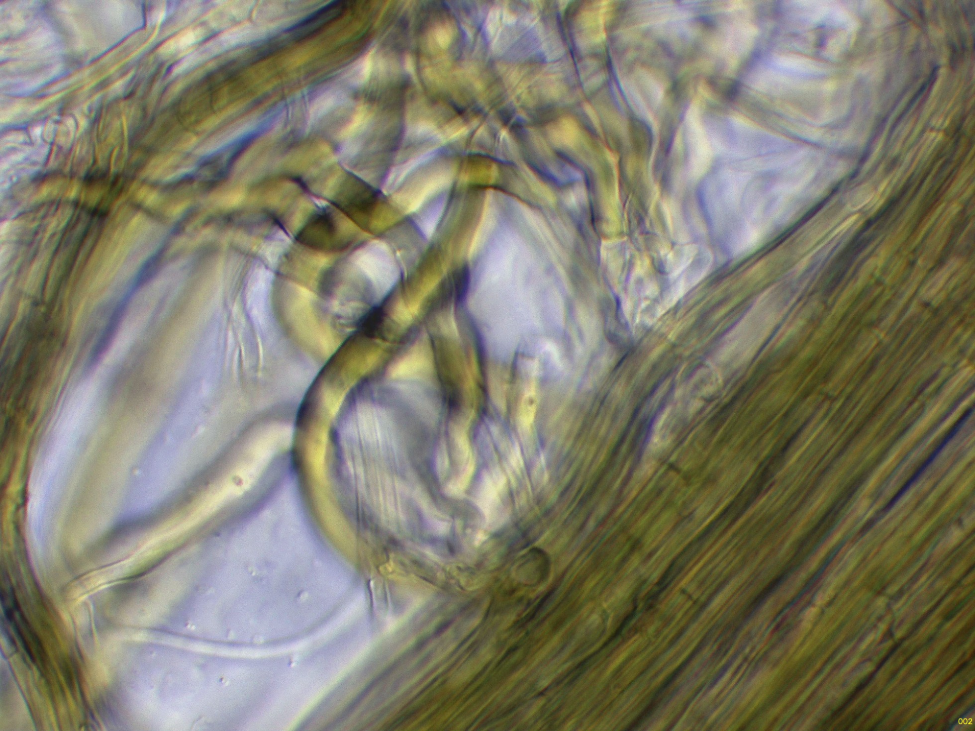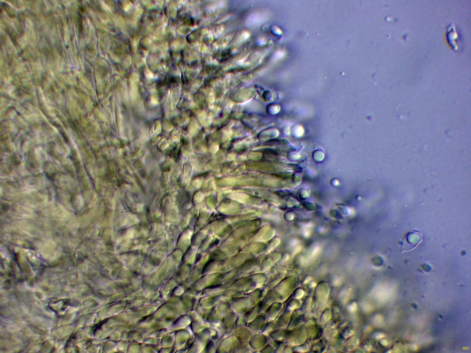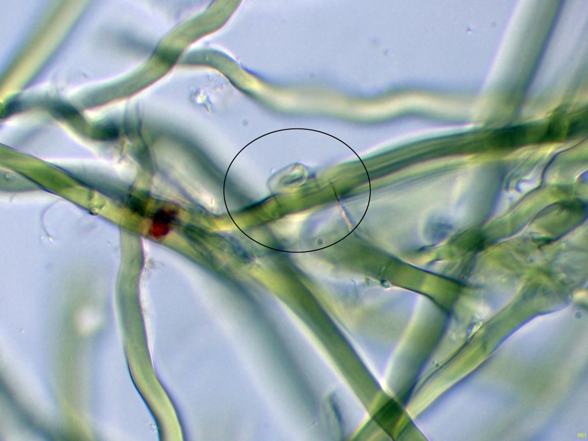 Una de las características que definen a la Crinipellis tucumanensis, es el comportamiento de las hifas del estípite al aplicar KOH, estas hifas reaccionan a un color verdoso muy intenso: