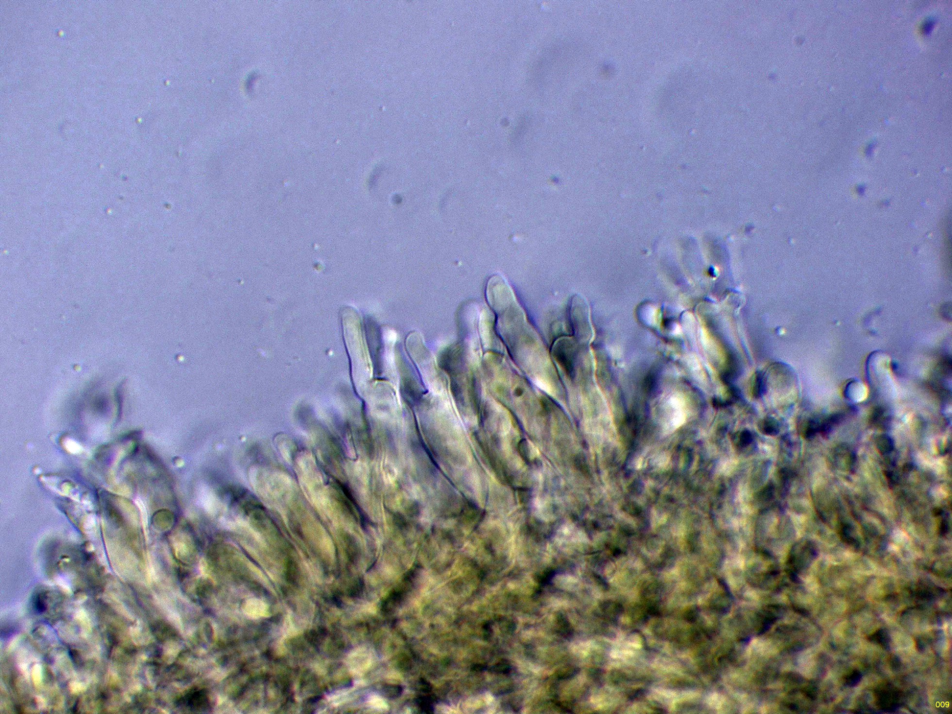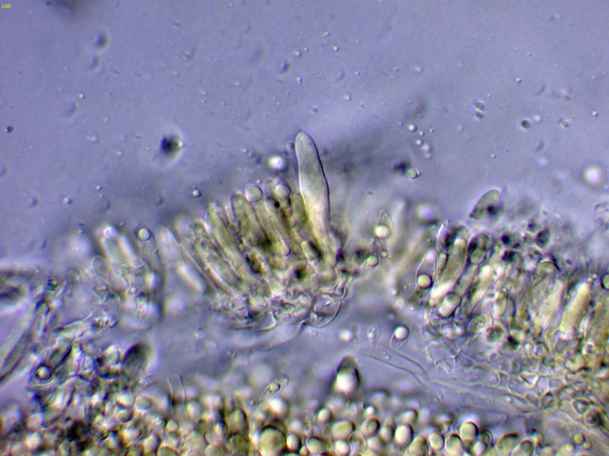 Los queilocistidios, estos queilocistidios con unas medidas de (21.7) 23.6 - 32.7 (39.6) × (5.2) 5.5 - 6.8 (8.6) µm.
