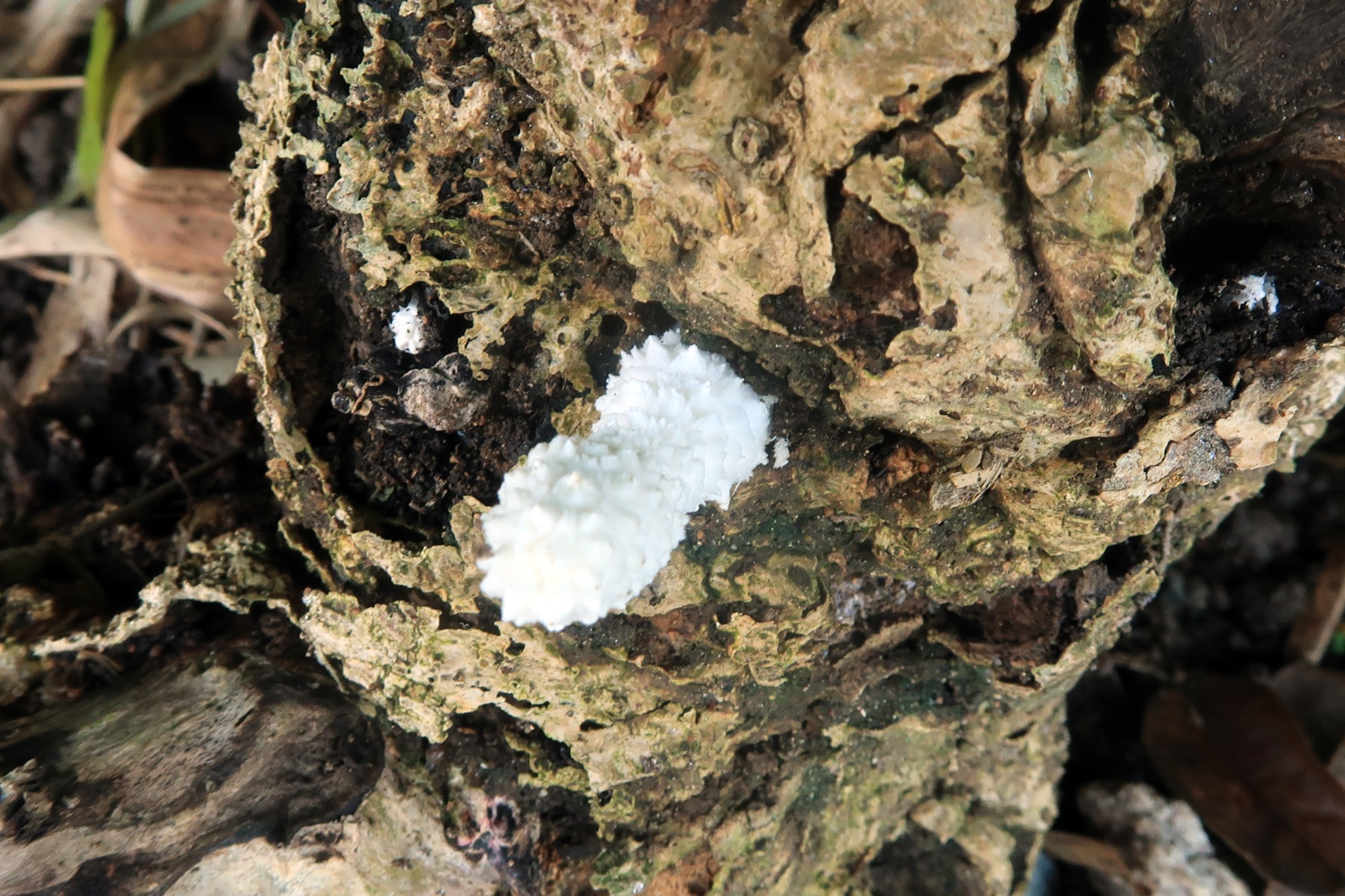 Un Leucocoprinus que se deja ver de vez en cuando por la zona, bastante fotogénico, el Leucocoprinus cretaceus.