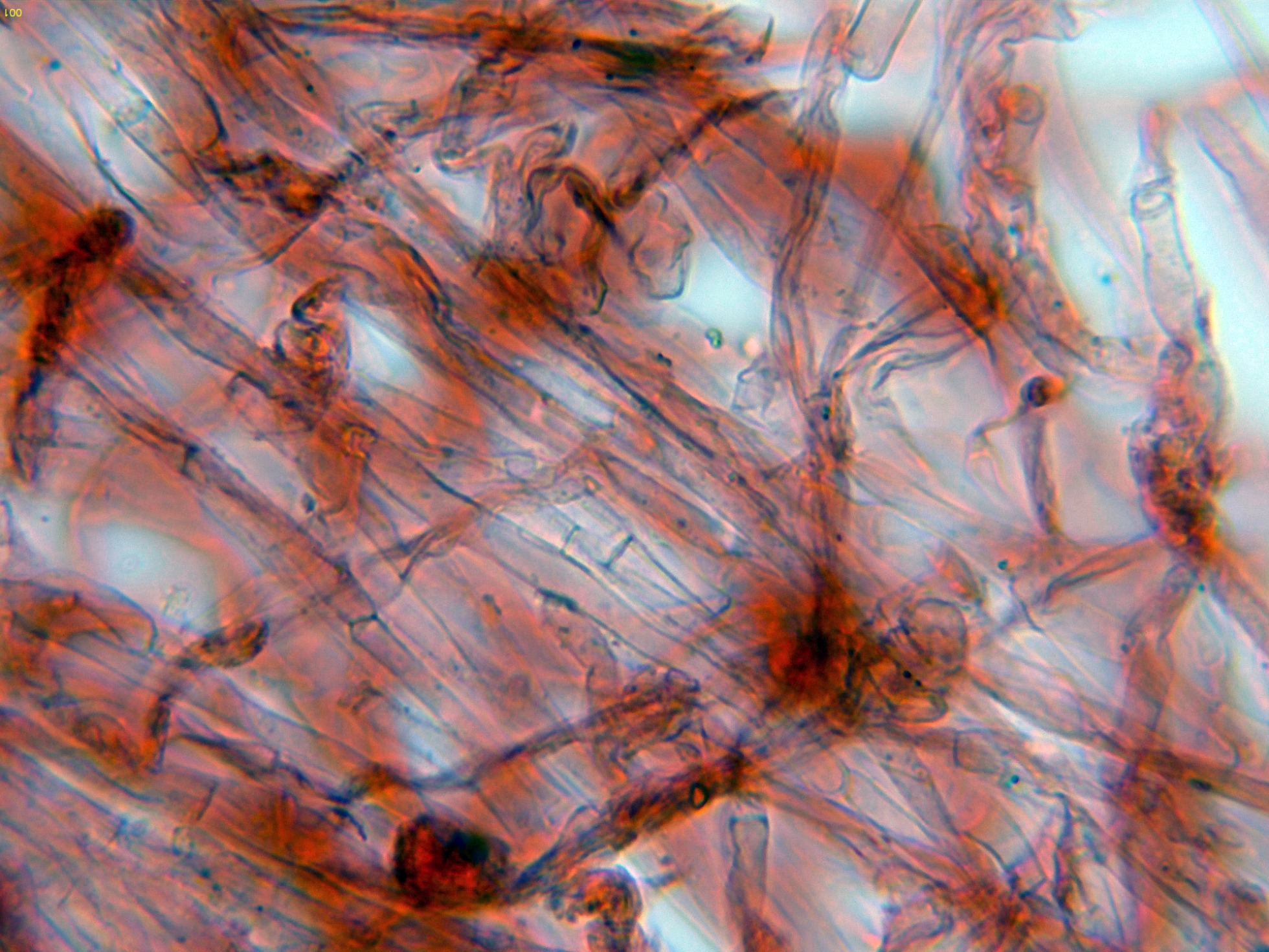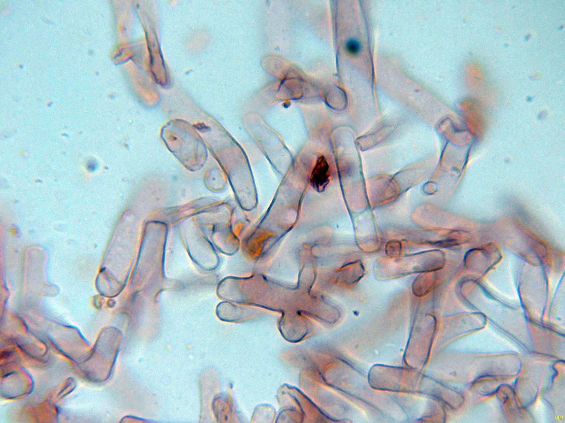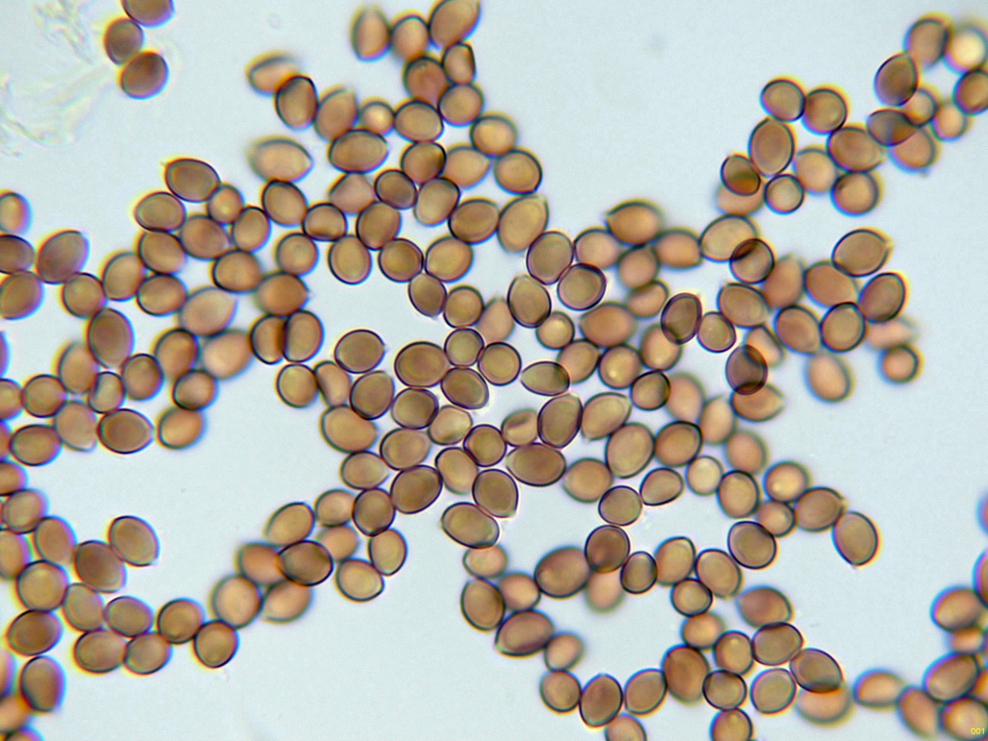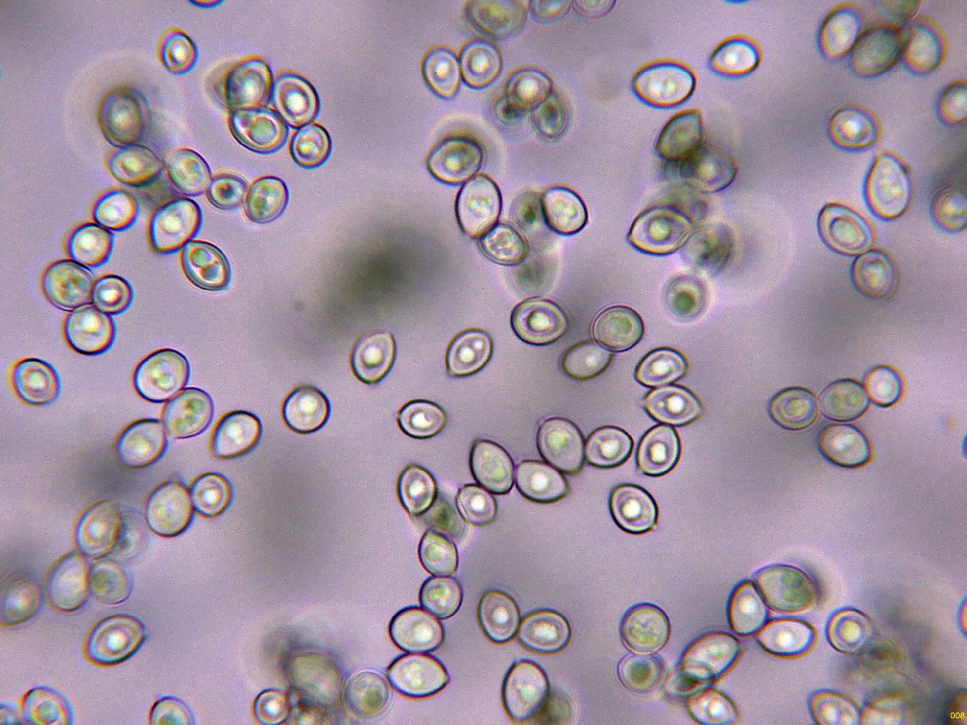 Las esporas en reactivo de Melzer, con un comportamiento dextrinoide: