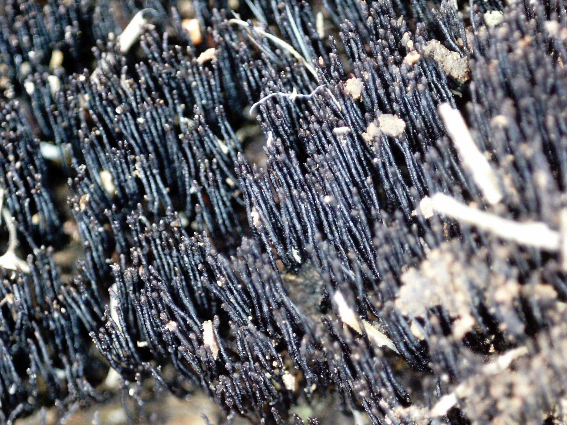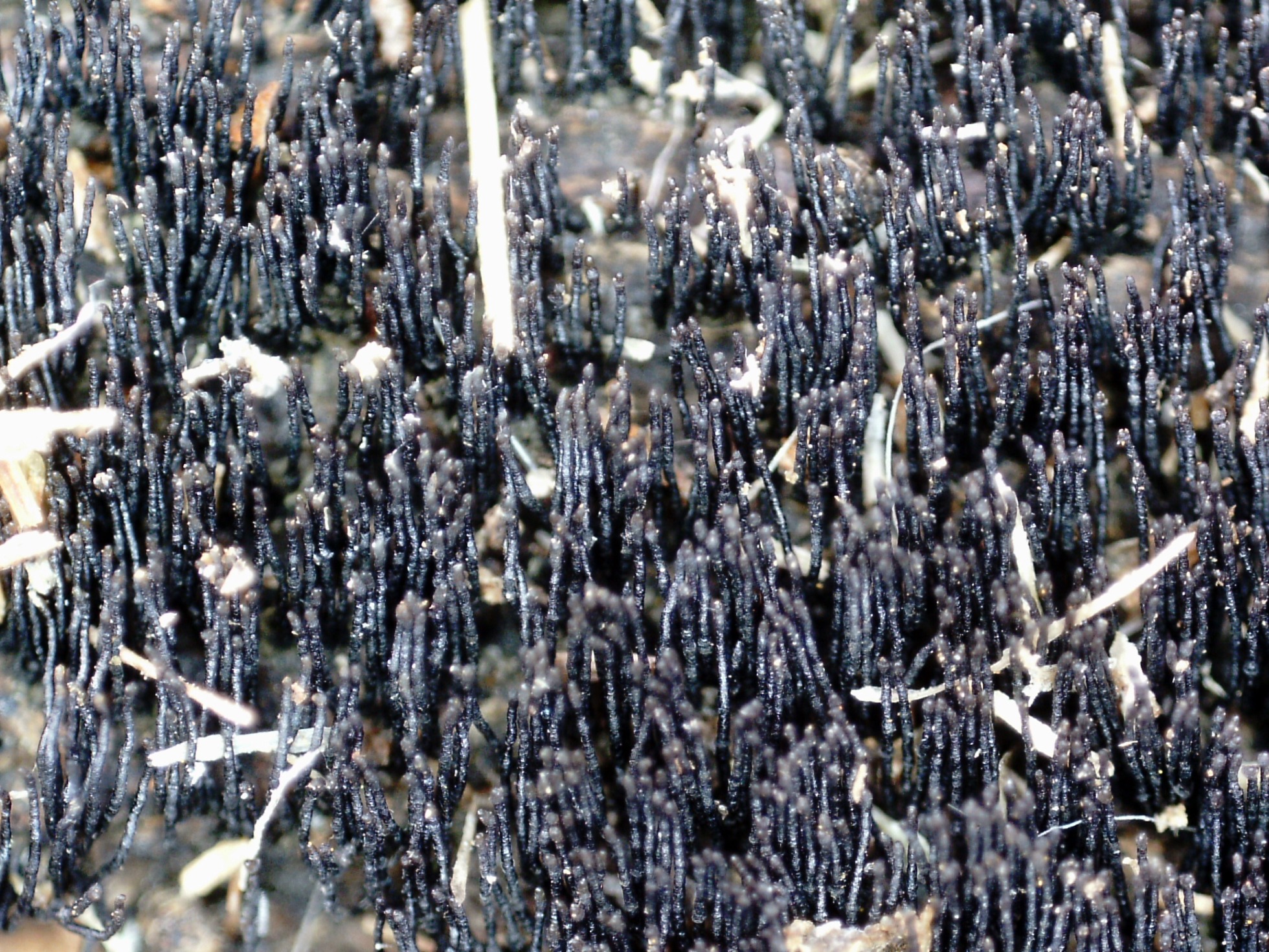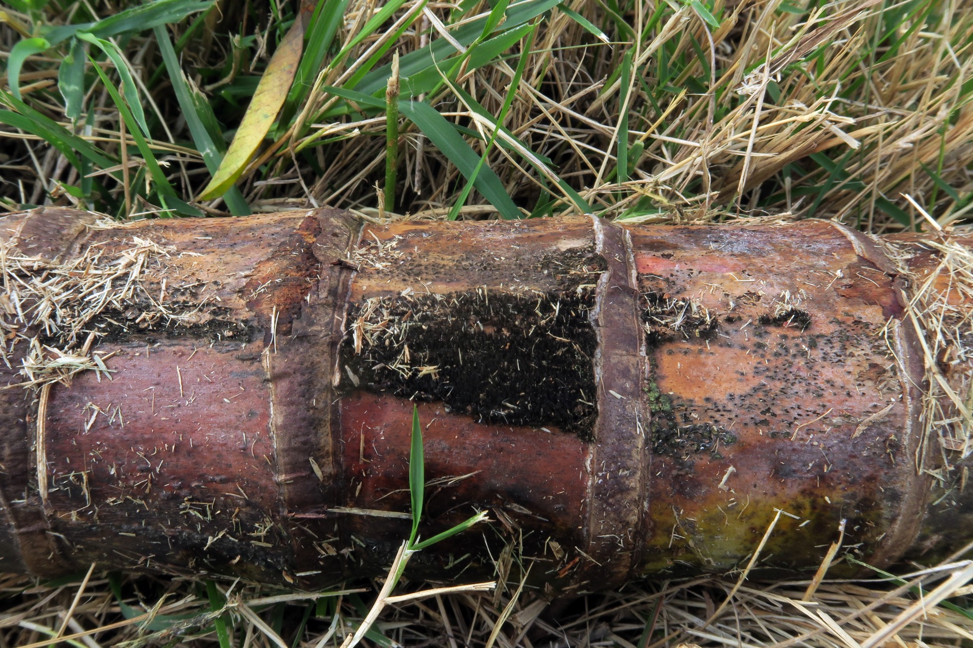 Un ascomiceto presente en todos los continentes, brotando de manera masiva y abundante sobre la superficie de una caña de bambú en descomposición del suelo, la Peroneutypa scoparia.