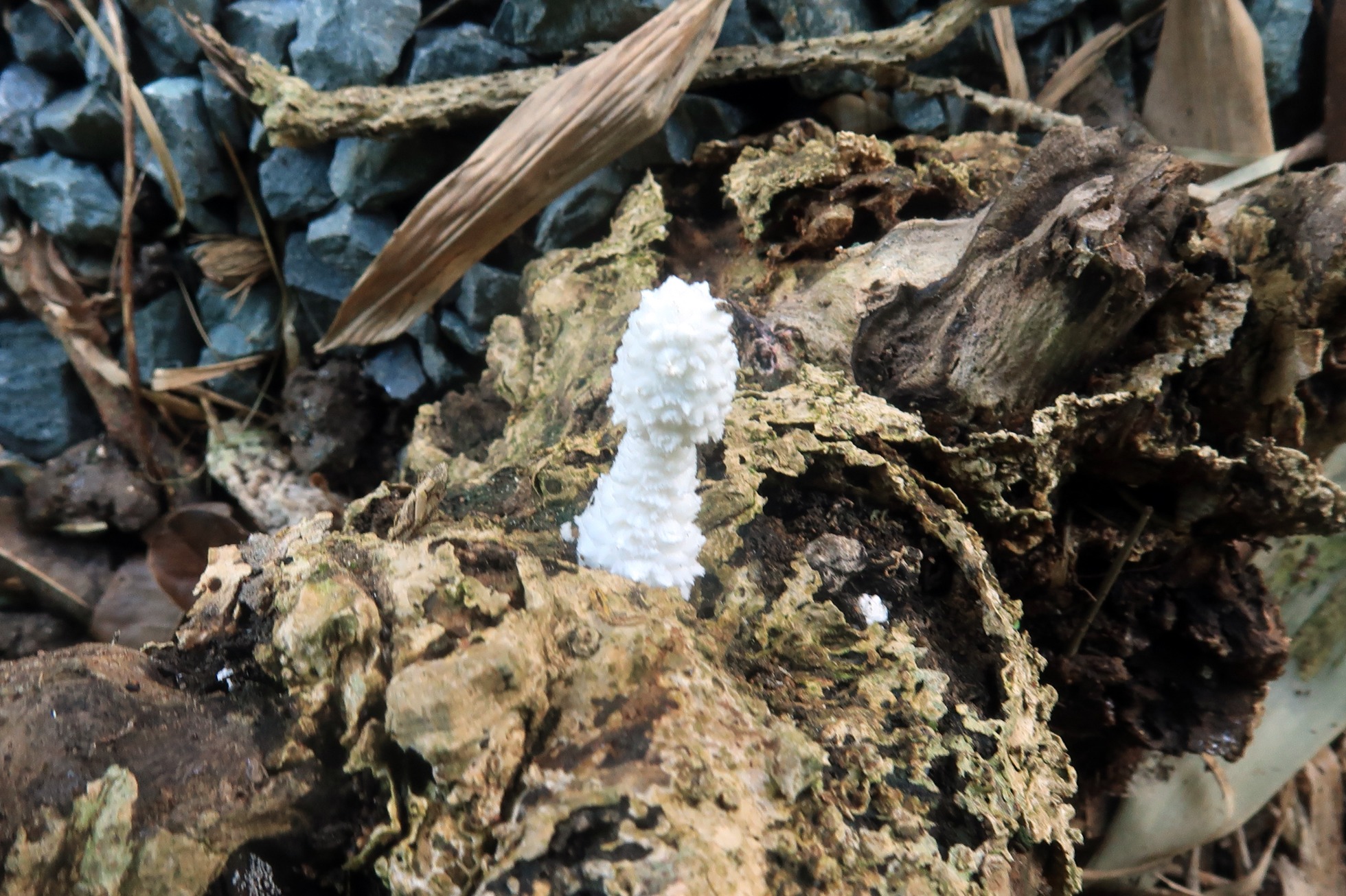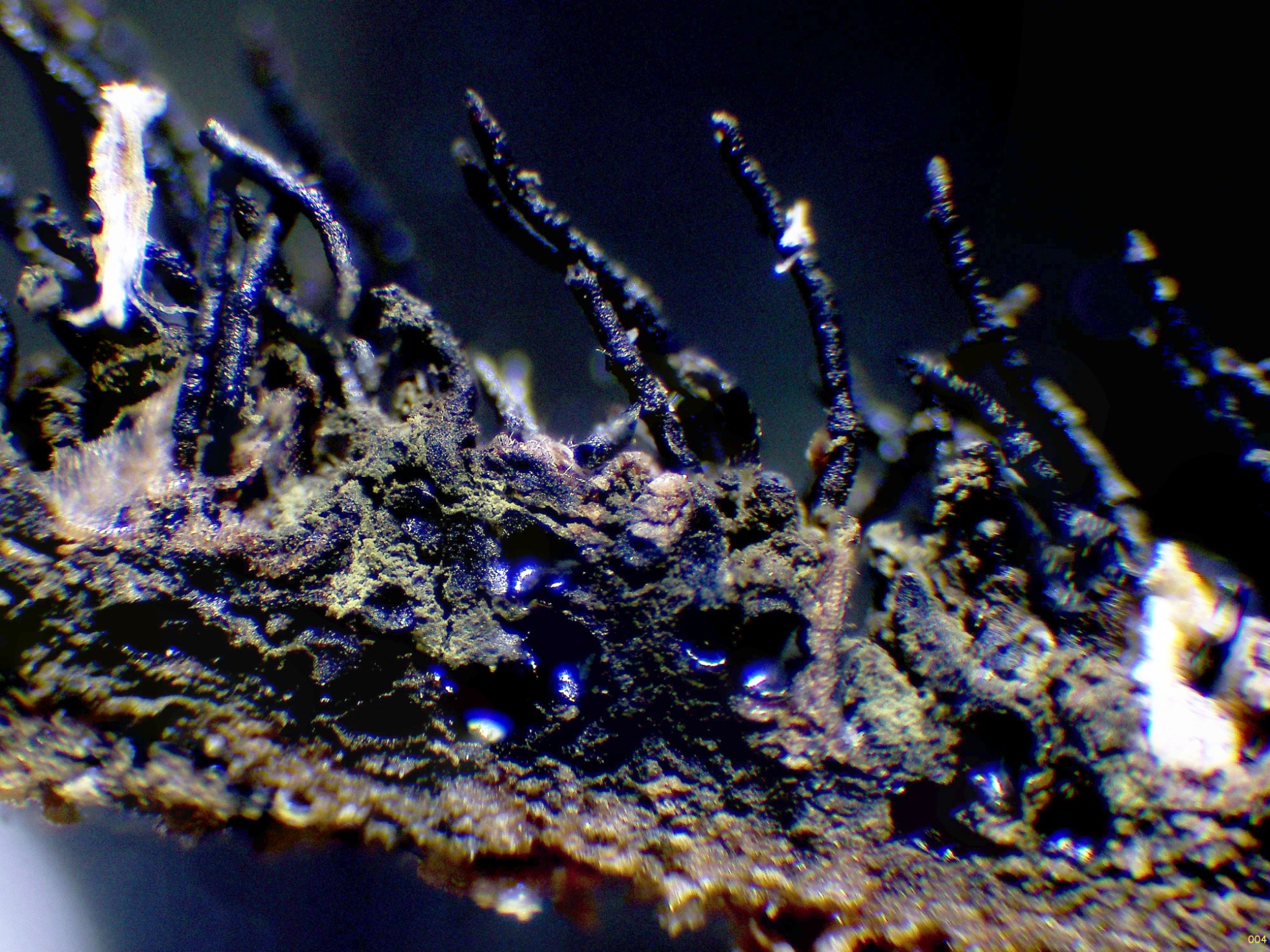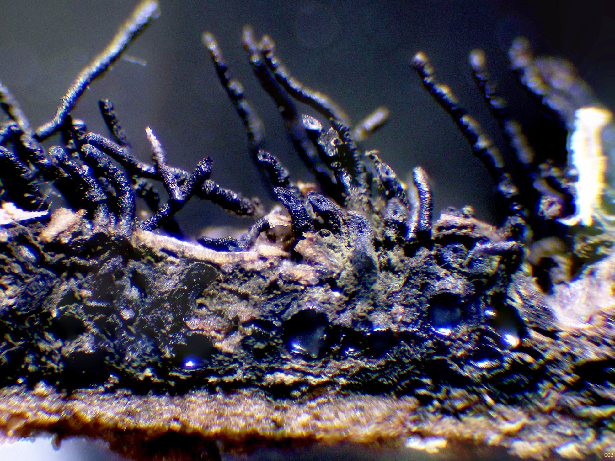 Un ascomiceto presente en todos los continentes, brotando de manera masiva y abundante sobre la superficie de una caña de bambú en descomposición del suelo, la Peroneutypa scoparia.