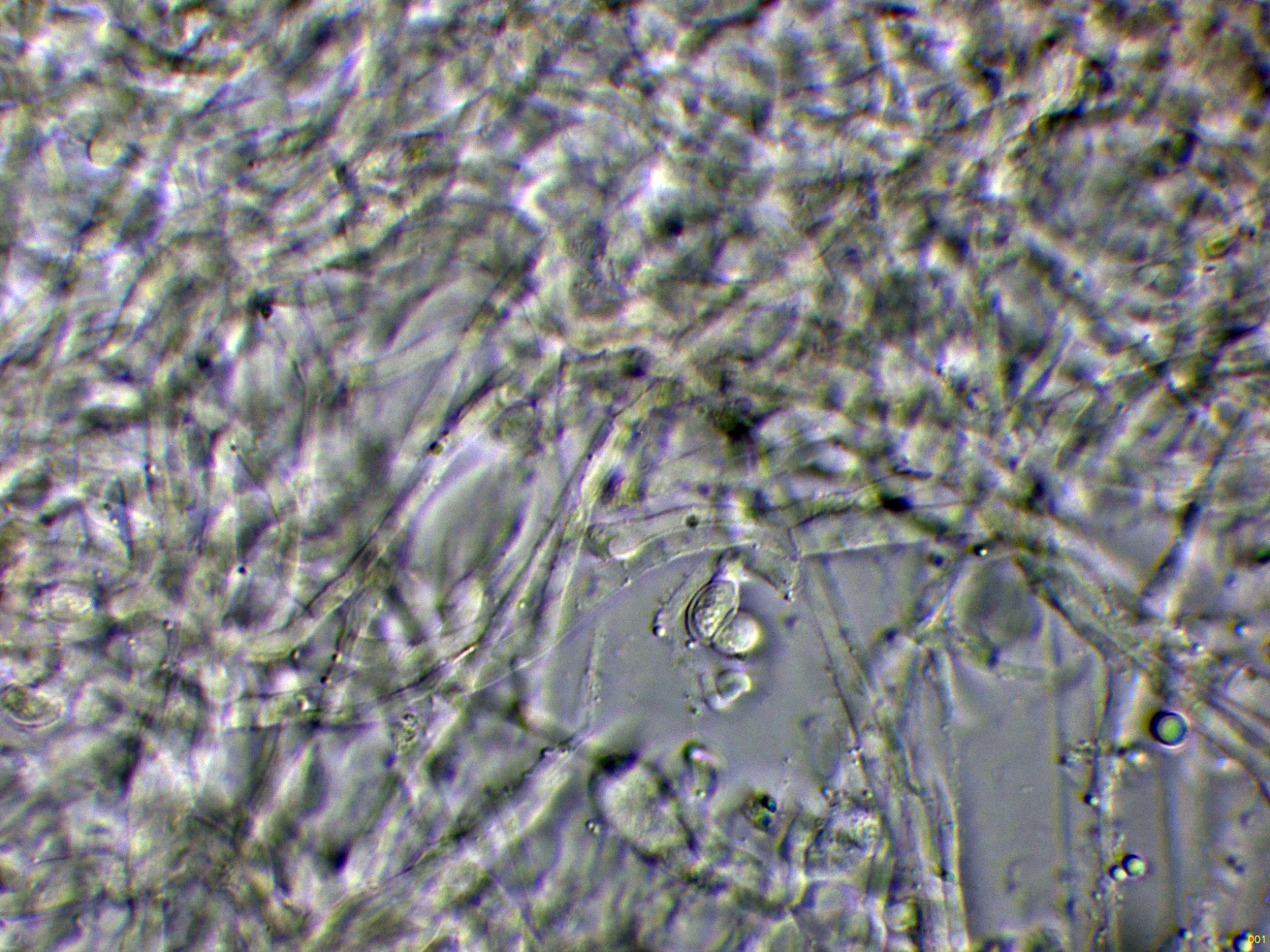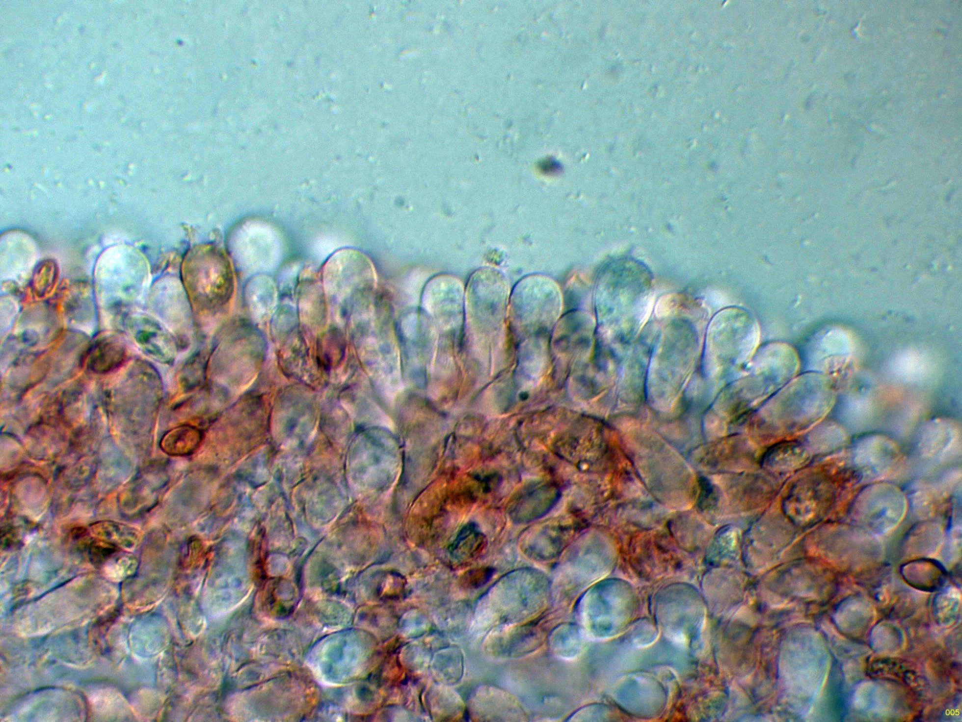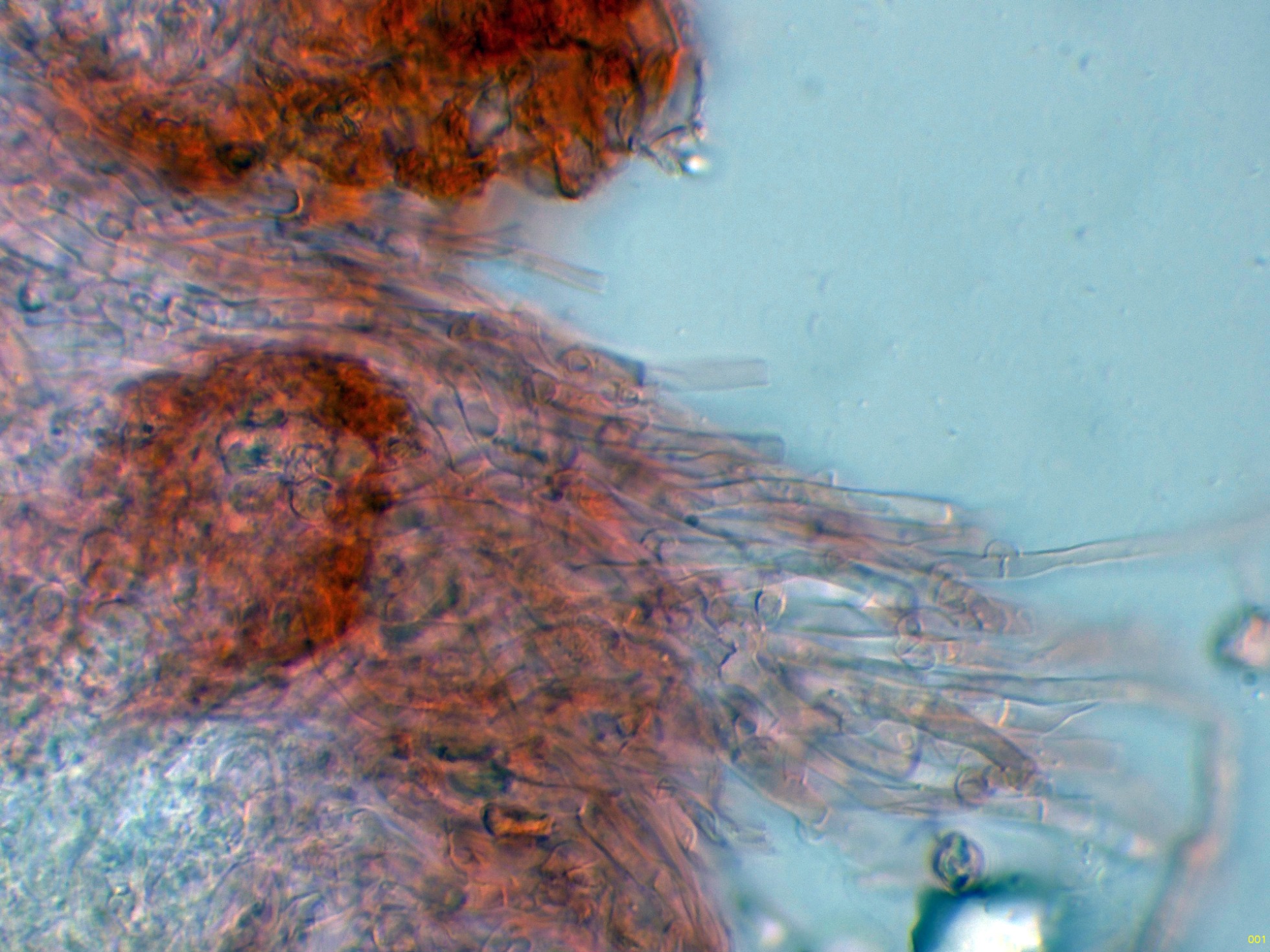Las hifas de la pileipellis en solución de KOH, con septos simples, sin fíbulas: