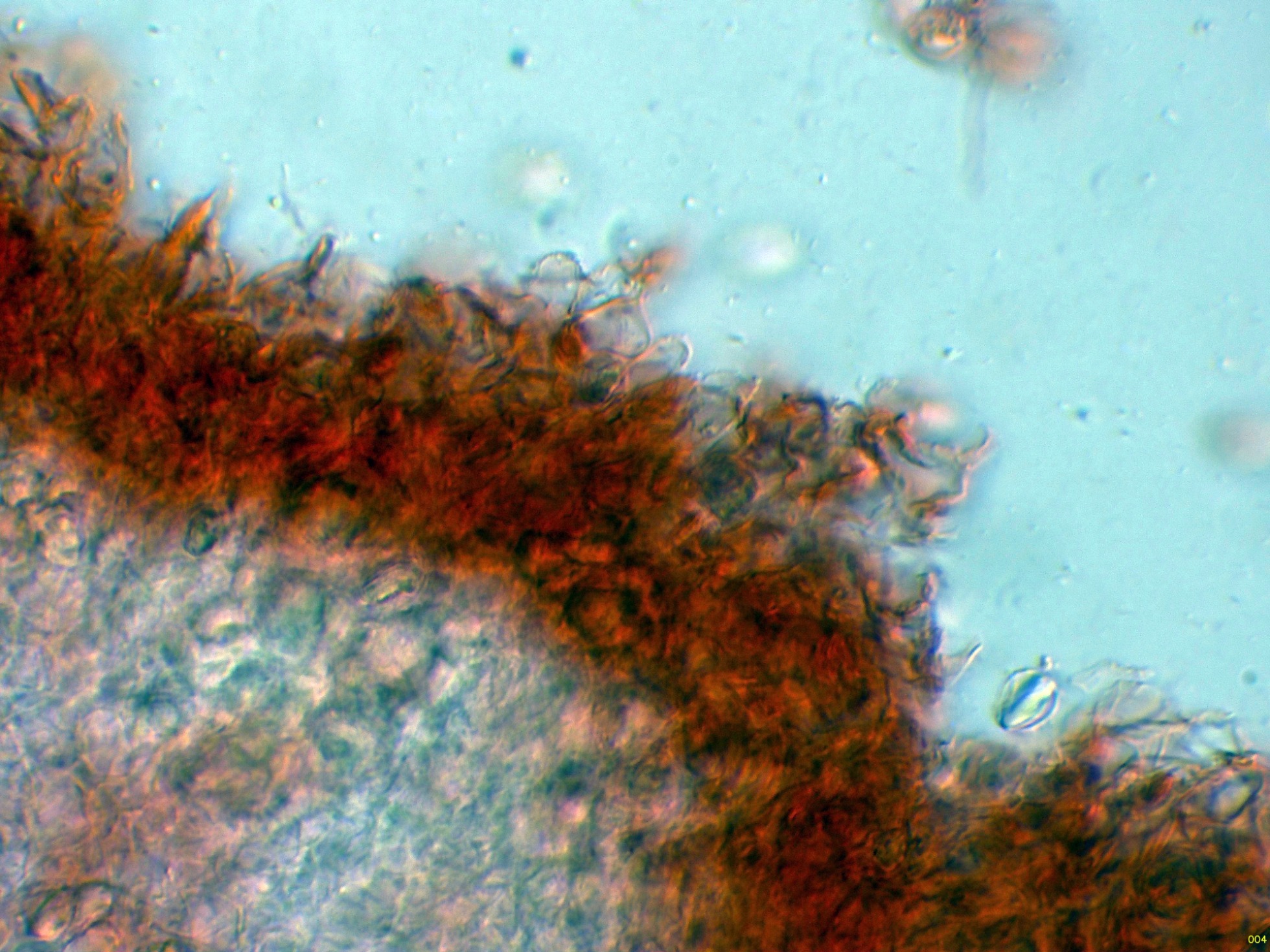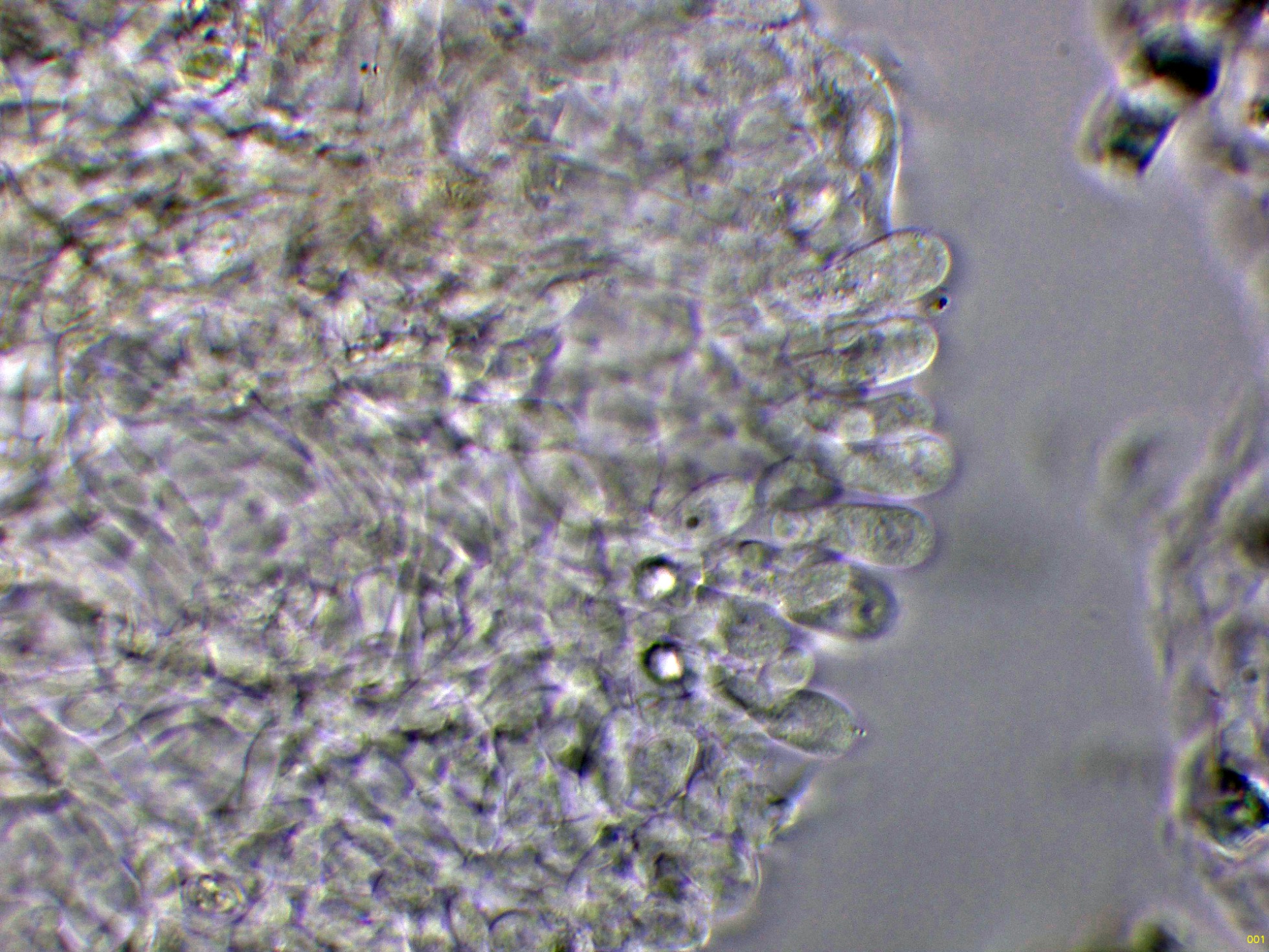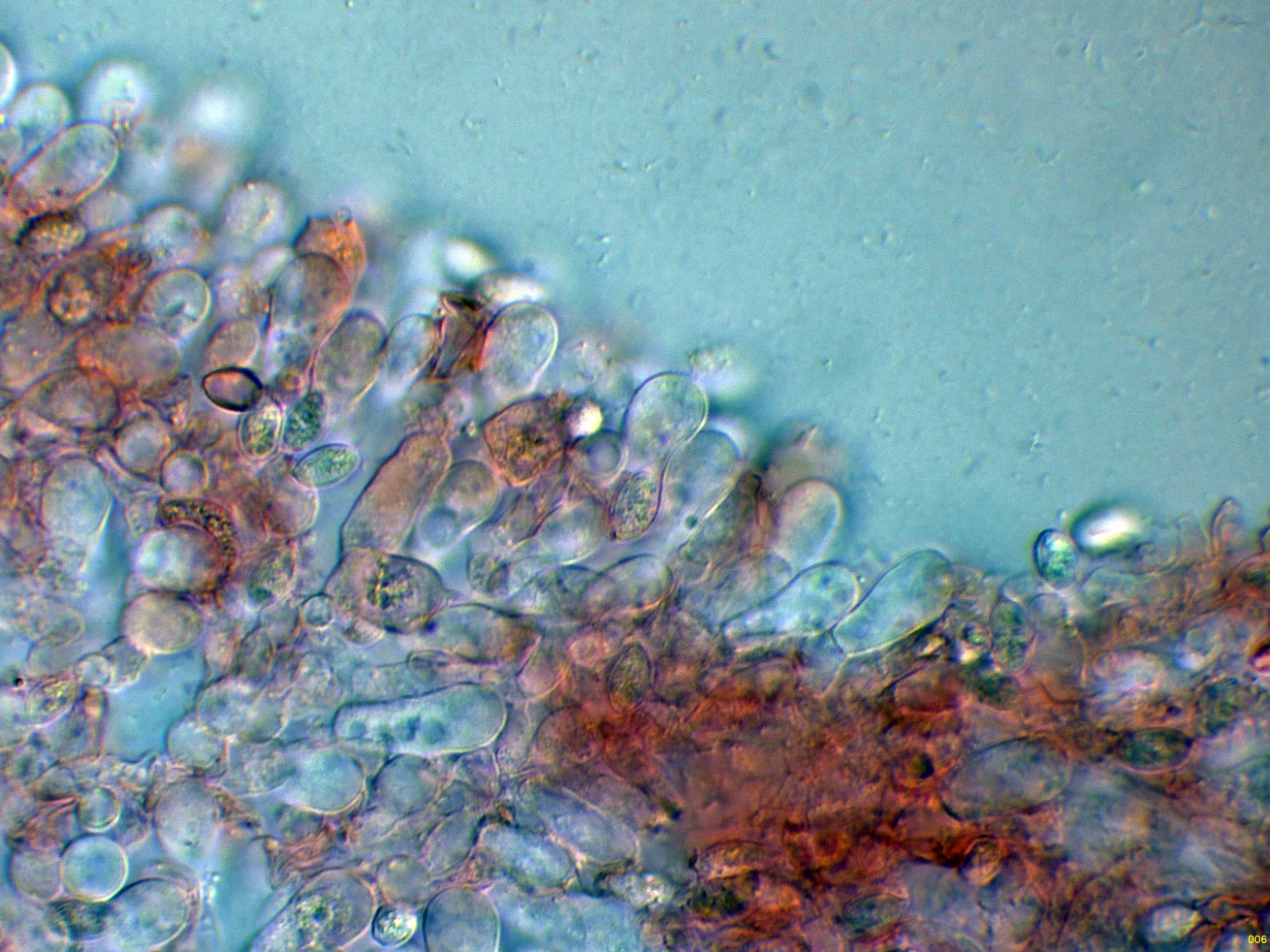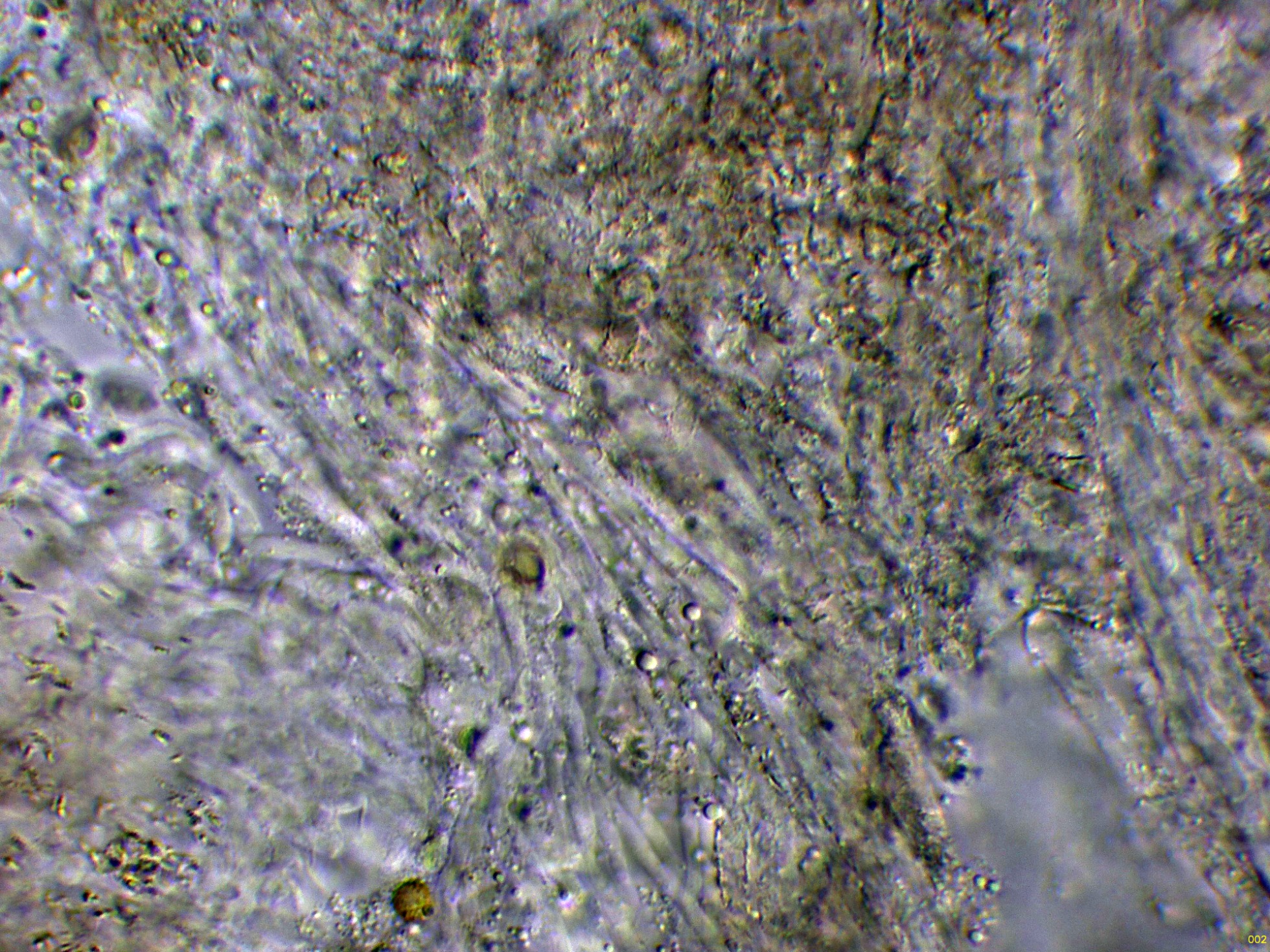Las hifas de la pileipellis en solución de KOH, con septos simples, sin fíbulas:
