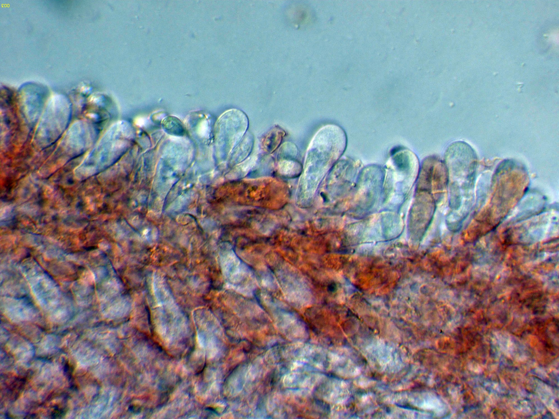 El himenio en solucion de Rojo Congo sin cistidios observados, solo con basidios: