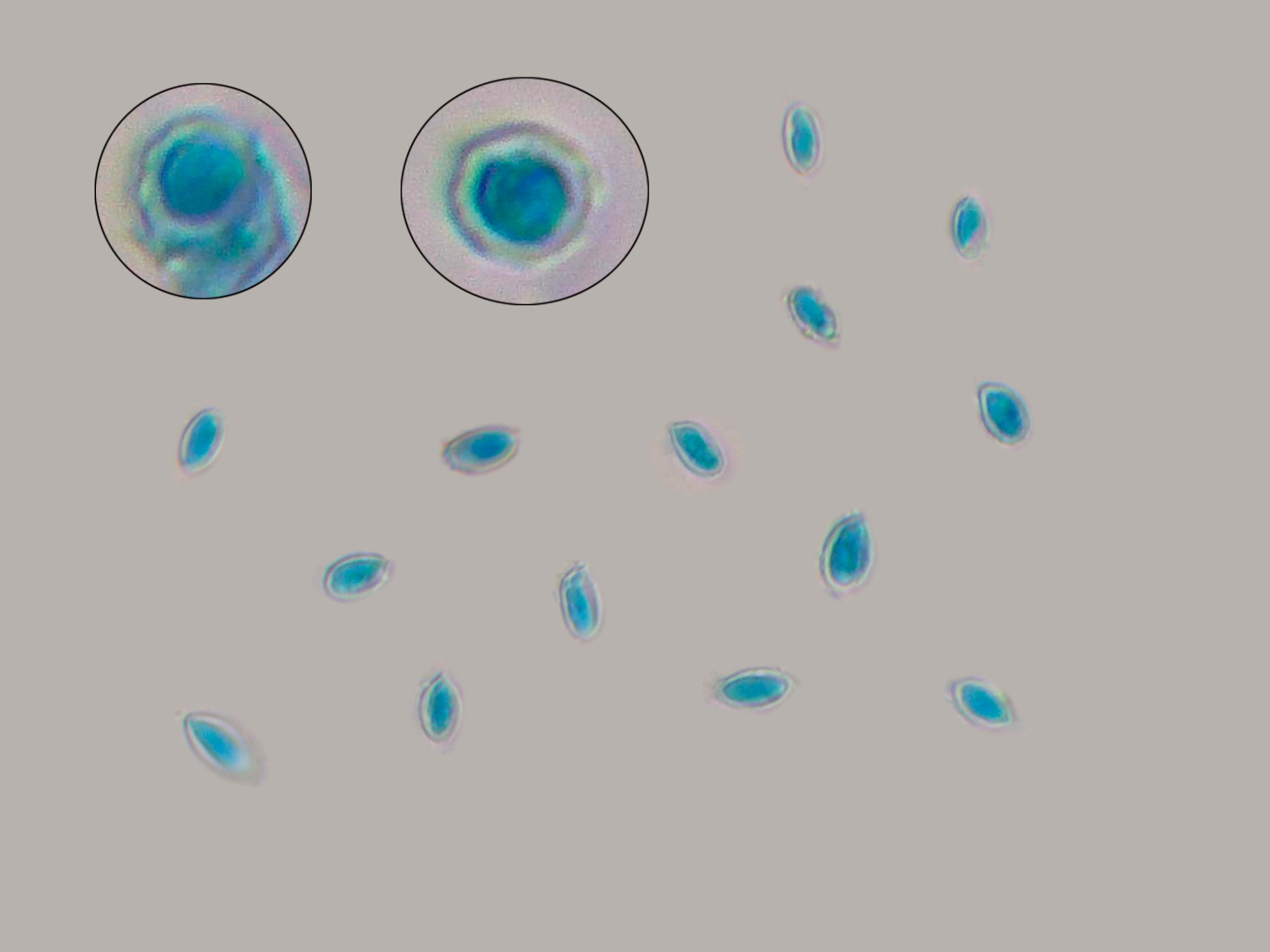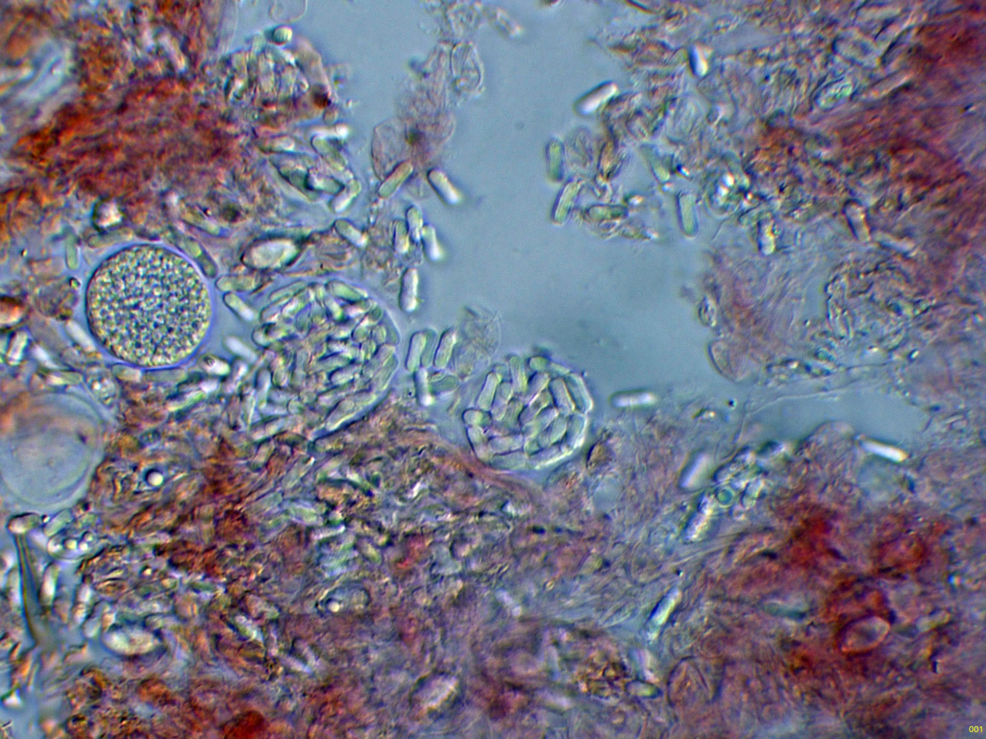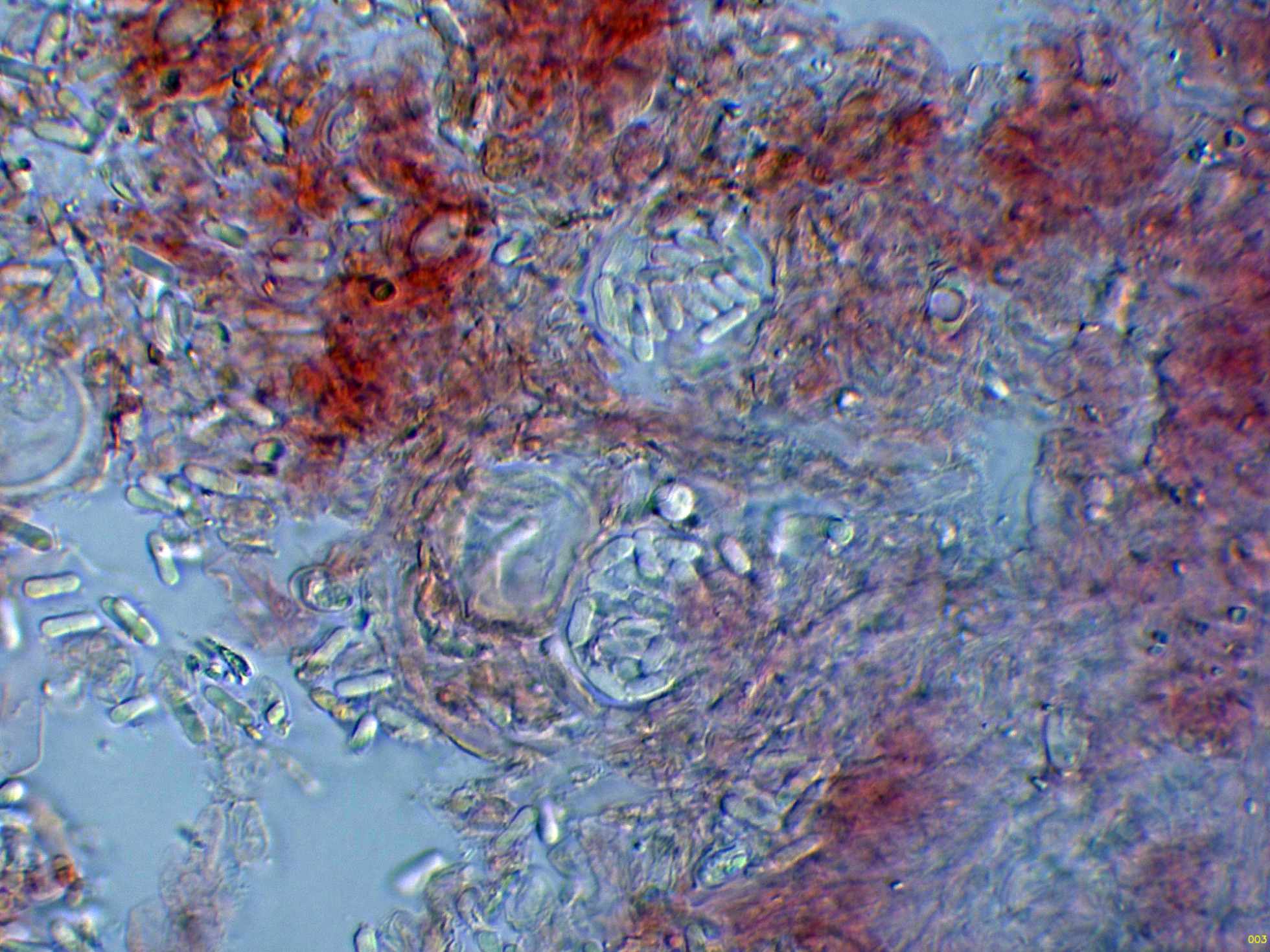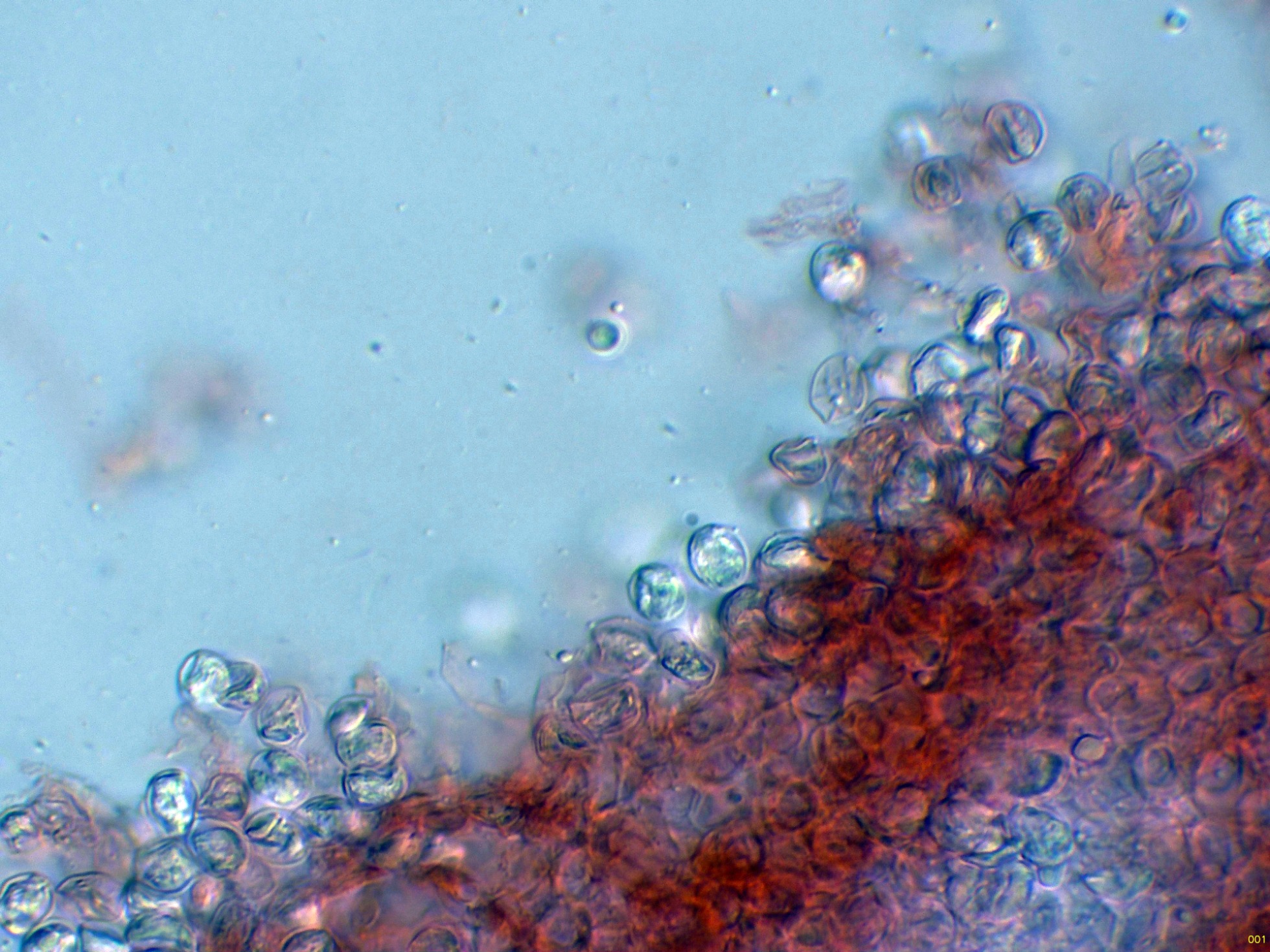 En la miniatura superior izquierda, las esporas en Reactivo de Melzer, inamiloides: