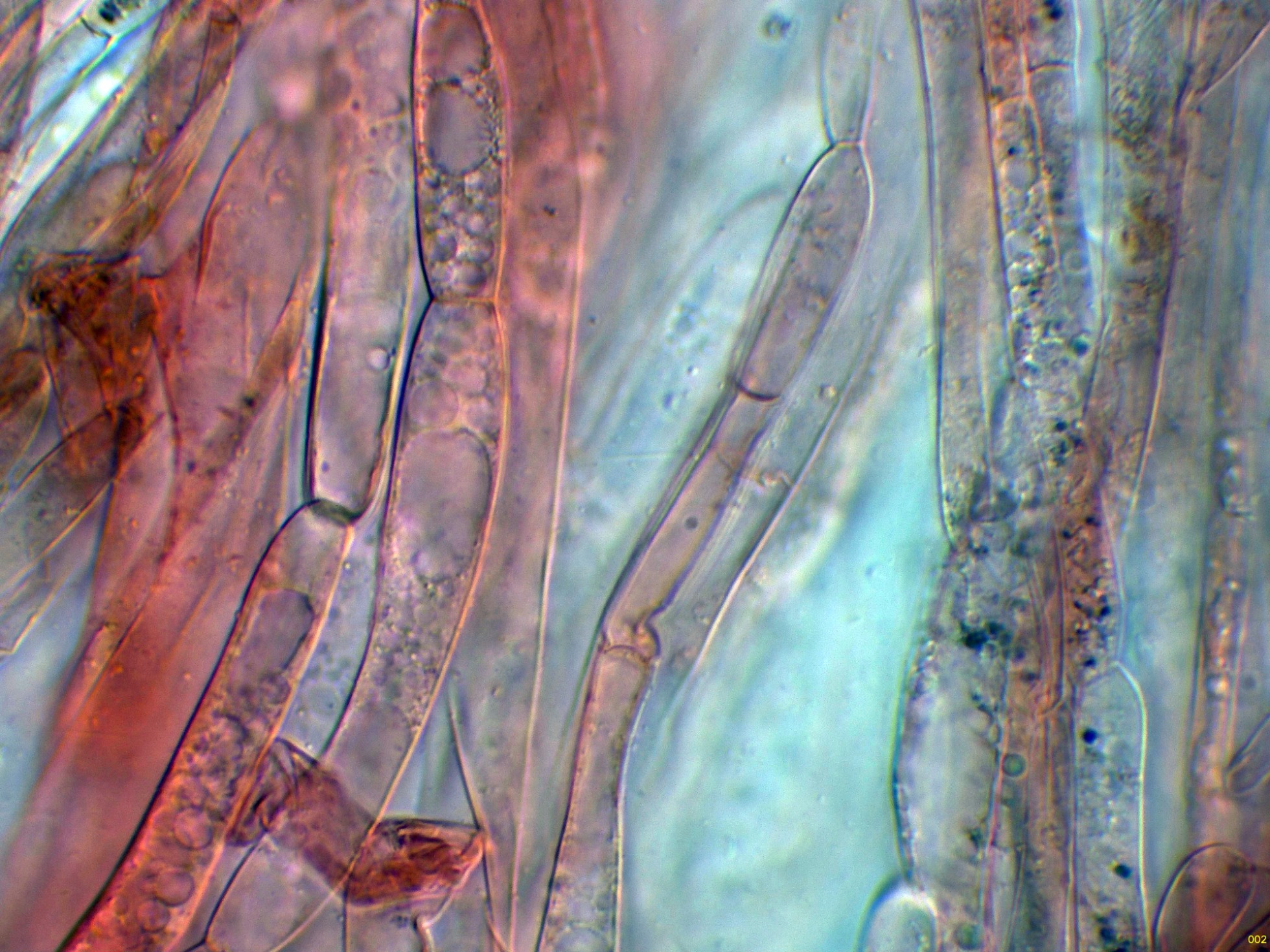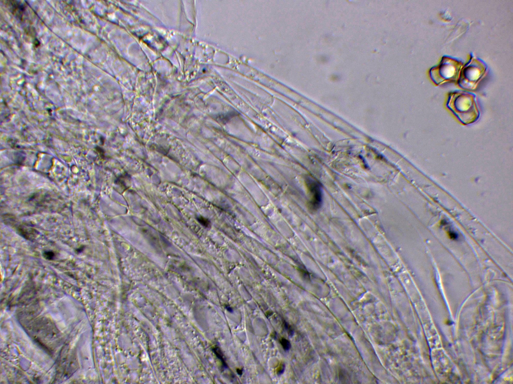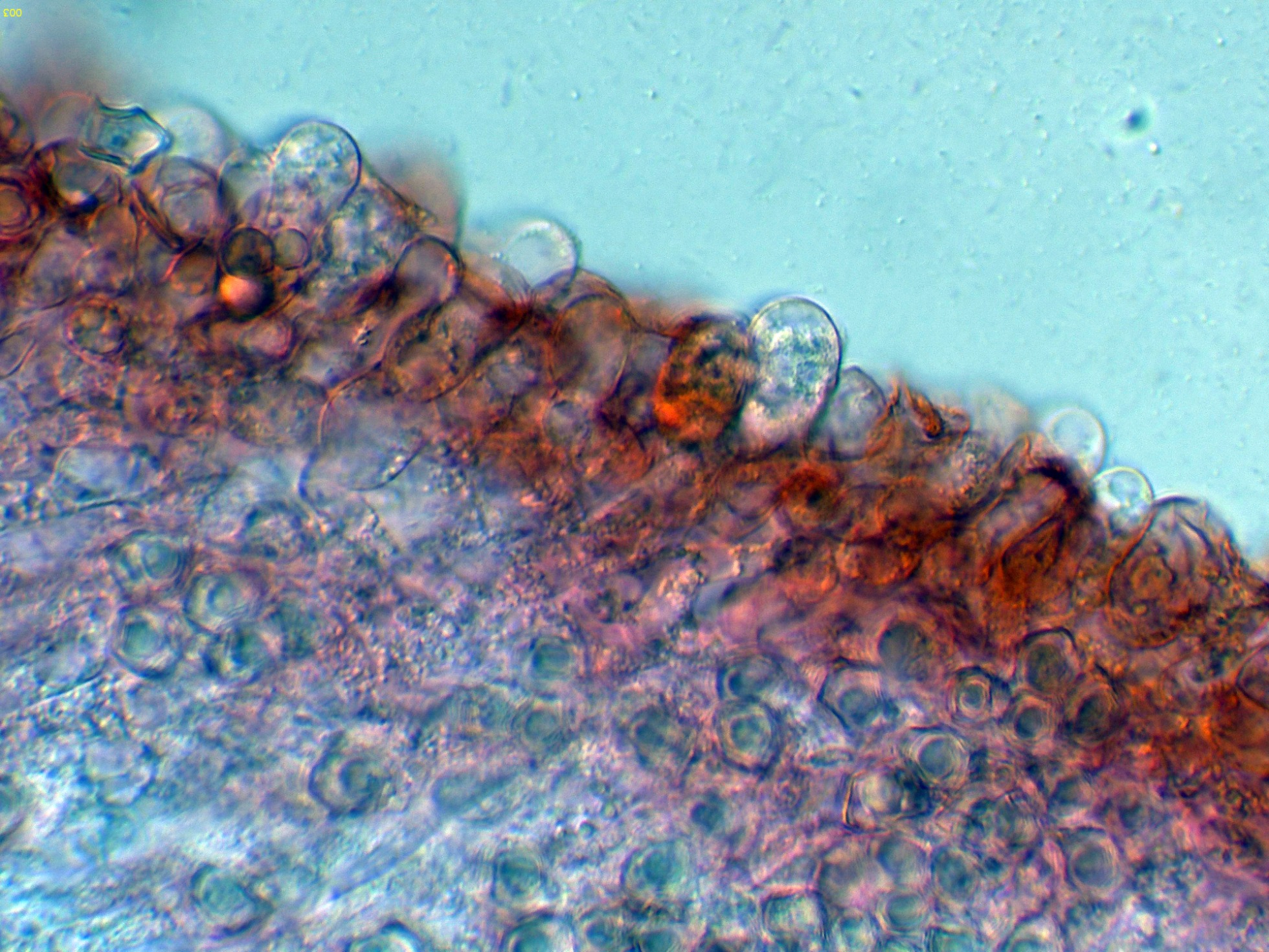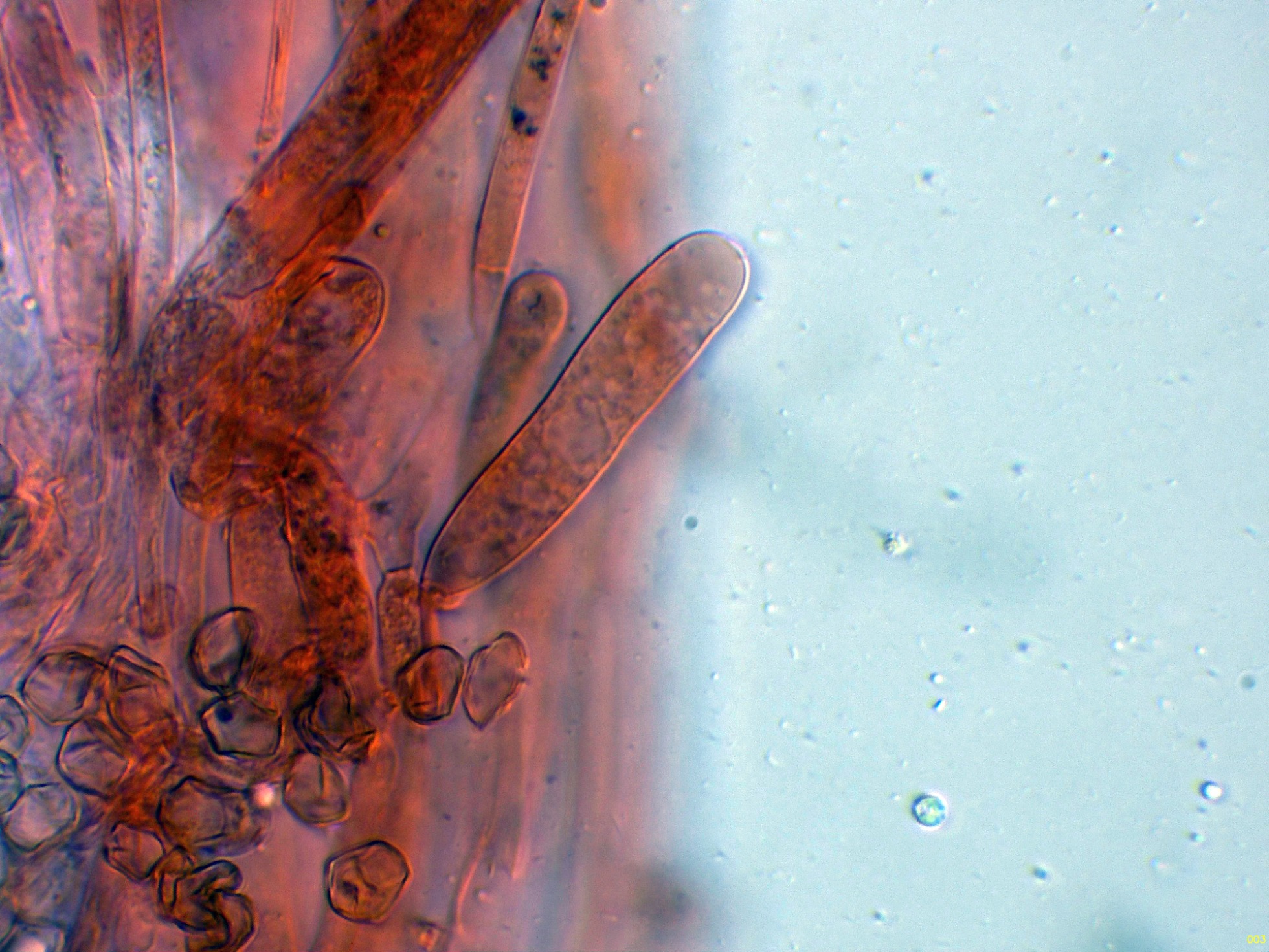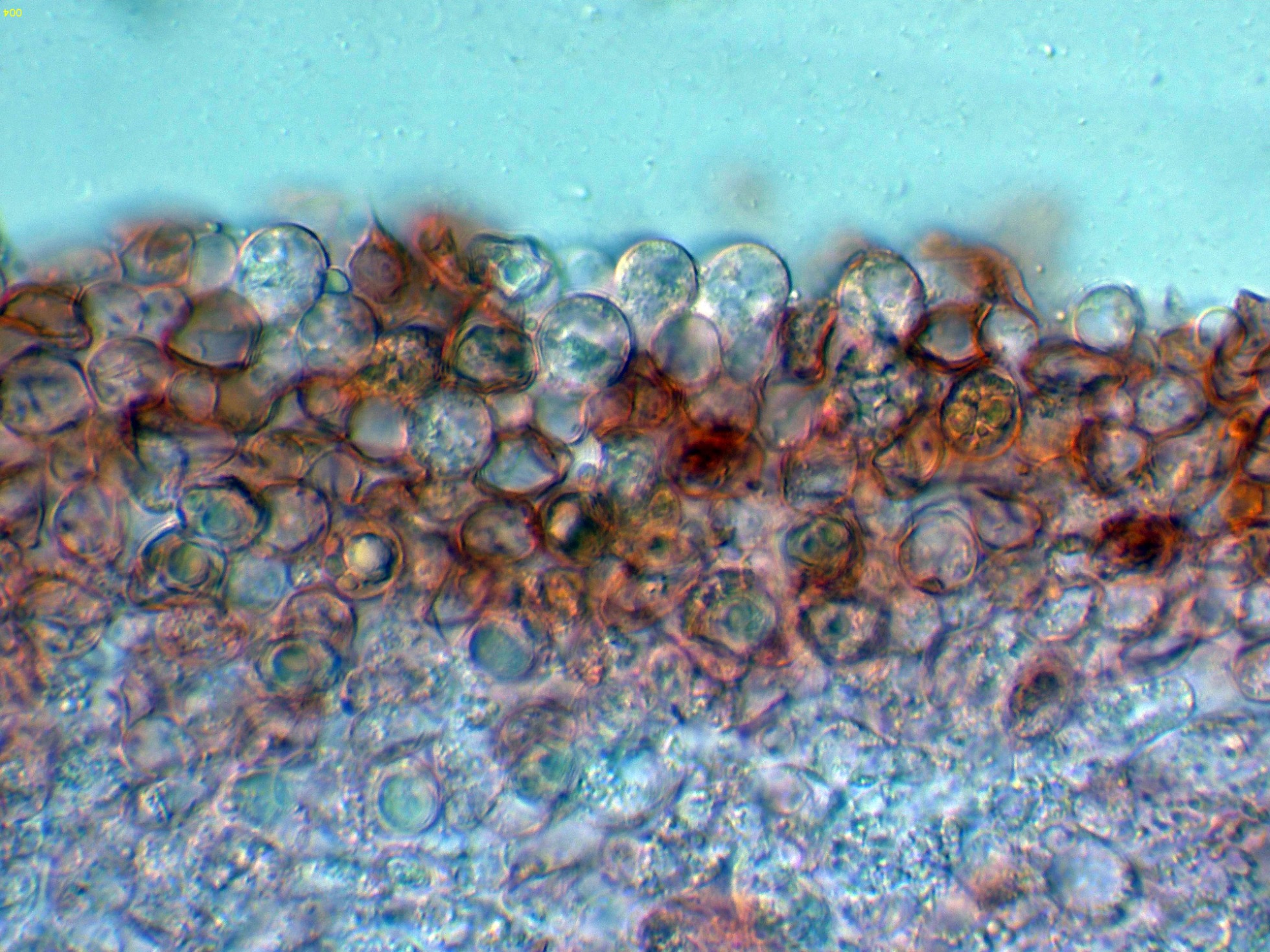 Suprapellis en agua a 400 aumentos, con abundantes hifas terminales a modo de pileocistidios con evidente pigmento intracelular, en especial en el centro del sombrero, y con unas medidas de (29.4) 35.2 - 48.6 (62.4) × (14.3) 16 - 22 (24.5) µm: