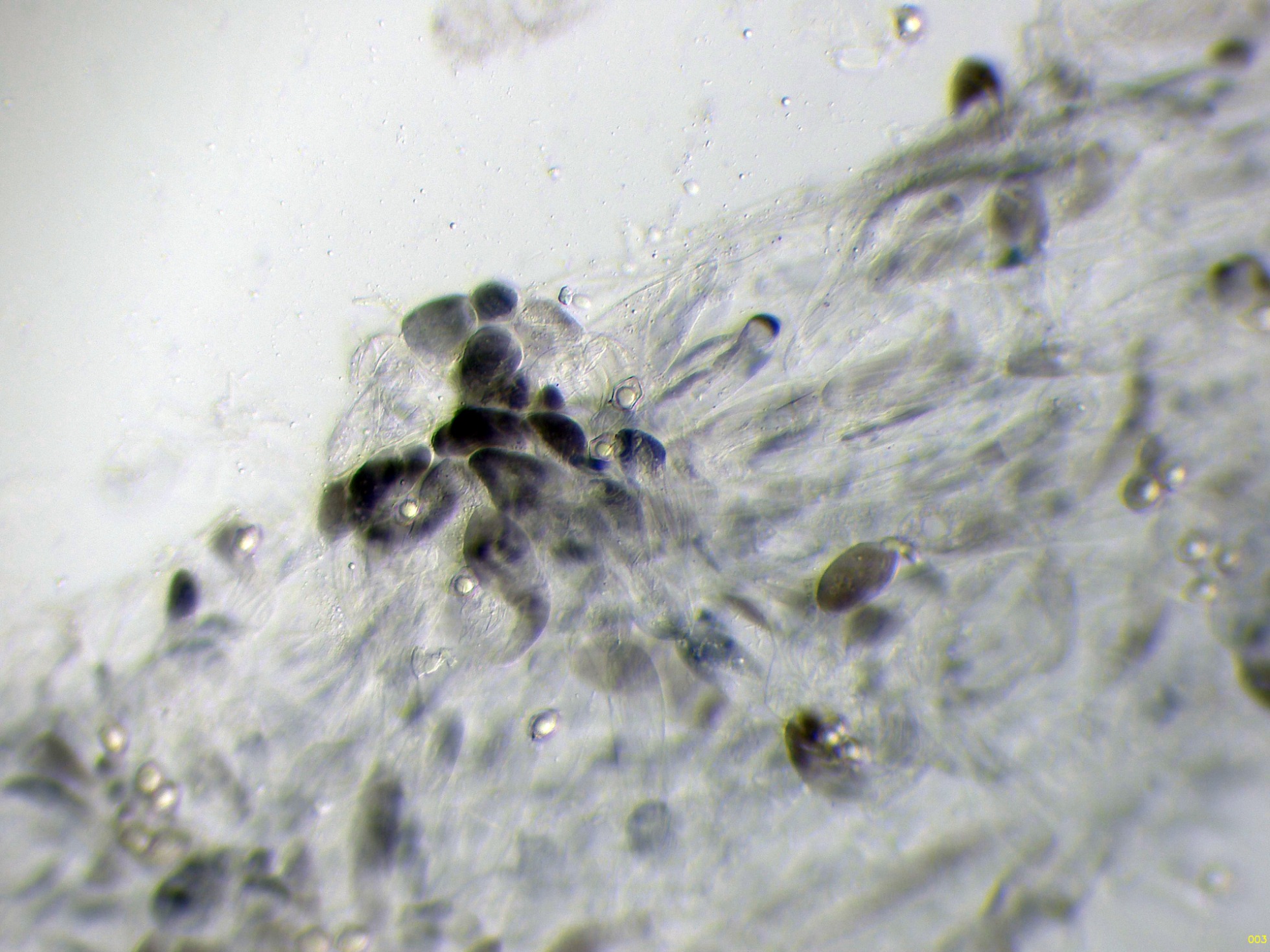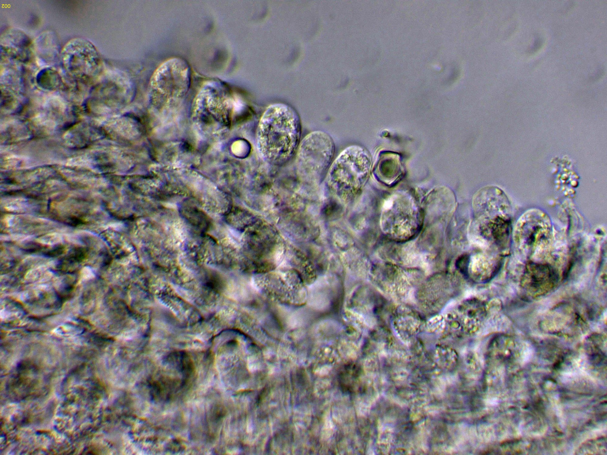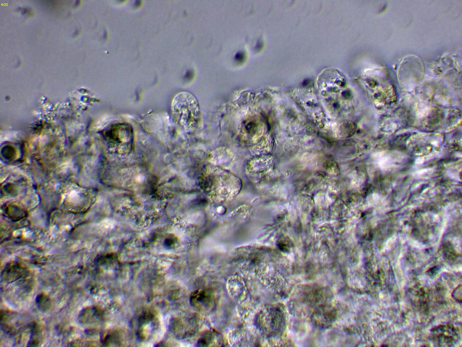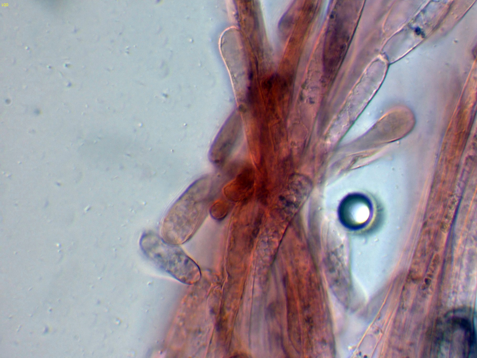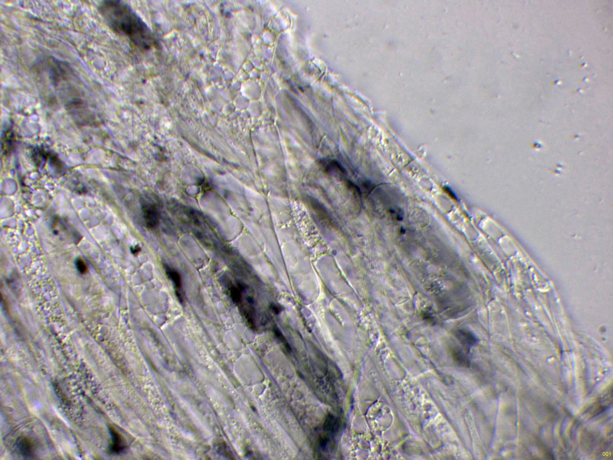 Suprapellis en agua a 400 aumentos, con abundantes hifas terminales a modo de pileocistidios con evidente pigmento intracelular, en especial en el centro del sombrero, y con unas medidas de (29.4) 35.2 - 48.6 (62.4) × (14.3) 16 - 22 (24.5) µm: