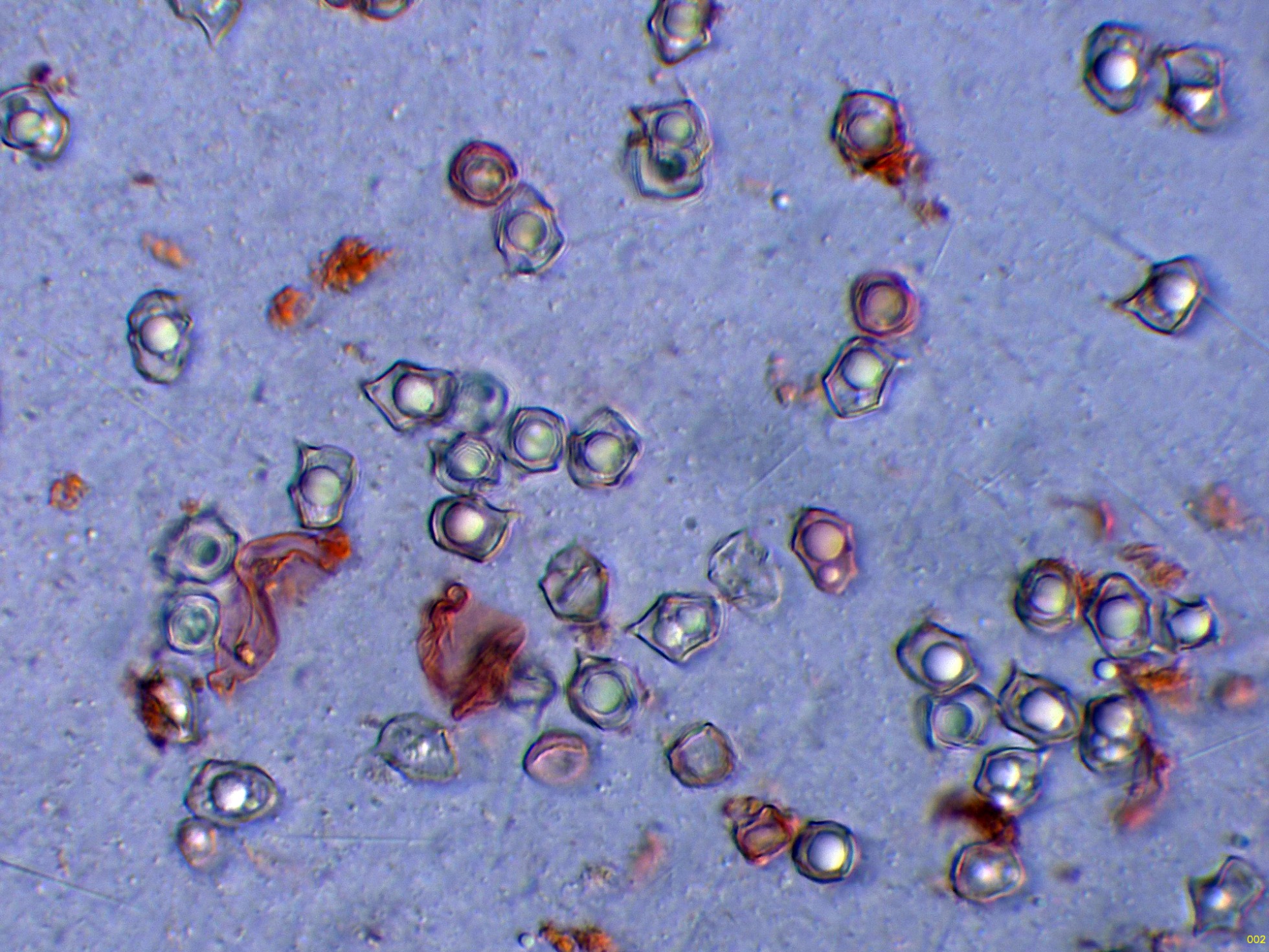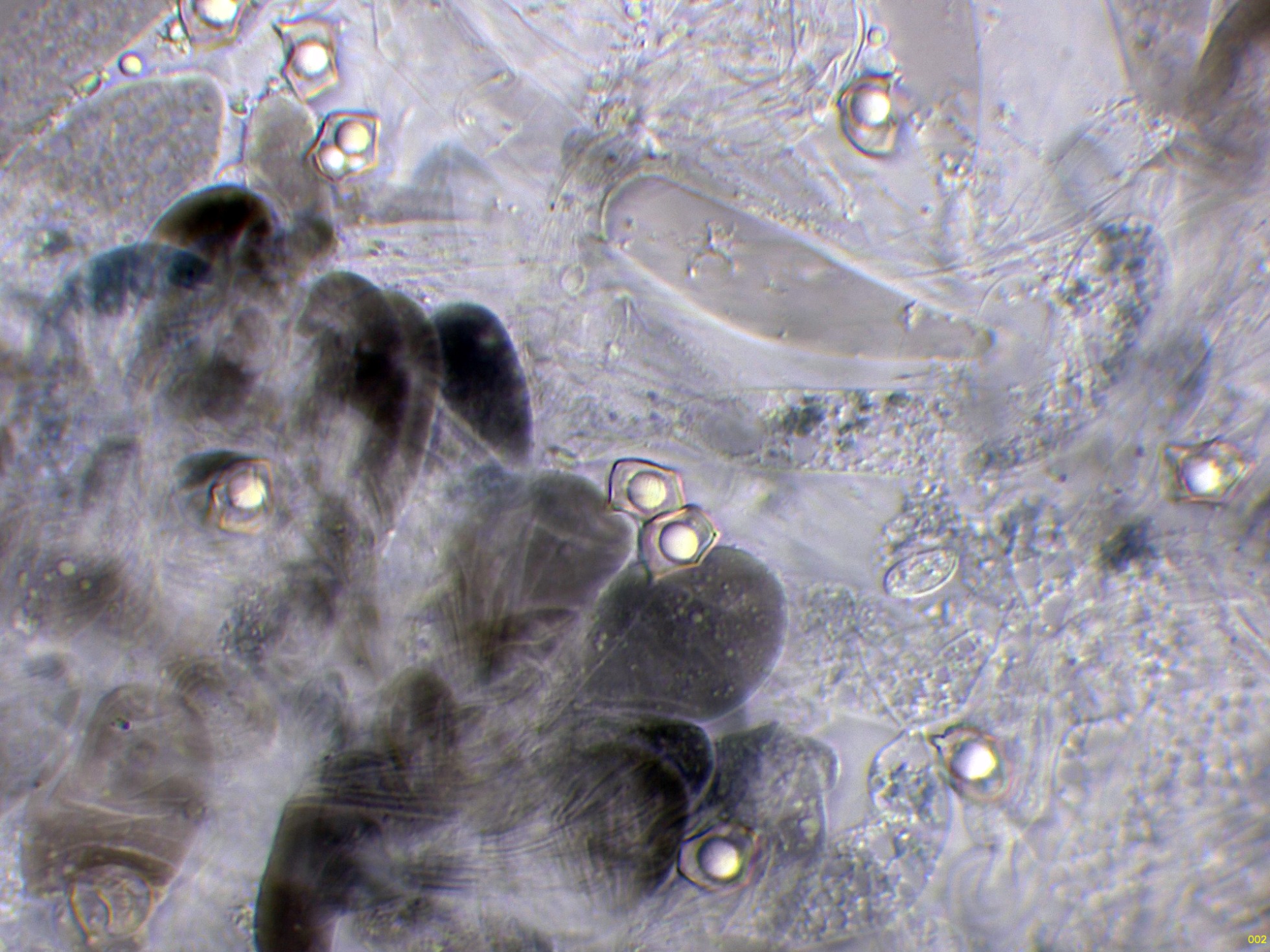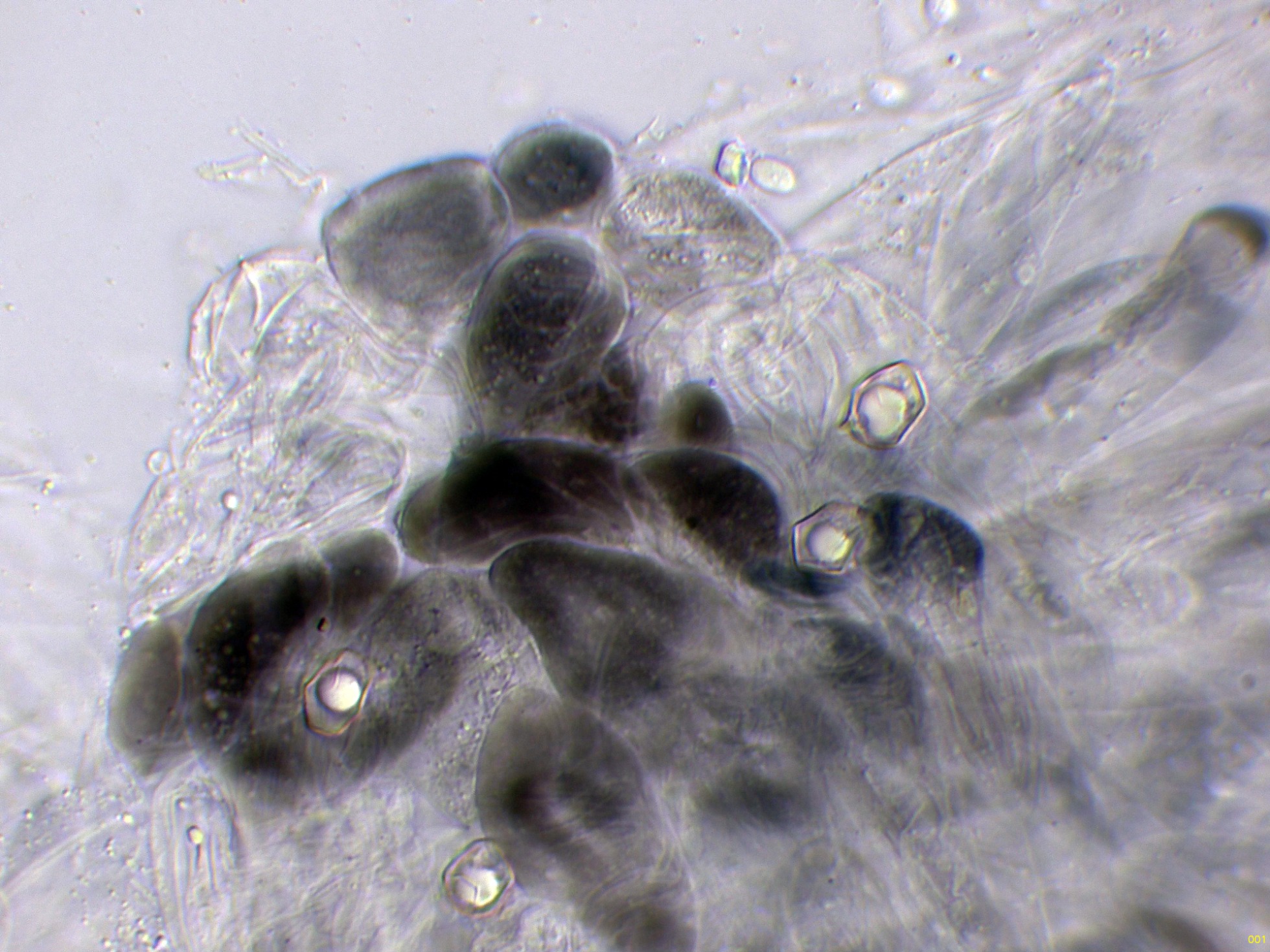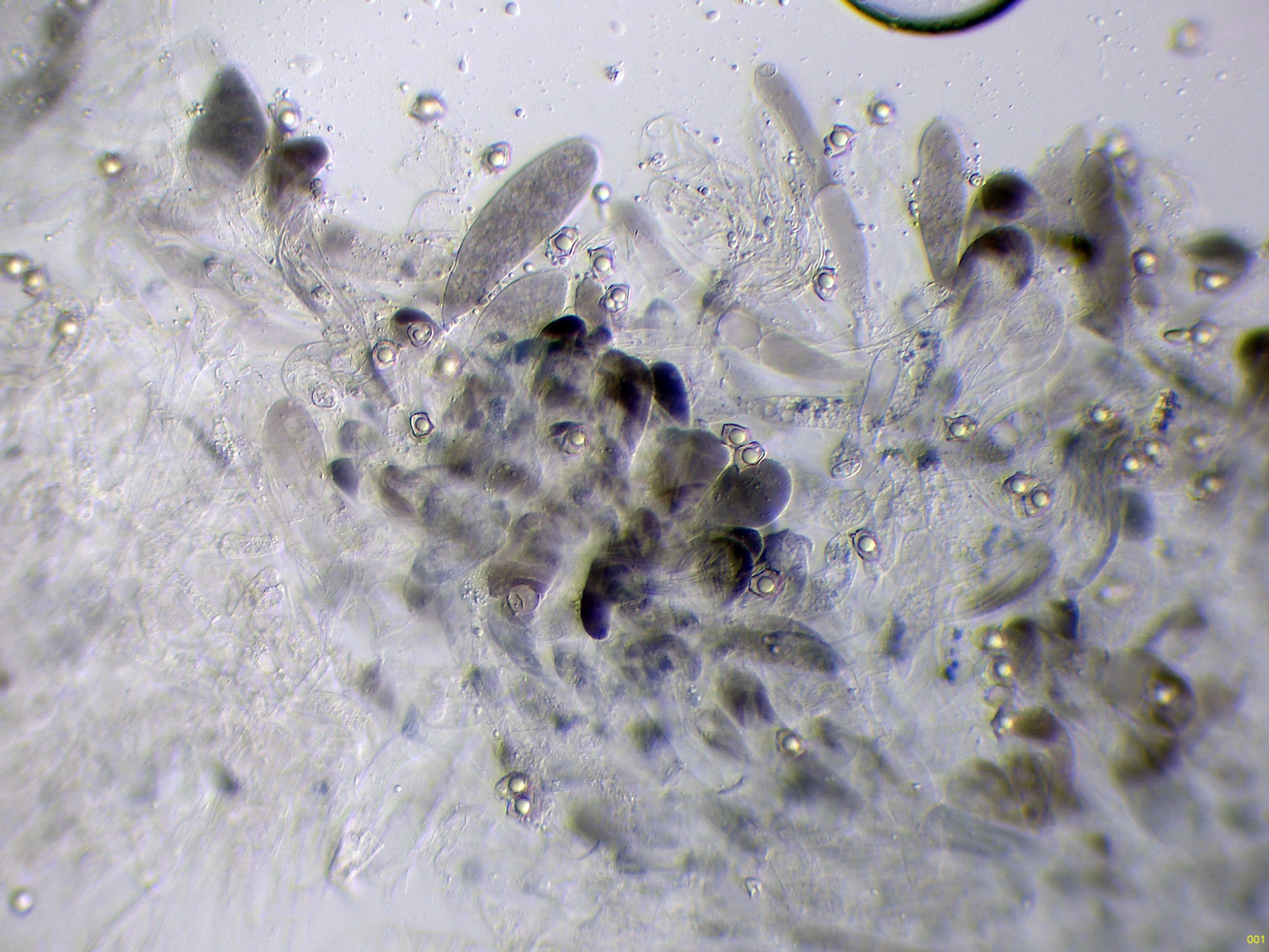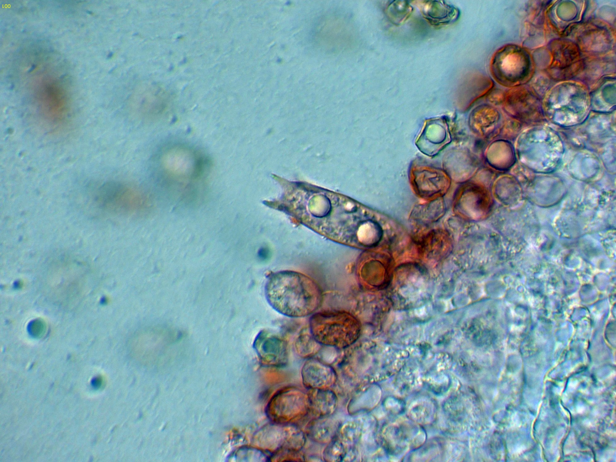 Suprapellis en agua a 400 aumentos, con abundantes hifas terminales a modo de pileocistidios con evidente pigmento intracelular, en especial en el centro del sombrero, y con unas medidas de (29.4) 35.2 - 48.6 (62.4) × (14.3) 16 - 22 (24.5) µm:
