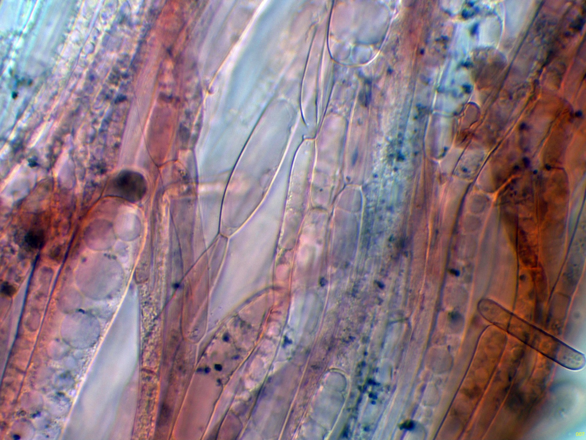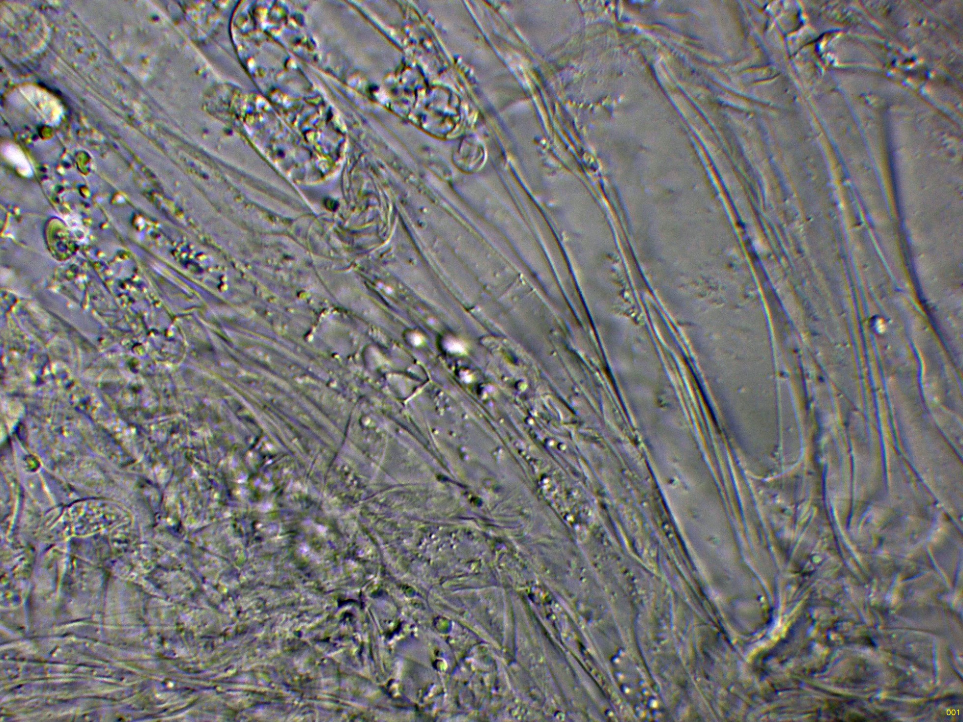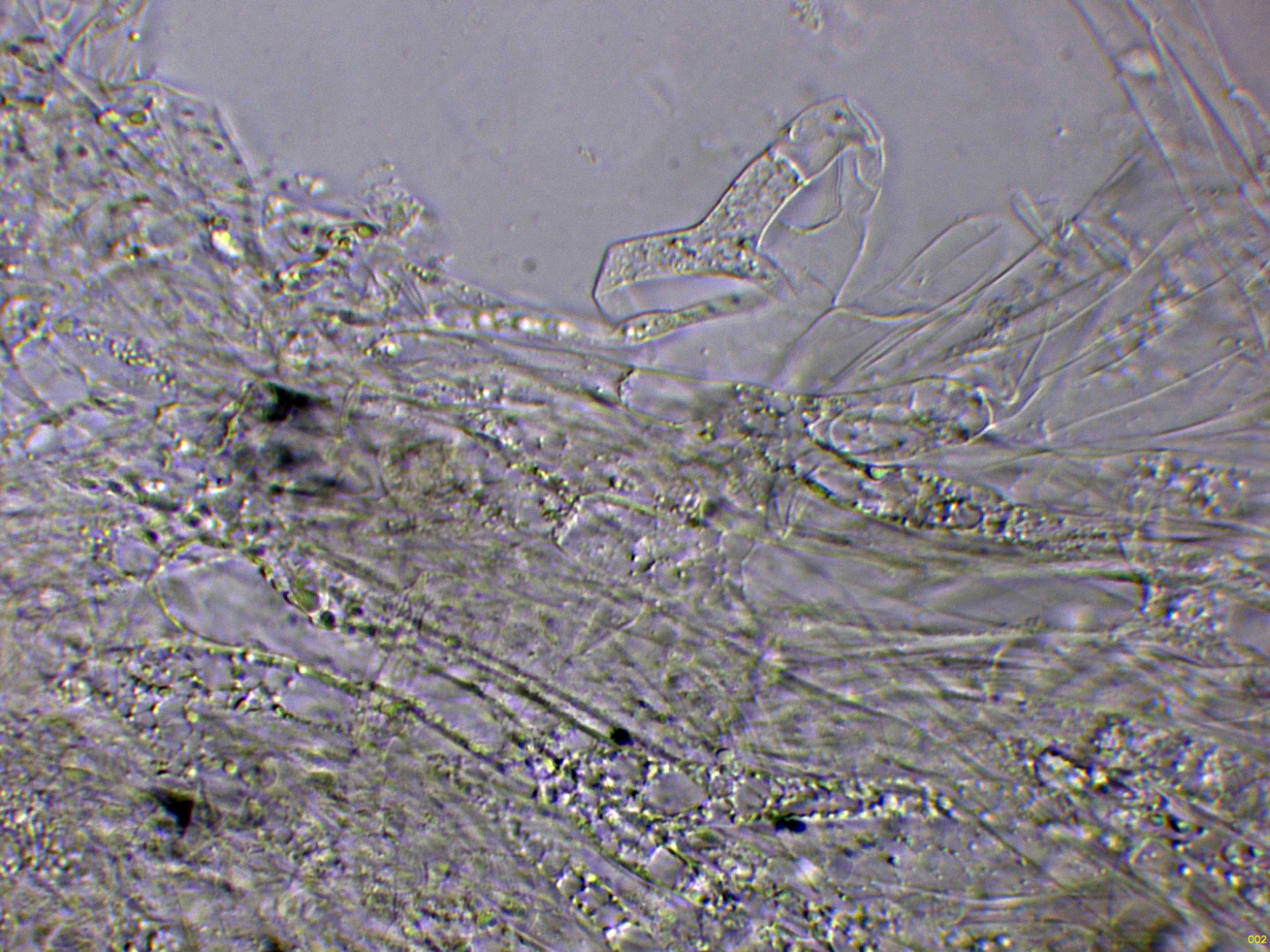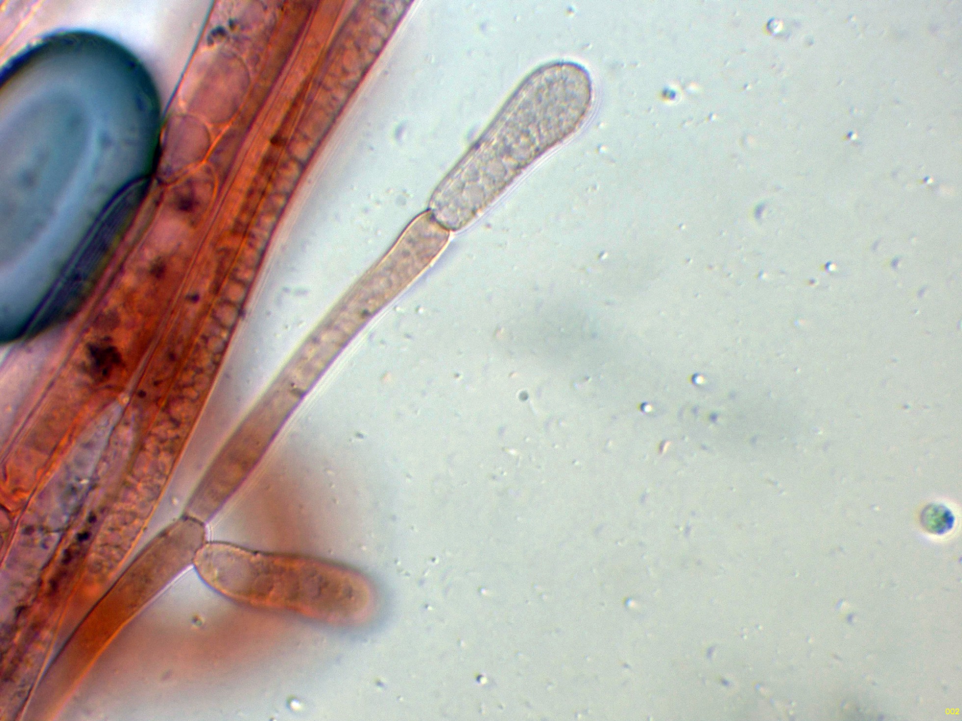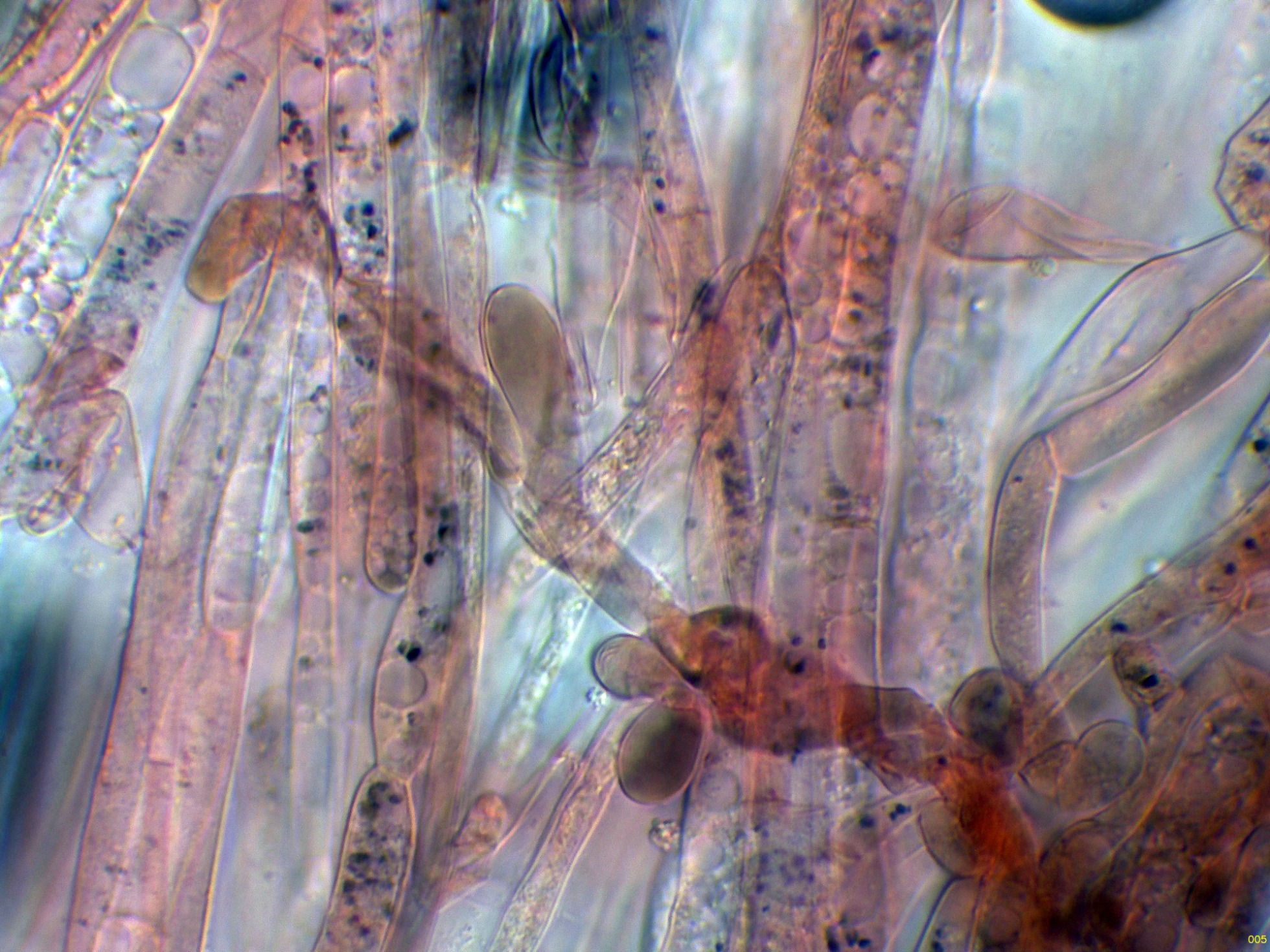 Por debajo de estos unas hifas ya más hialinas y filamentosas, en todos los casos con tabiques simples, sin fíbulas: