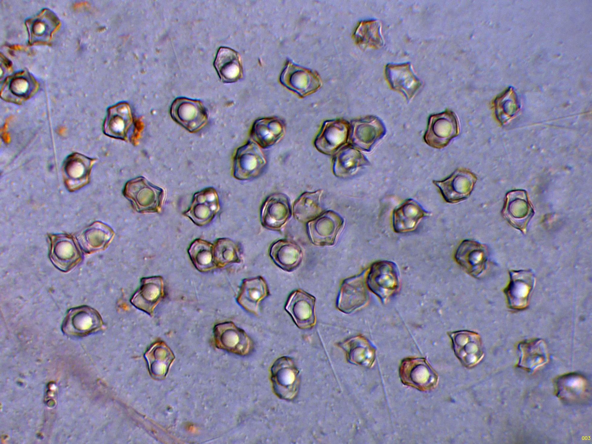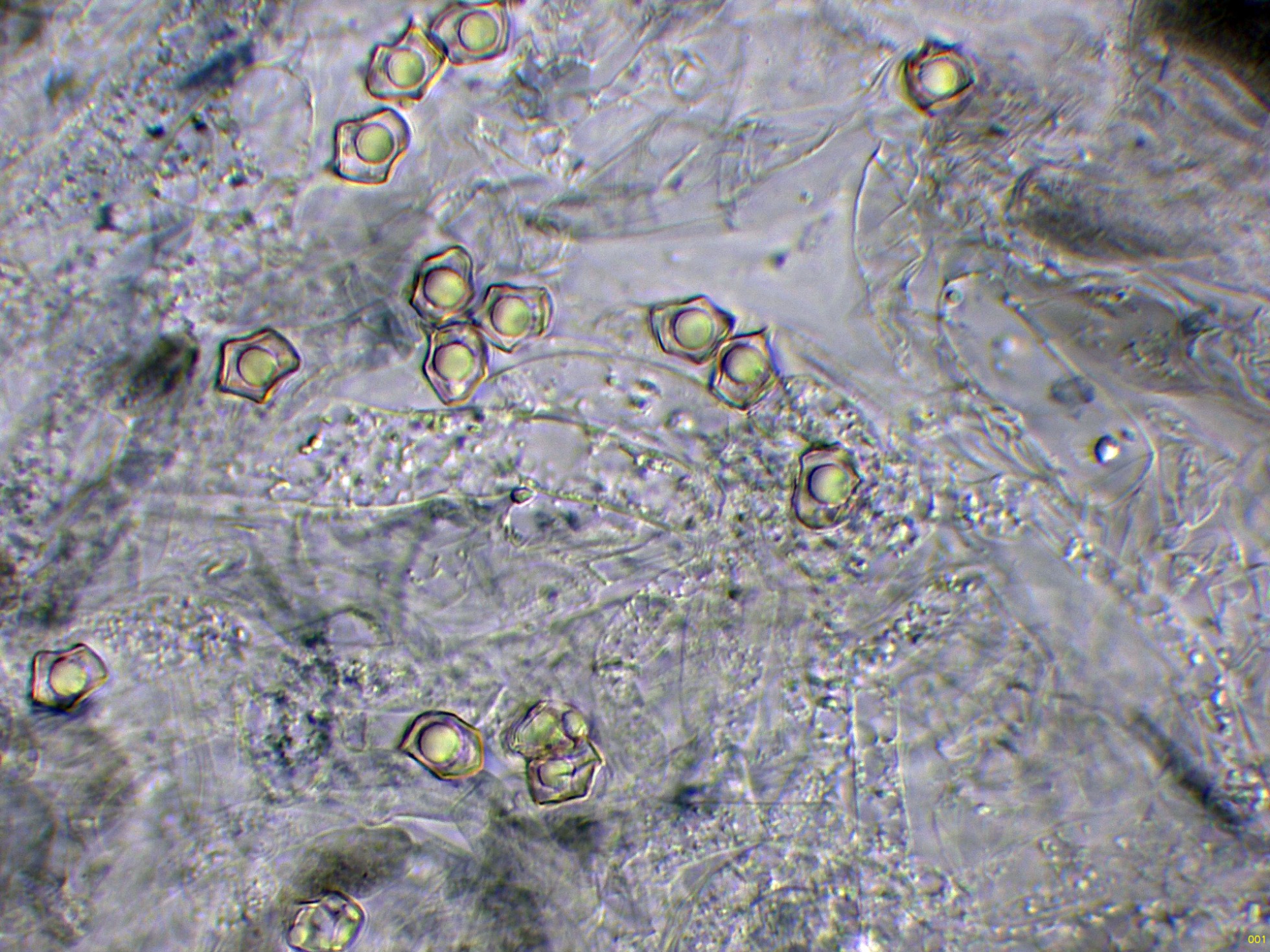 Estas esporas libres heterodiamétricas, con 5 a 7 caras y con unas medidas de: