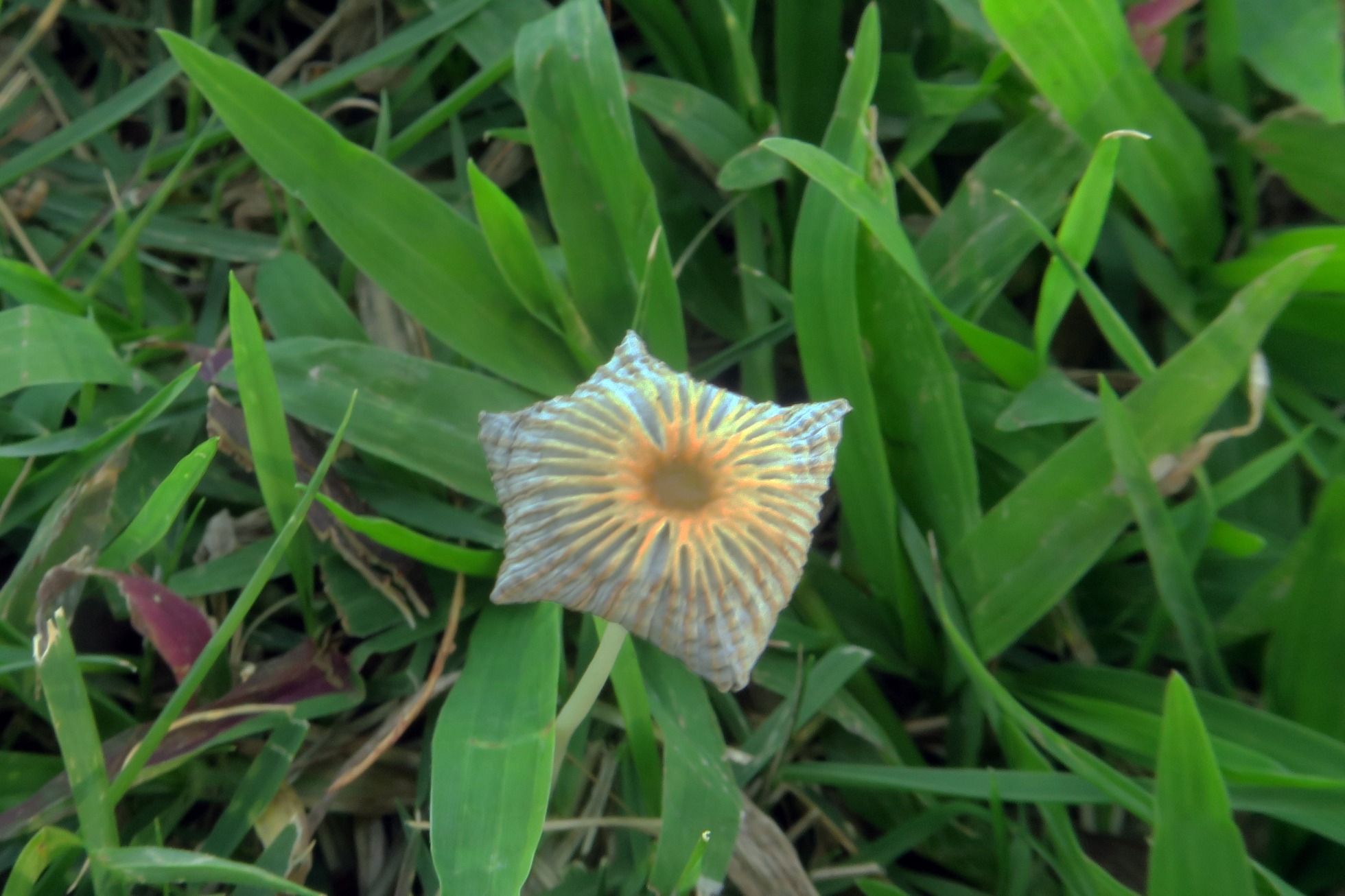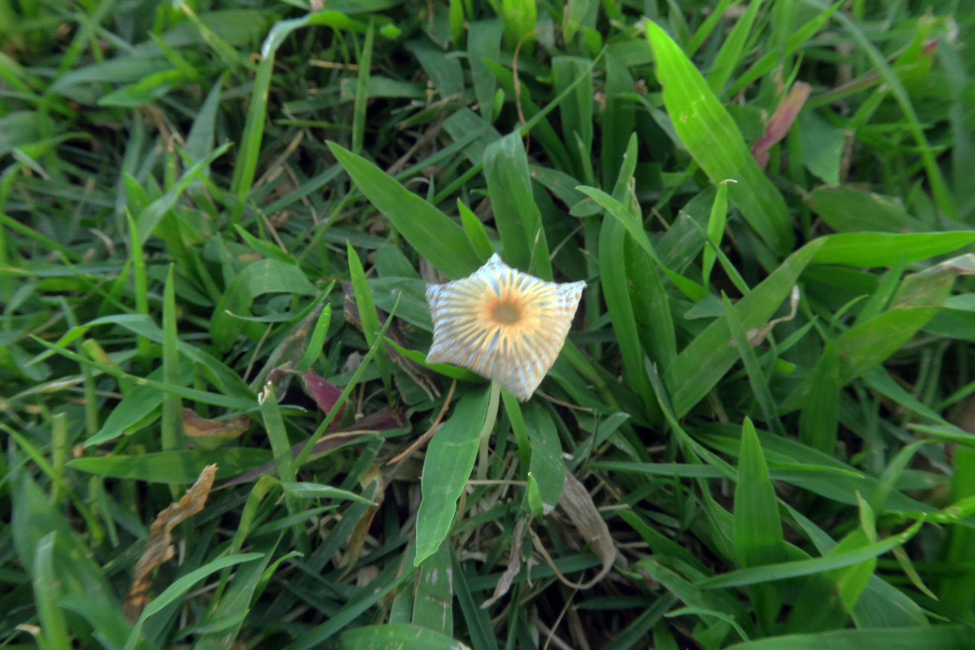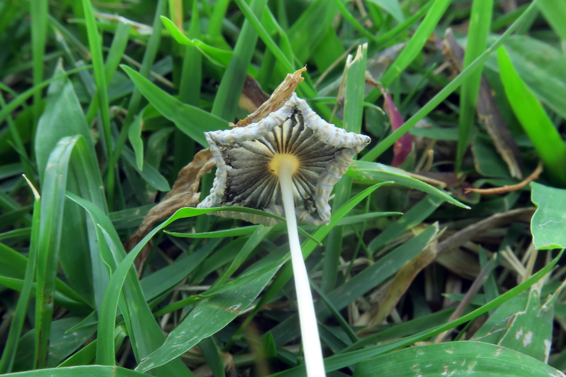 Un solo ejemplar de Parasola fotografiado el 24 de febrero, brotando en medio del césped en una zona ajardinada.