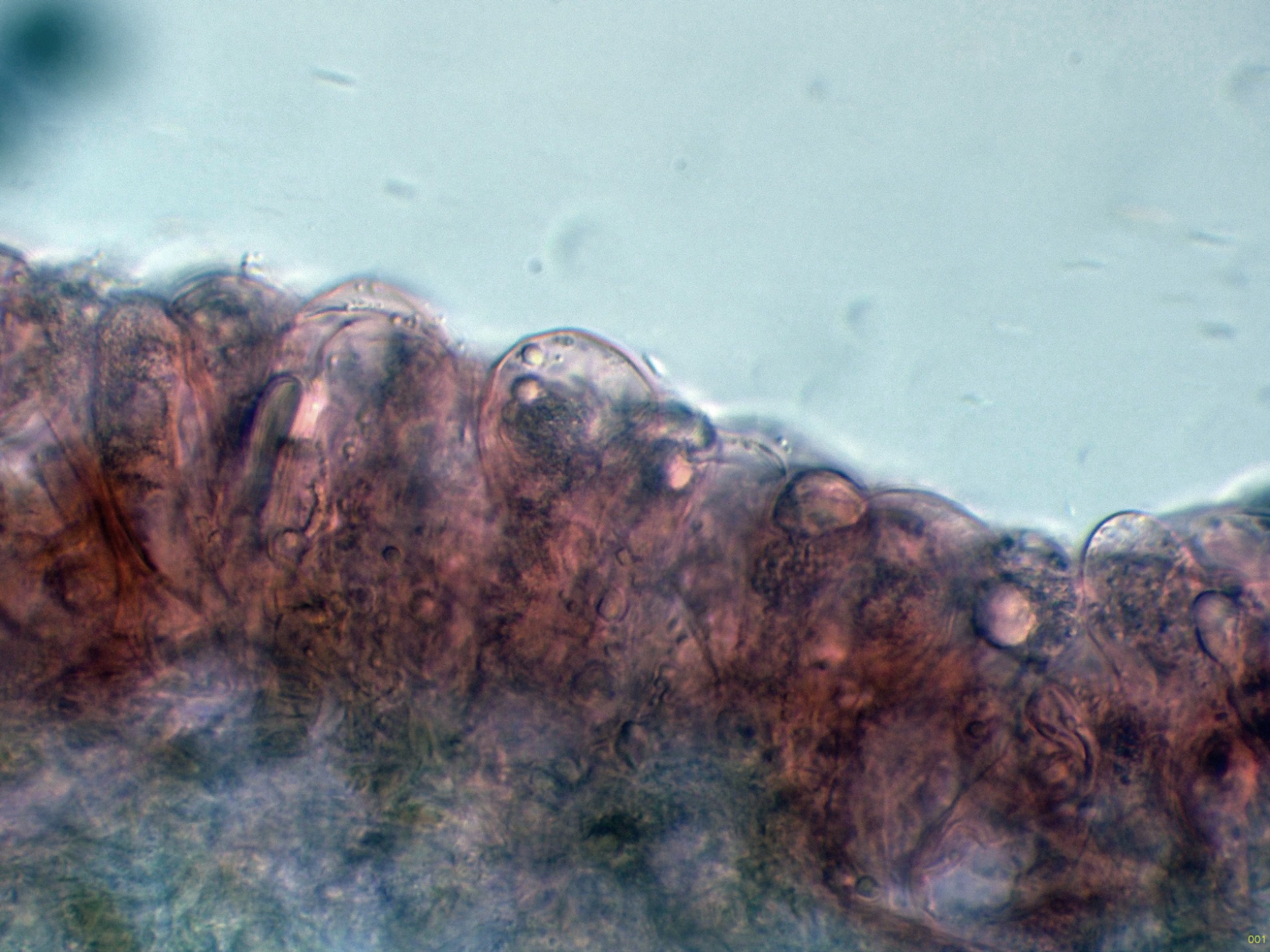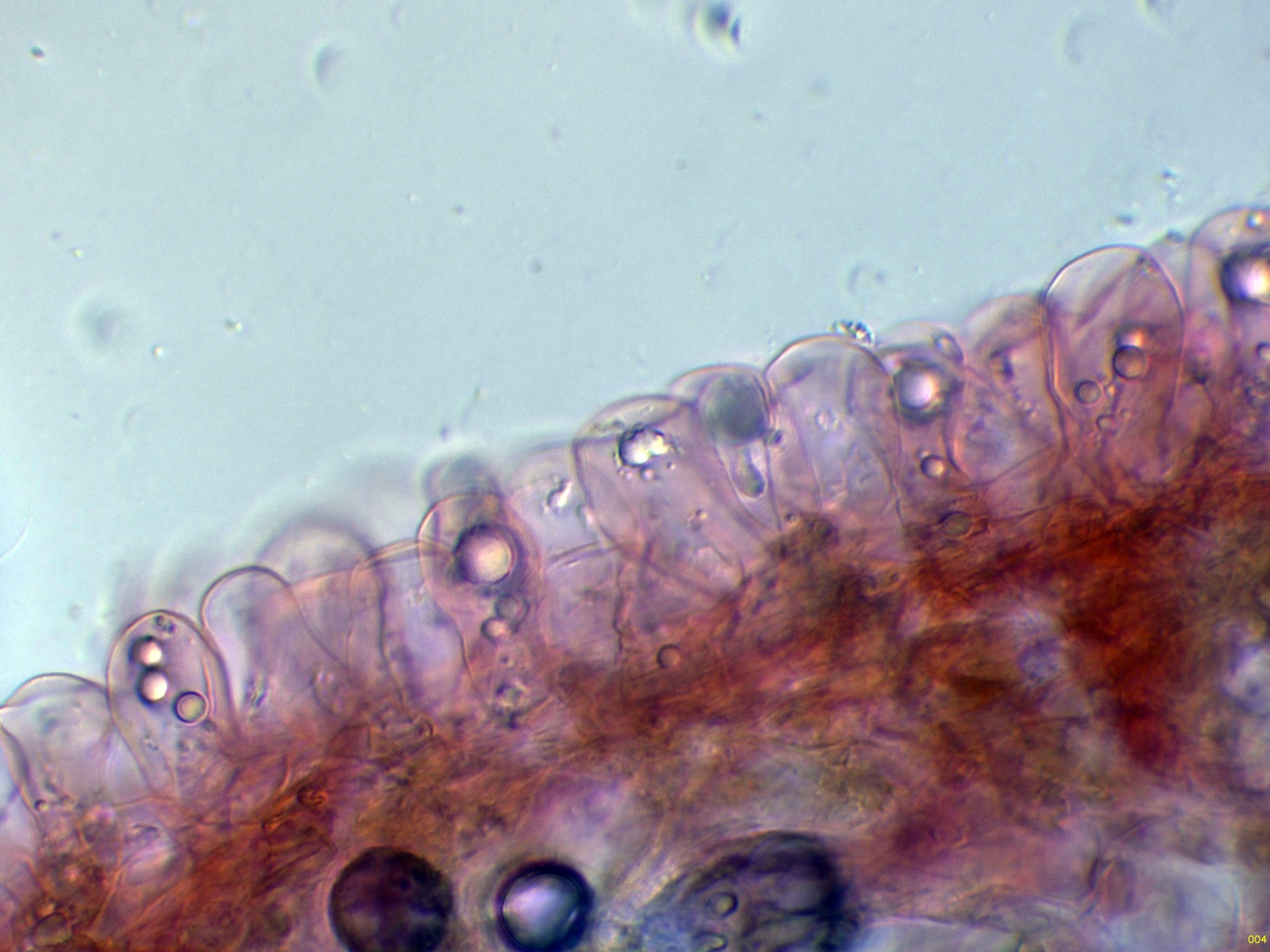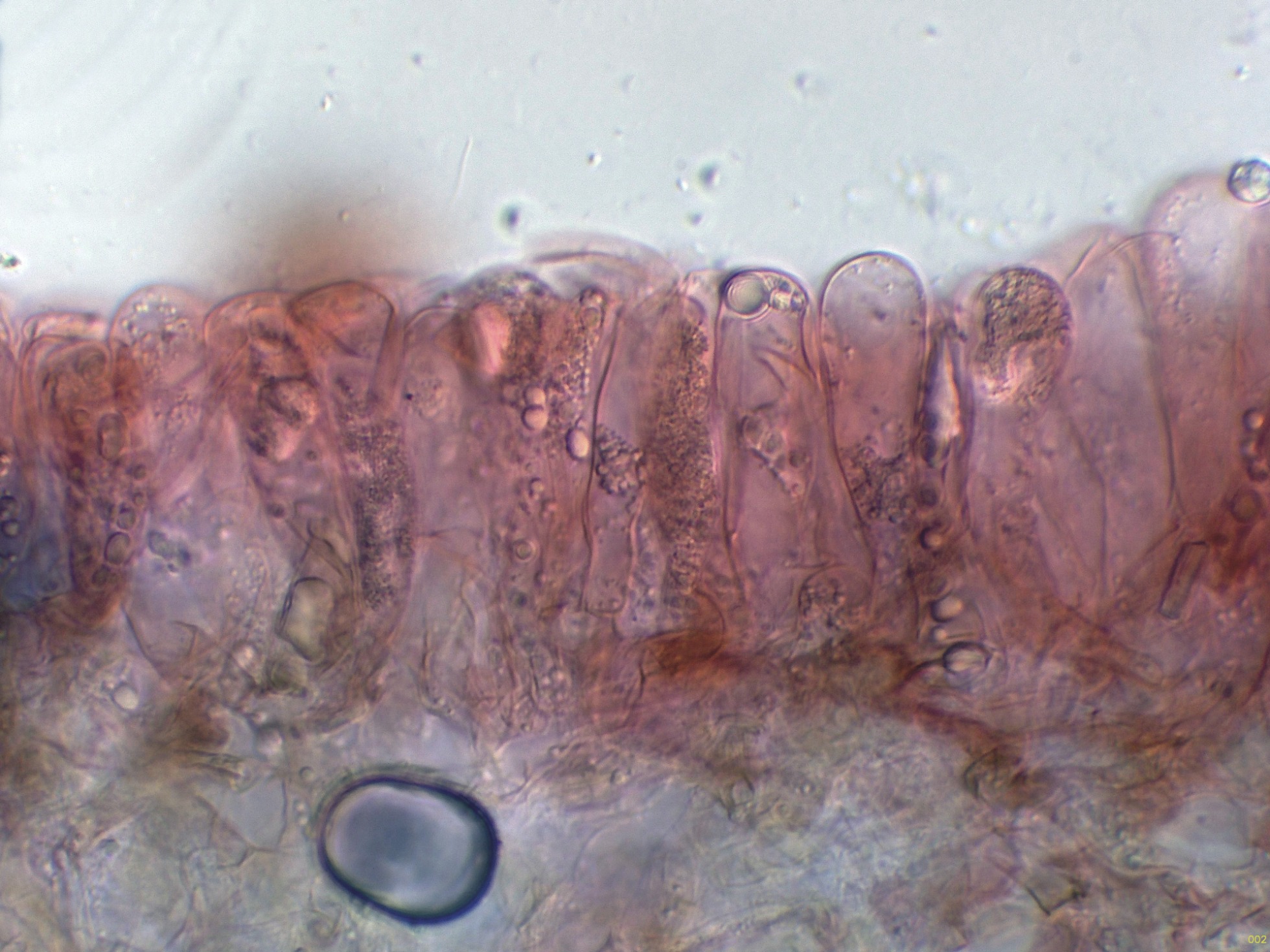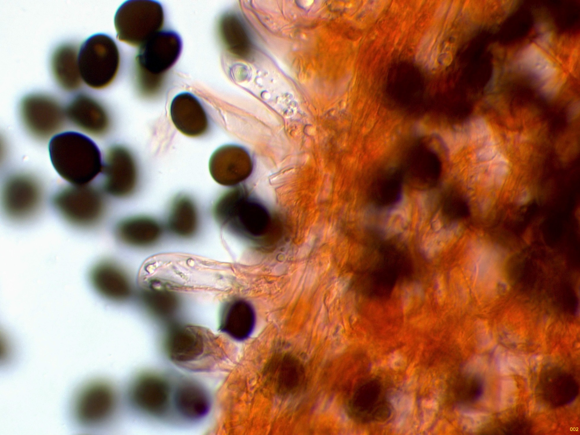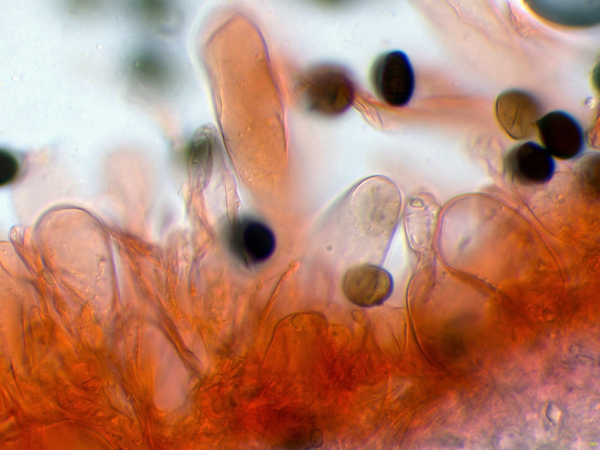Una de las características que definen a la Parasola schroeteri, son las hifas de la suprapellis, con una capa de hifas clavadas, entre cilíndricas y piriformes: