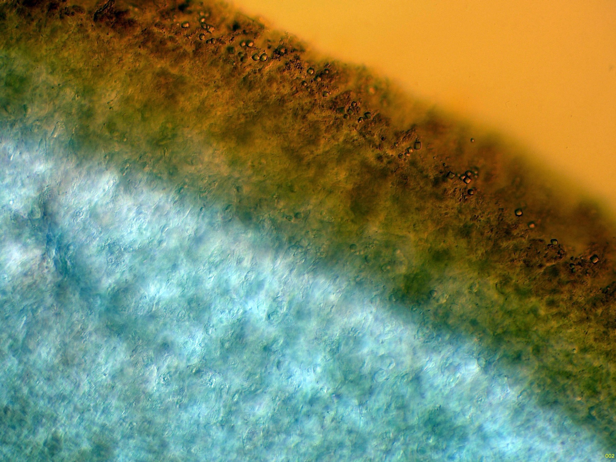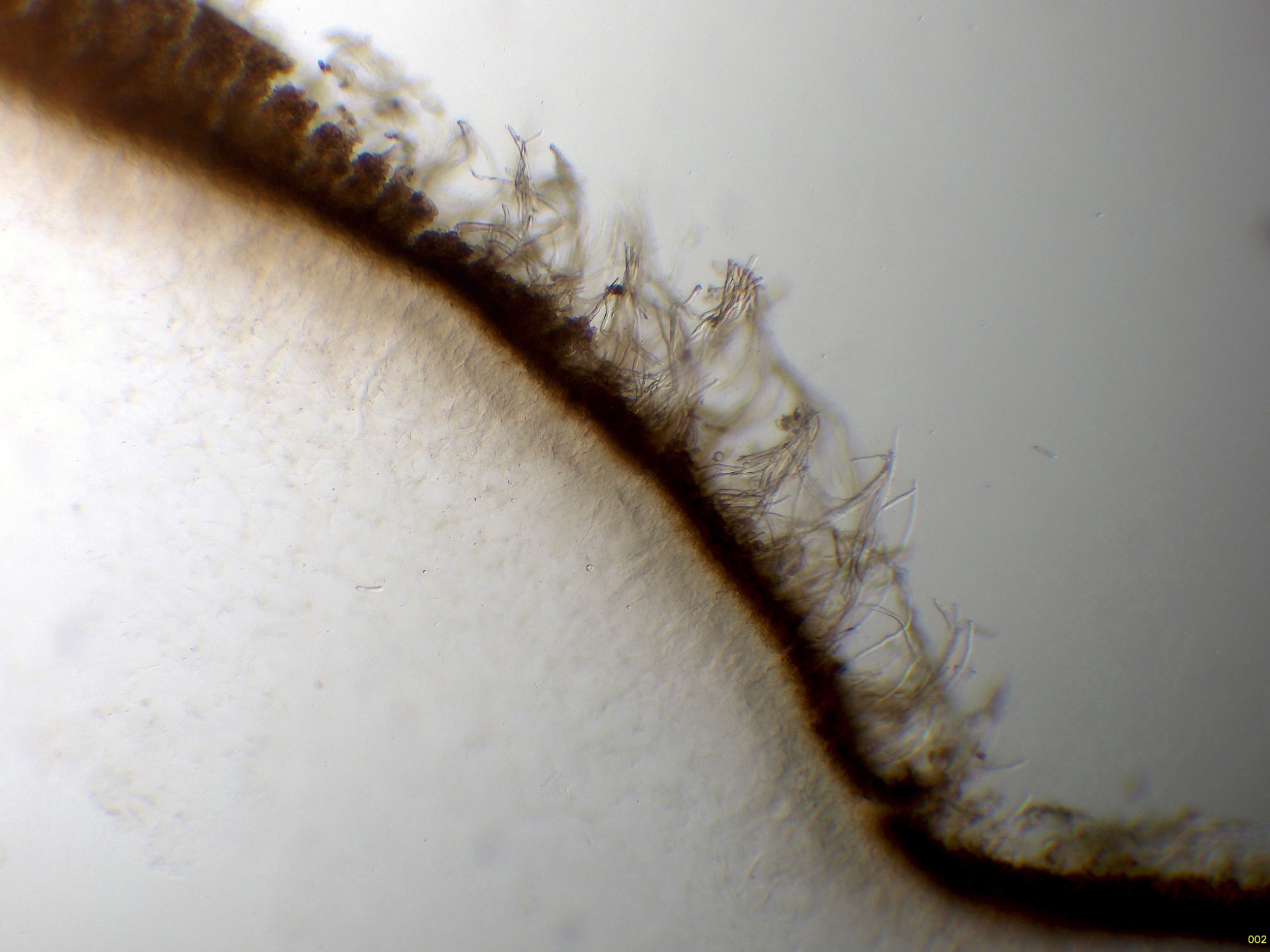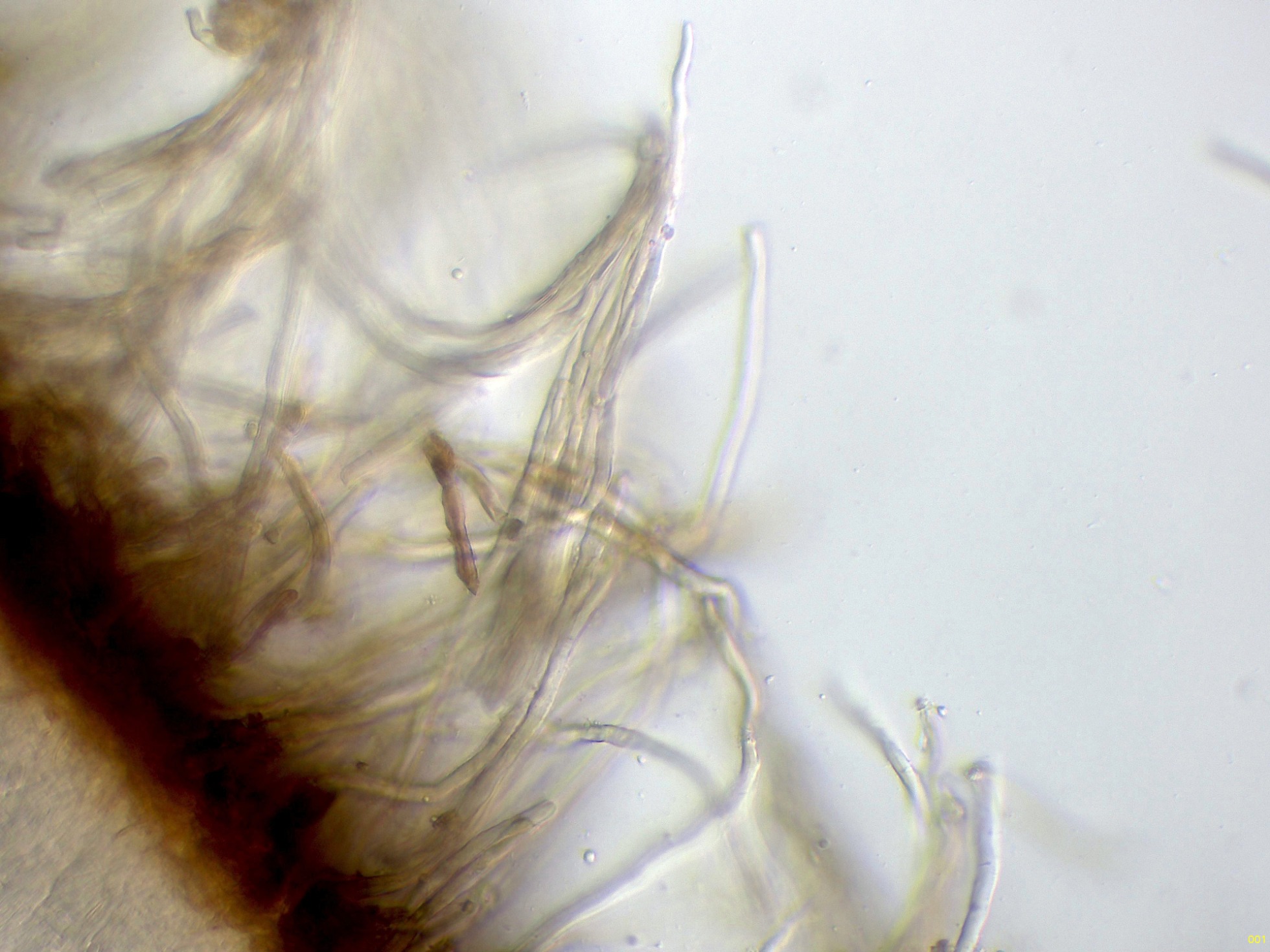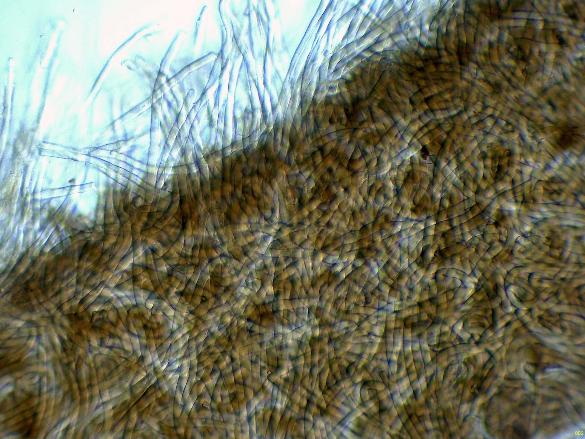 Sección del basidioma a 40 aumentos en agua, con unos pelos con unas medidas de 194 - 296 x 6.7 - 7.4 micras.