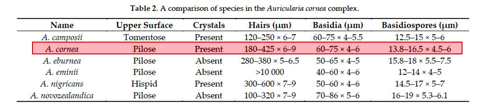 Determinación hecha siguiendo la información del documento "Global Diversity and Updated Phylogeny of Auricularia (Auriculariales, Basidiomycota)" , en el que con superficie ligeramente pilosa, cristales presentes, pelos de entre 180 a 425 micras y esporas con unas medidas de 13.8–16.5 × 4.5–6 µm., conducen a la Auricularia cornea propuesta, dejo una captura de pantalla con las Claves:
