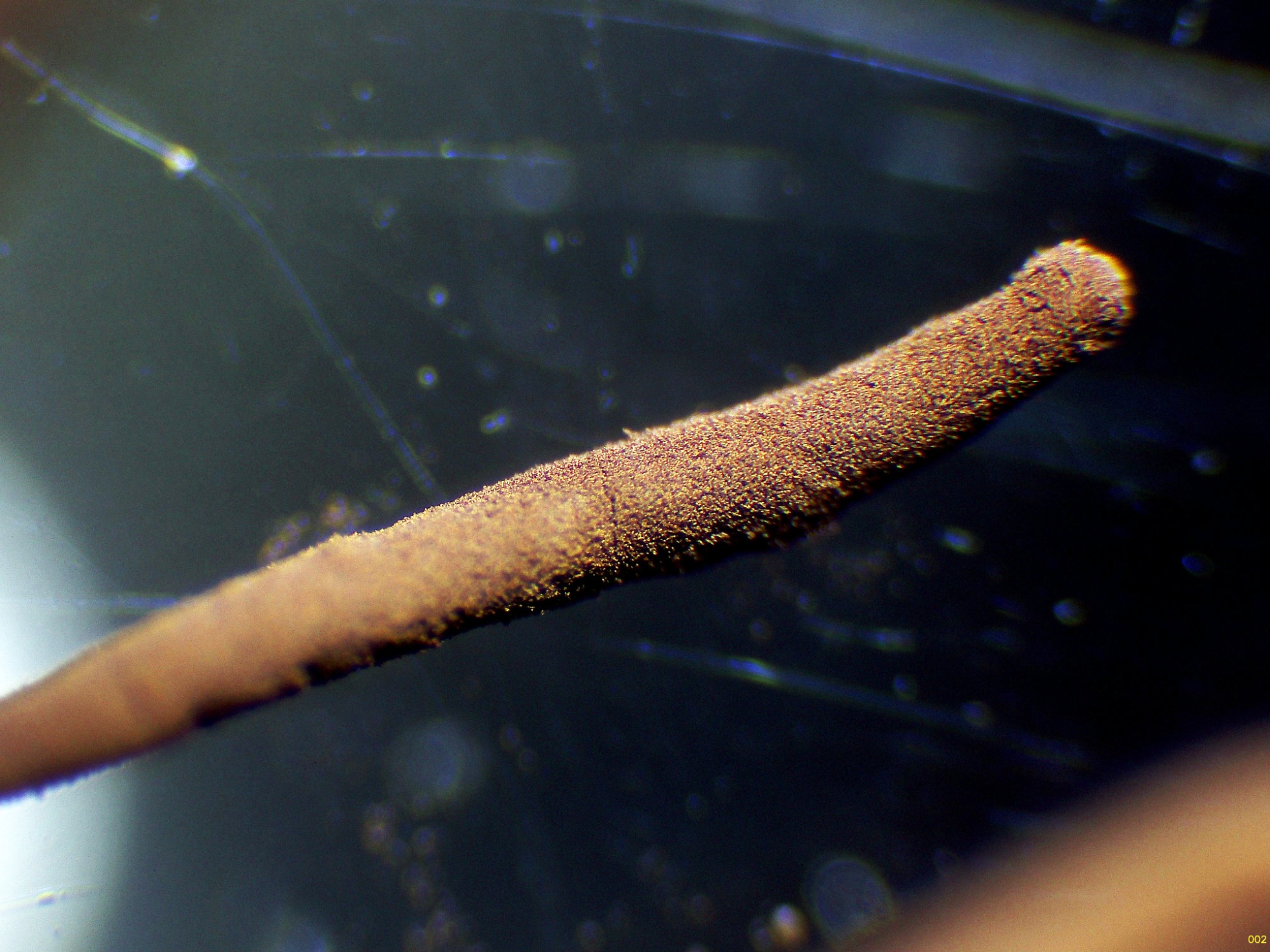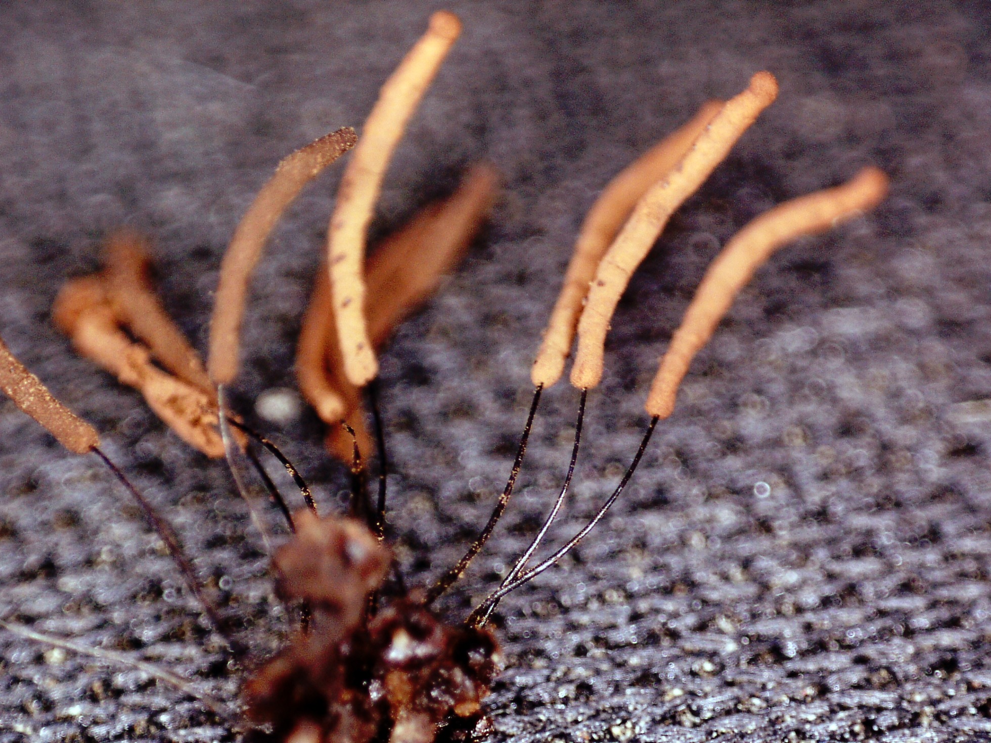 "Esporocarpos estipitados, agrupados, hasta 9 mm de altura total. esporoteca cilíndrica, con la base y el ápice redondeados, hasta 5,5 mm de longitud, marrón-rojiza. Hipotalo membranáceo, común a todo el grupo, plateado o marrón oscuro. Estípite negro, brillante, opaco al Mo, alcanzando los 3,5 mm de longitud o el 30-50% de la altura total del esporocarpo.