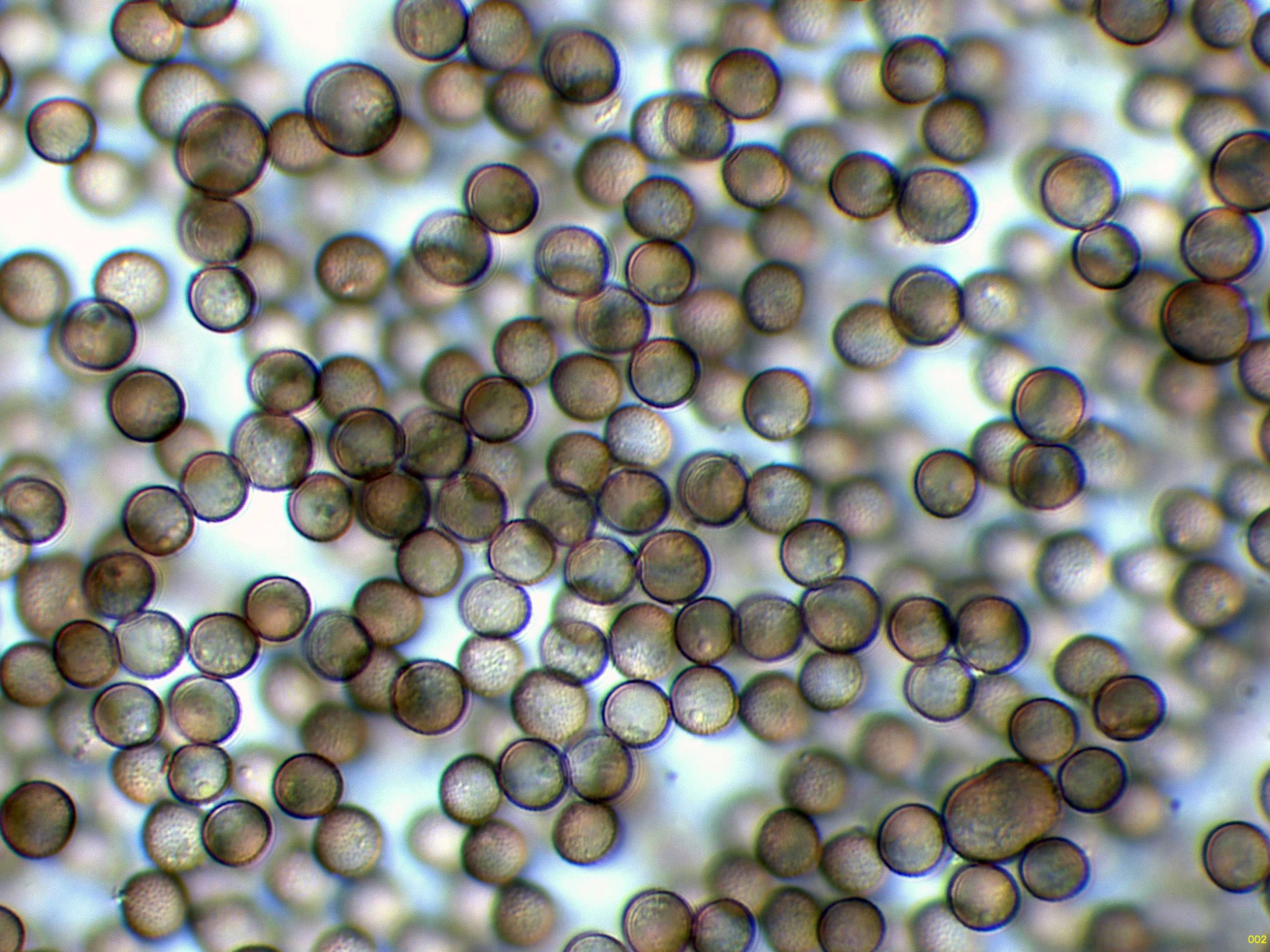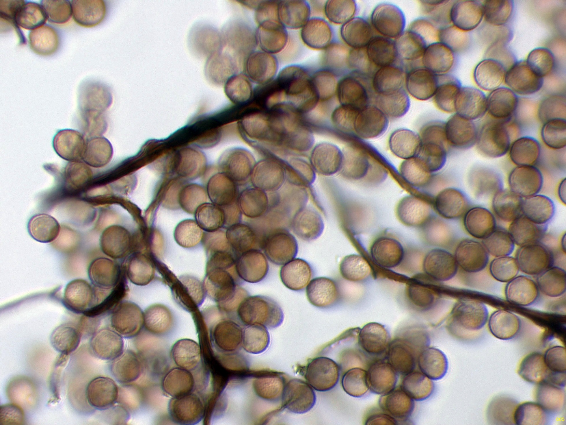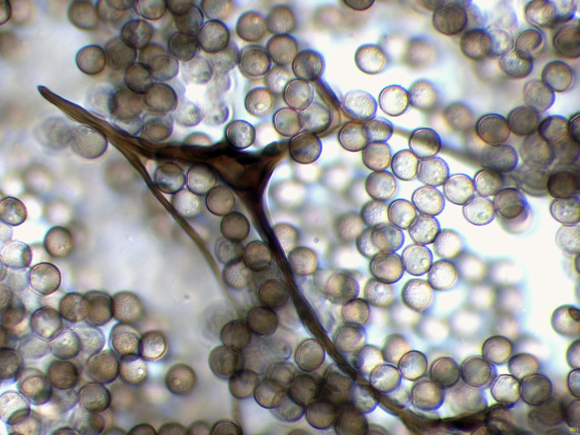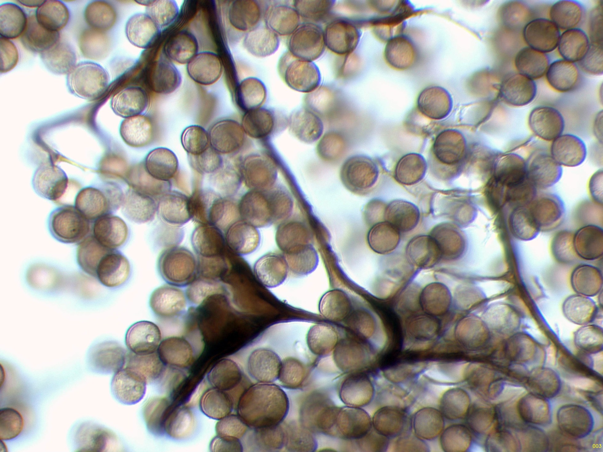 Peridio pronto evanescente. Columela casi negra, marrón oscura al Mo, fusionándose con el capilicio cerca del ápice de la esporoteca. Capilicio surgiendo todo a lo largo de la columela, con muchas ramas principales flexuosas, marrones-rojizas o marrones muy claras al Mo, ramificadas y anastomosadas, dando lugar a una intrincada red interna con 3-4 mallas/radio, y una red superficial bidimensional, algo flexuosa, con muchas espinas cortas. esporada en masa marrón-rojiza, marrón-grisácea al Mo, 6-8 μm de diám., subglobosas, densamente verrugosas. Plasmodio desconocido.