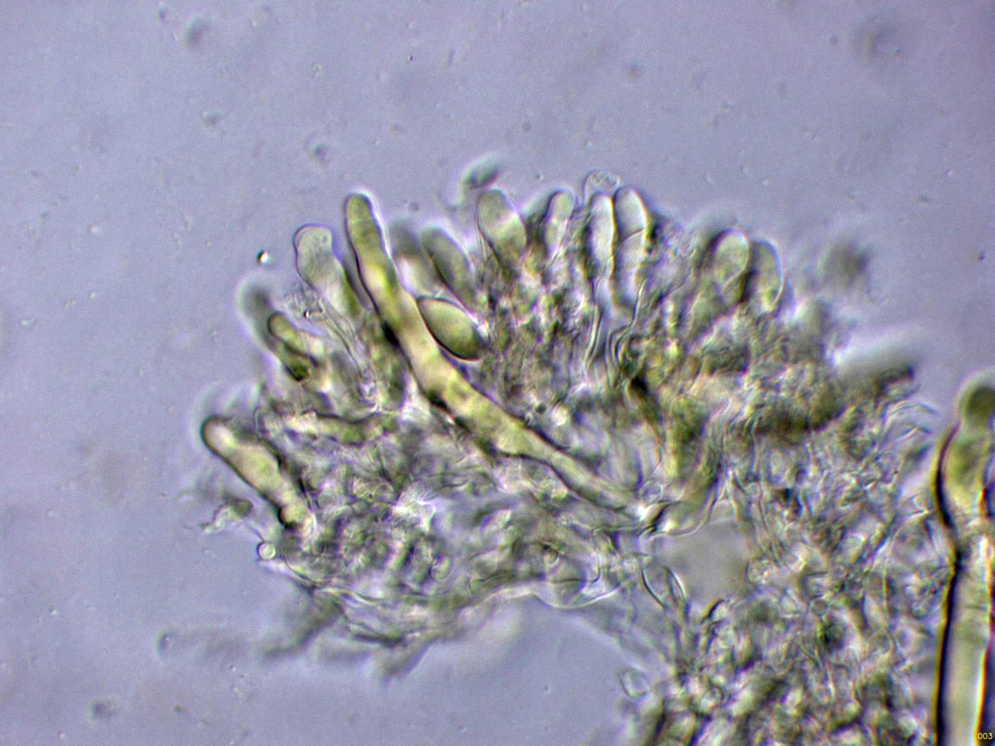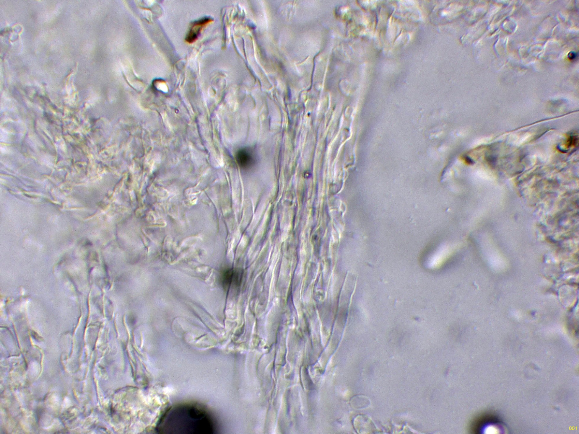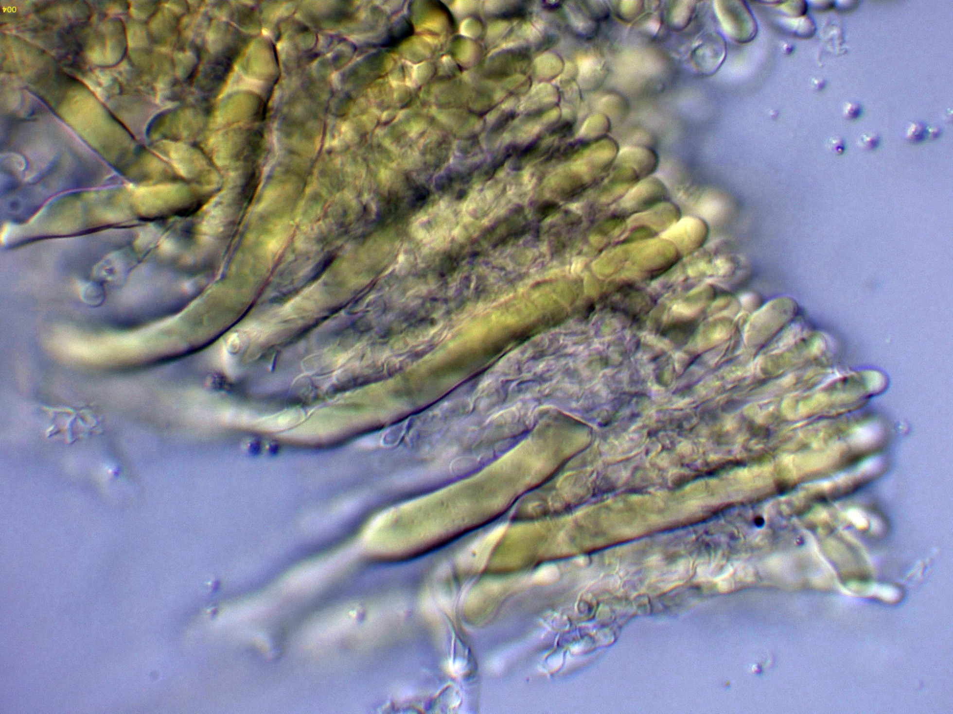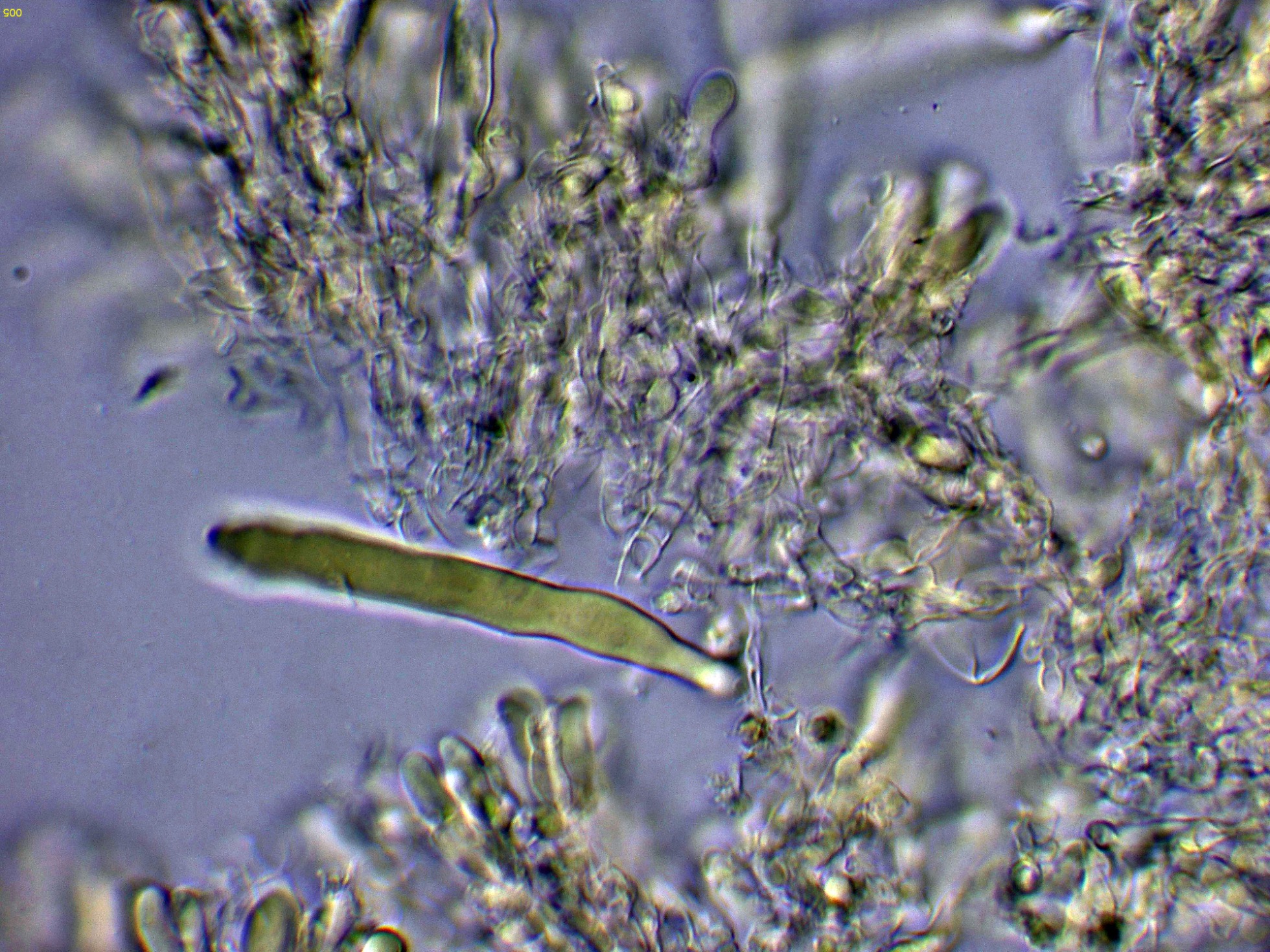 Cistidios en Reactivo de Melzer (en este medio son mucho más visibles), con unas medidas de (57) 62.7 - 100.5 (103.2) × (5.8) 6.2 - 8.5 (8.7) µm.