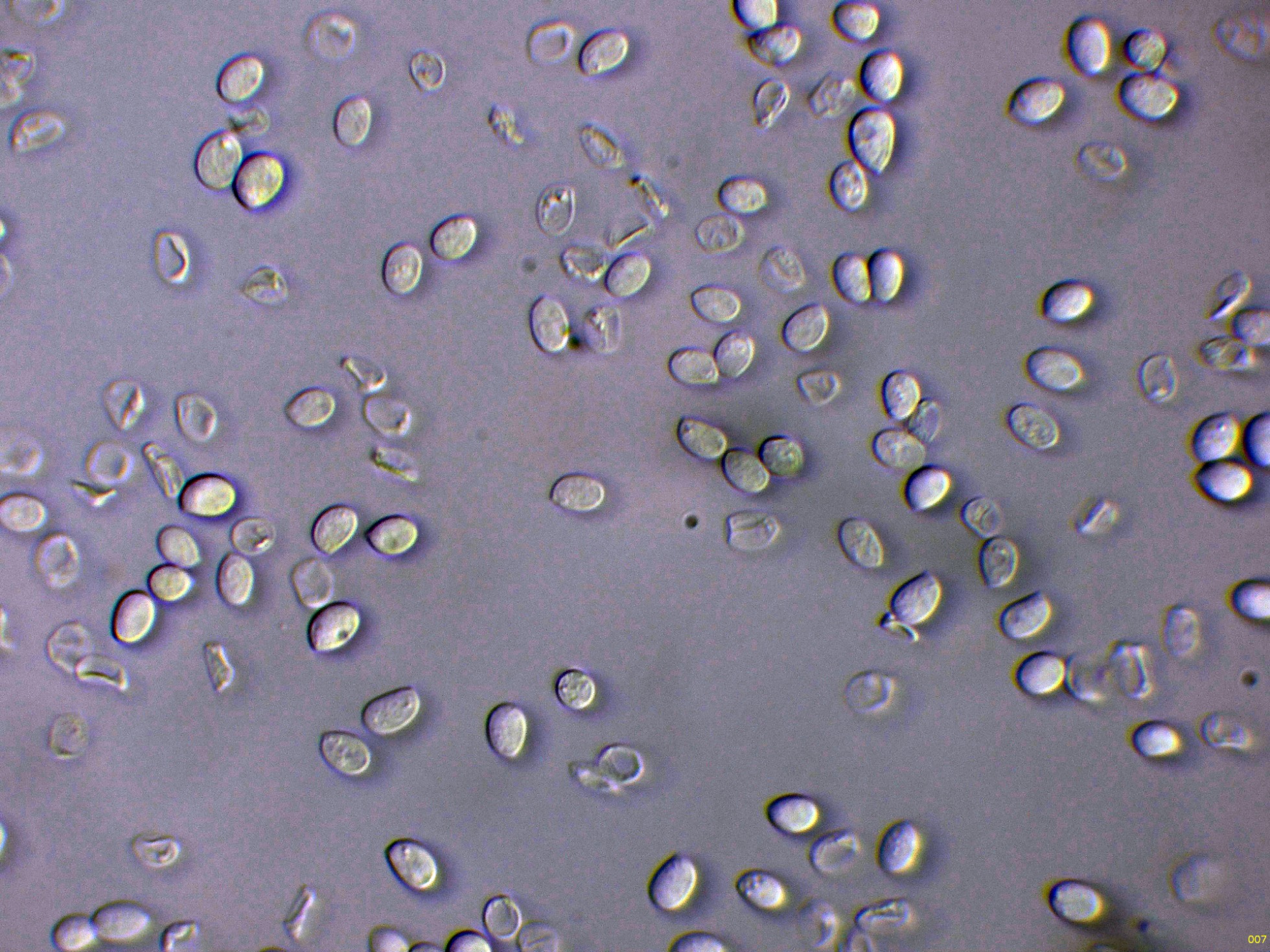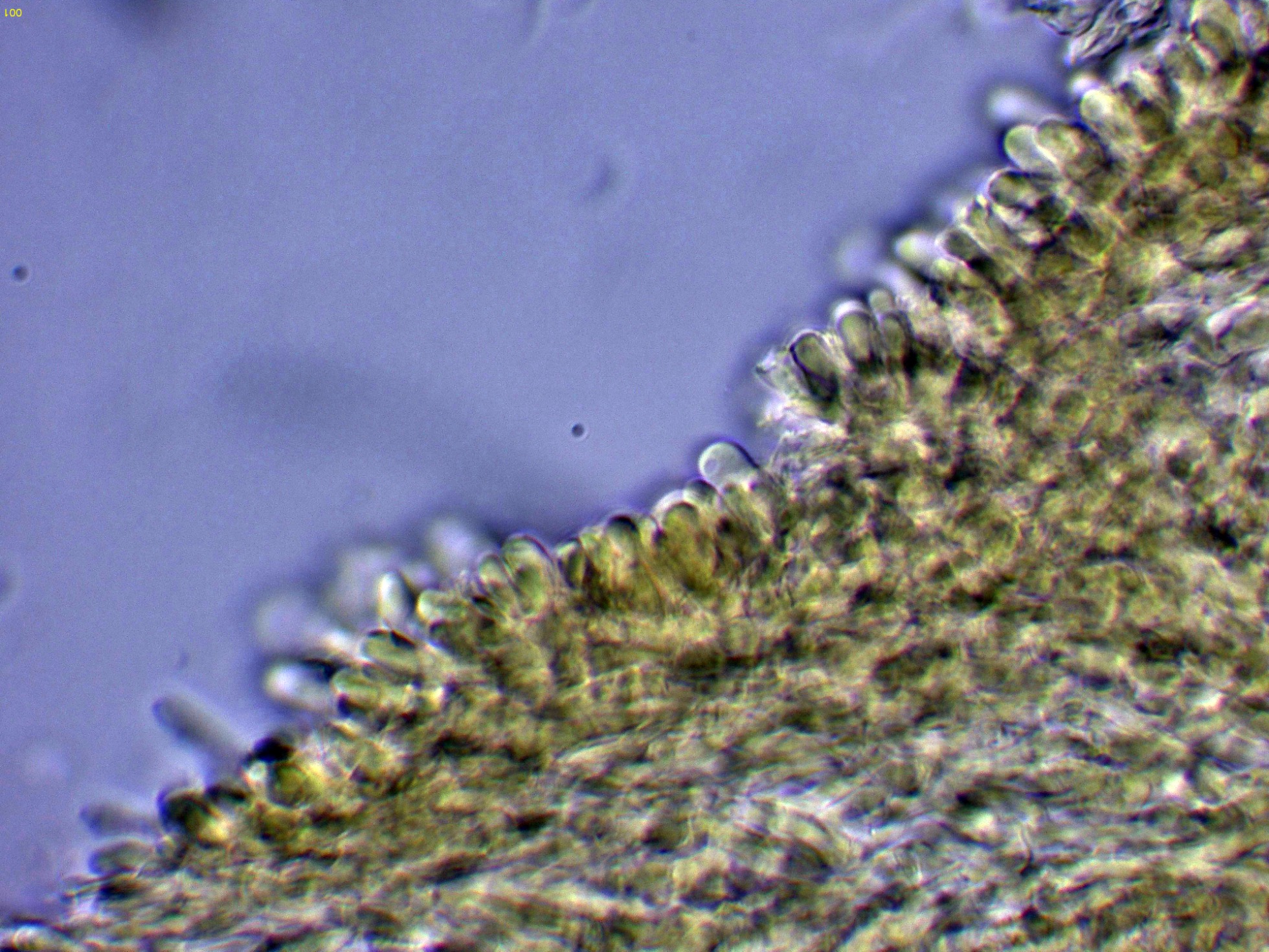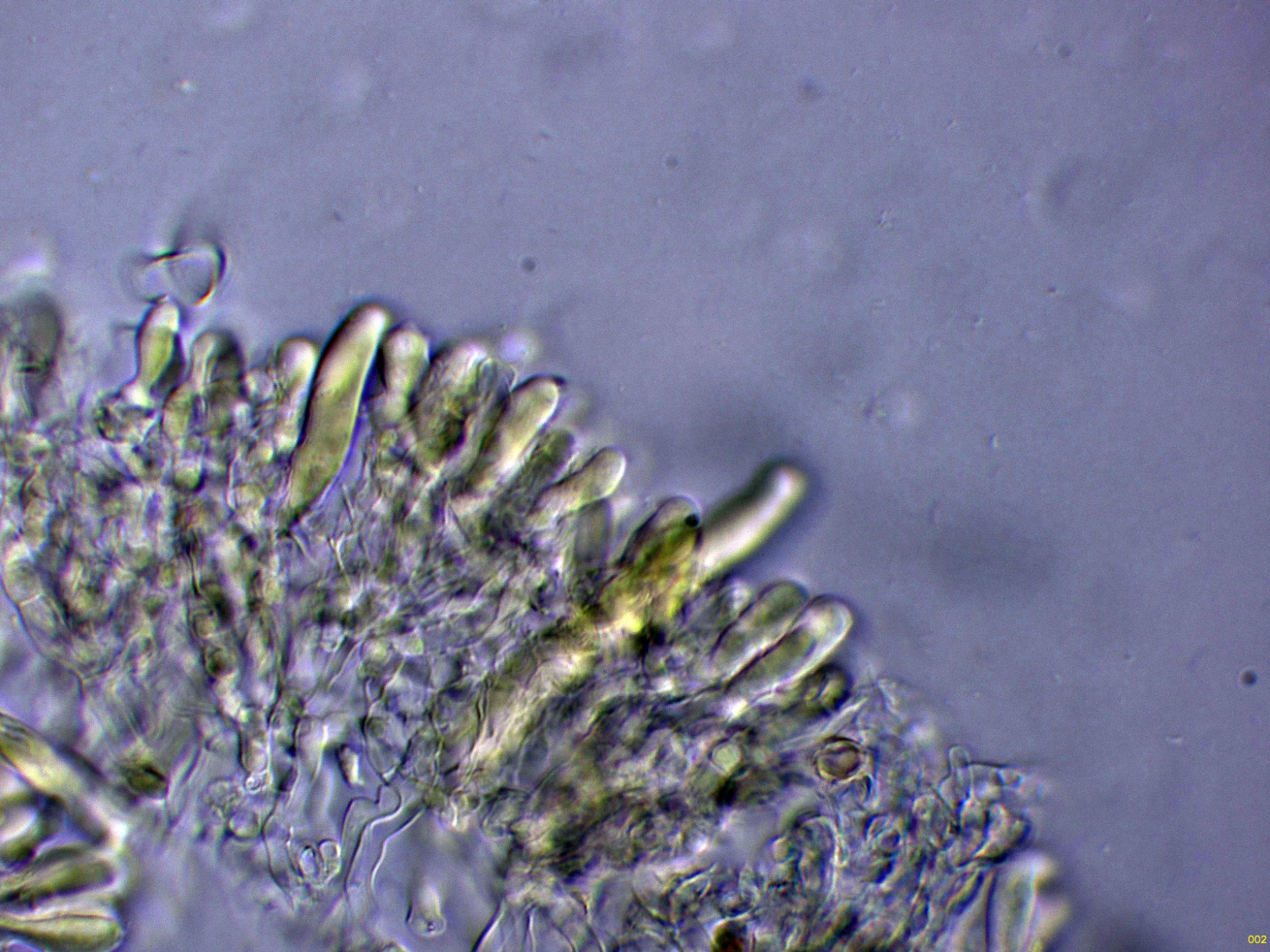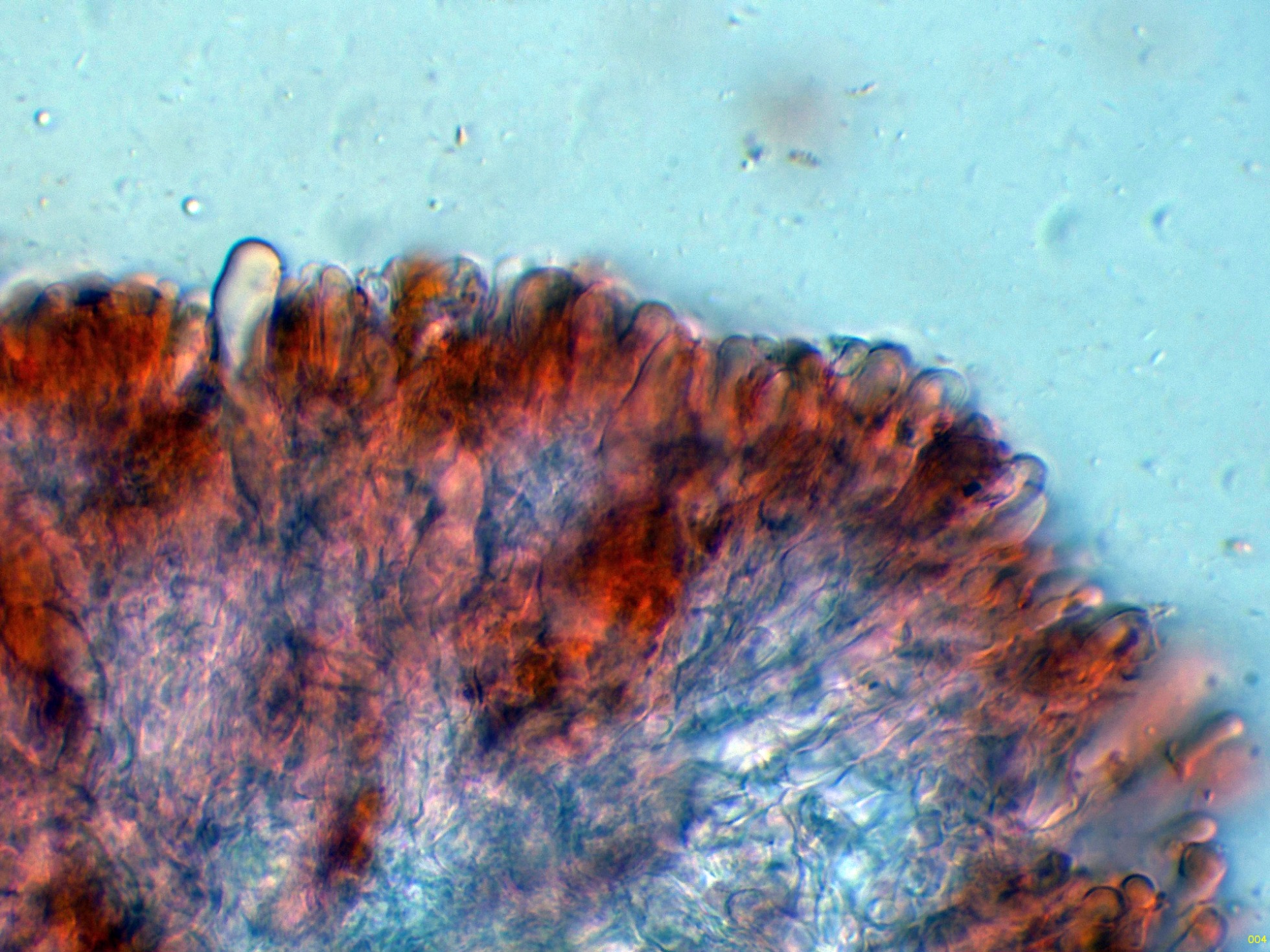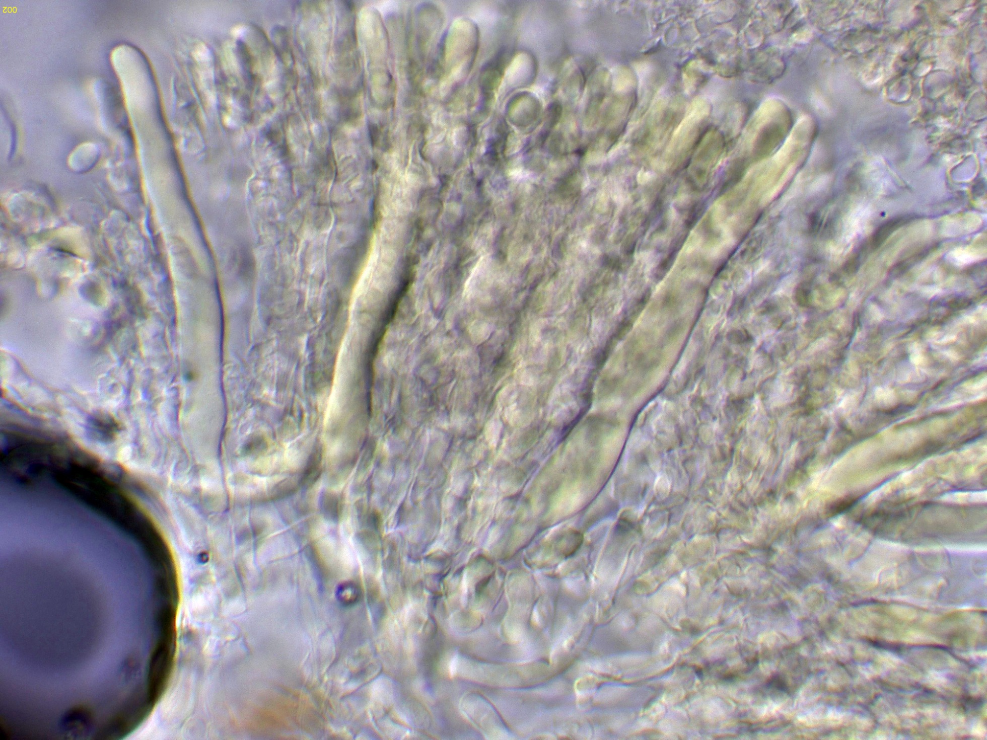 Cistidios en Reactivo de Melzer (en este medio son mucho más visibles), con unas medidas de (57) 62.7 - 100.5 (103.2) × (5.8) 6.2 - 8.5 (8.7) µm.