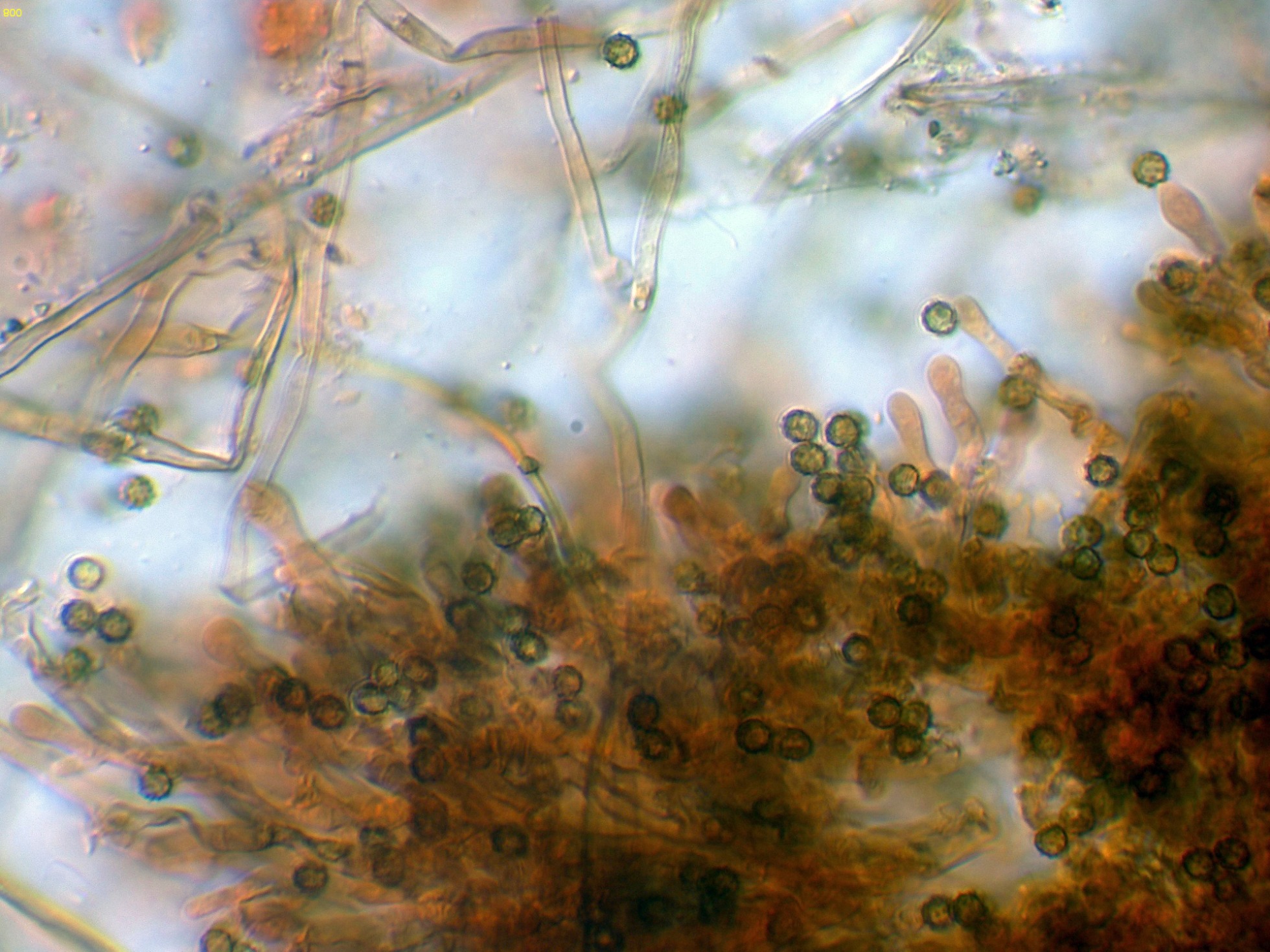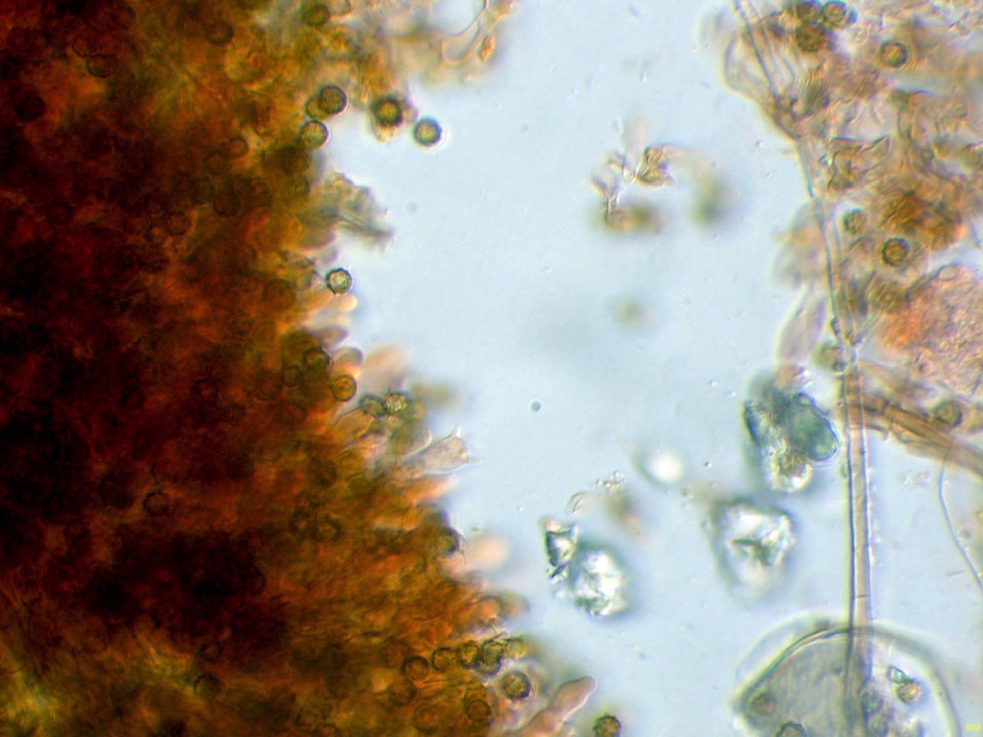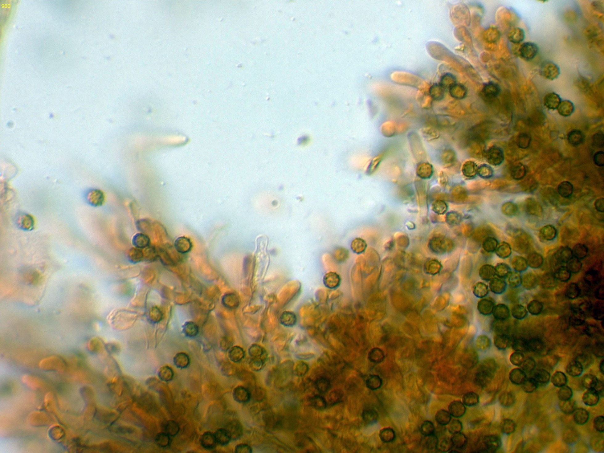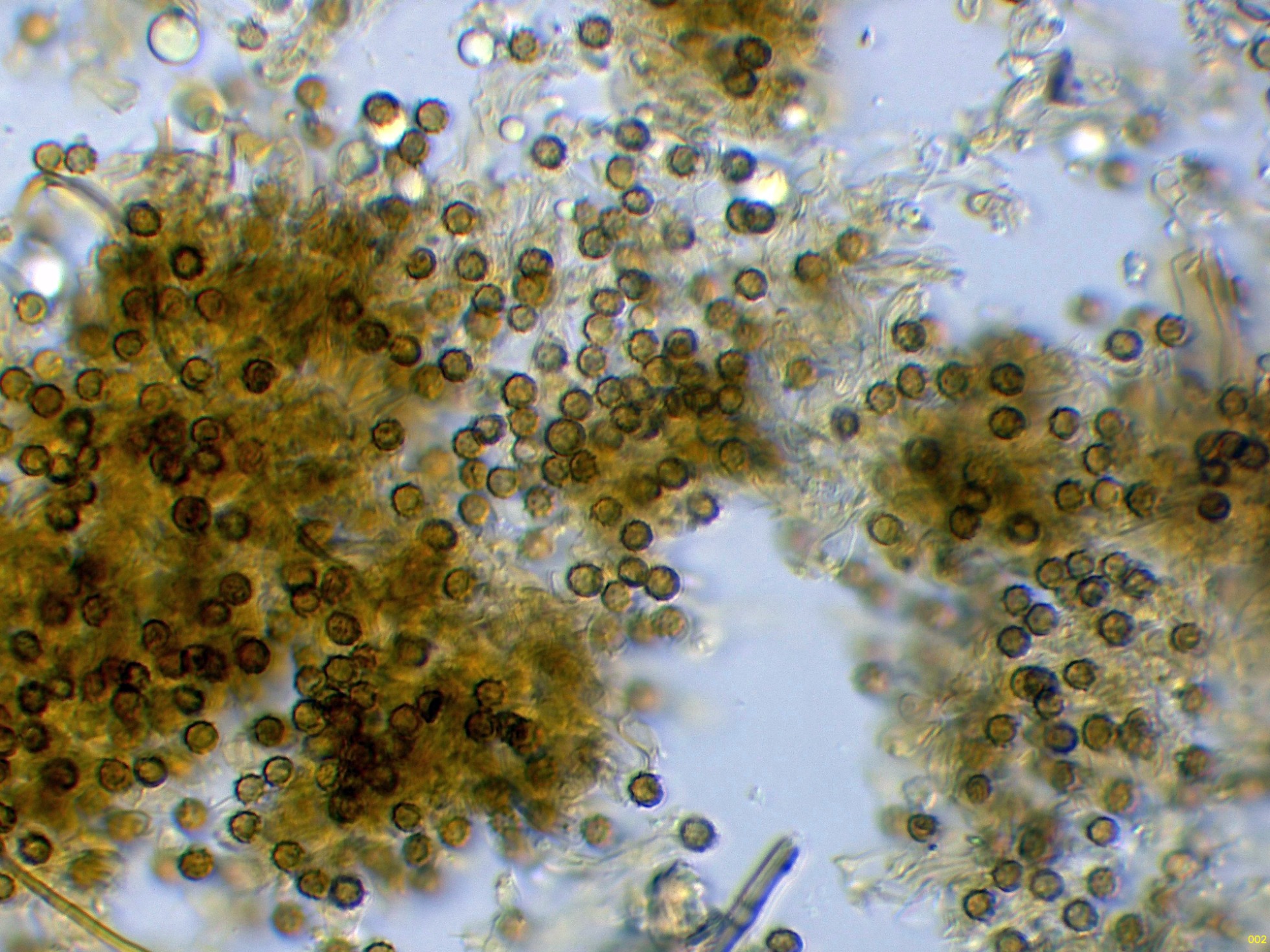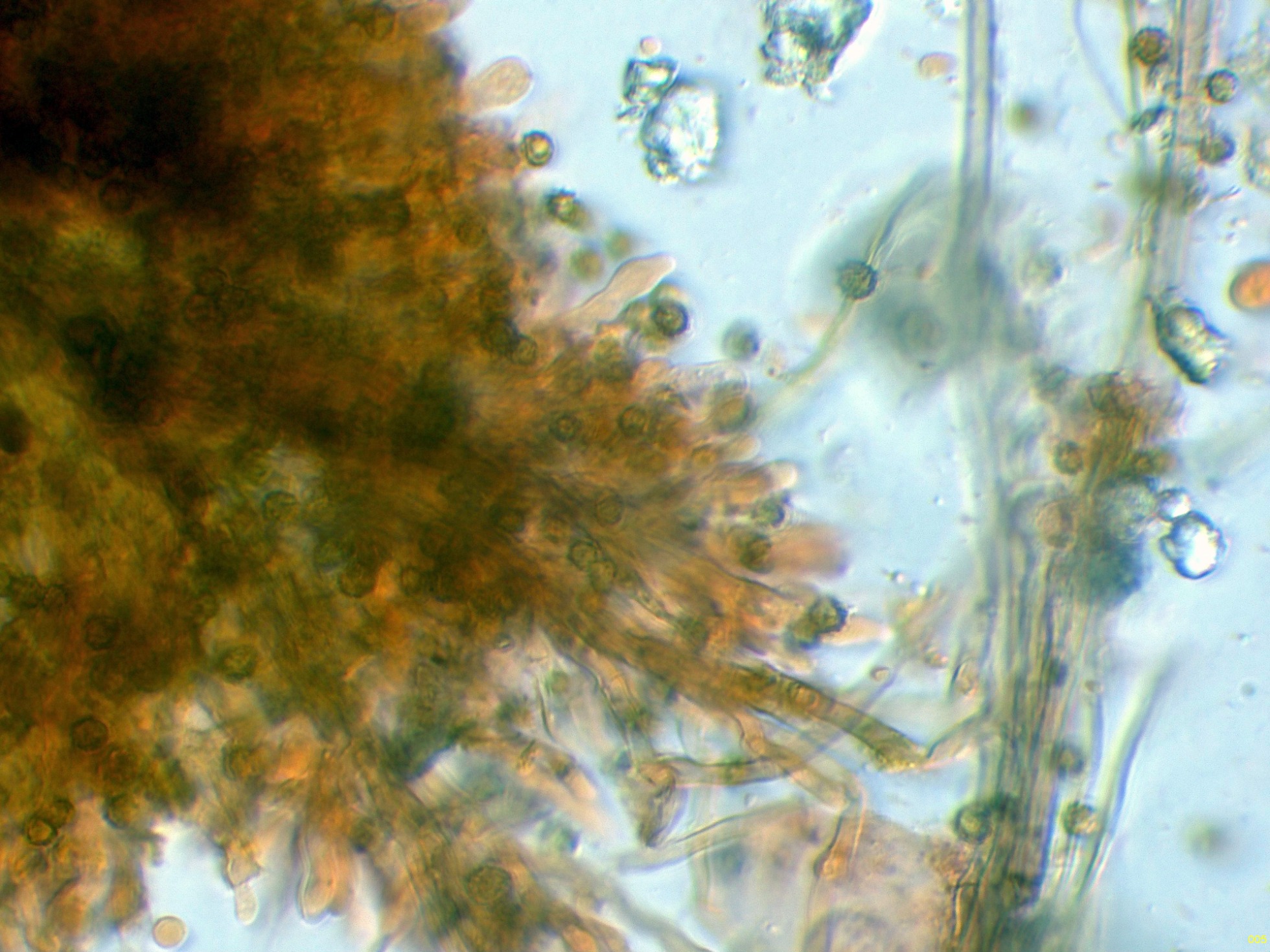 Observaciones: Teniendo en cuenta su microscopía, aunque sugiere una posible Tomentella, esta ya la debo descartar por sus muy pequeñas medidas esporales, también descarto una Tomentellopsis, esta última con esporas hialinas, asimismo debo descartar una Pseudotomentella, con esporas estas si pigmentadas pero de mayor tamaño, y aquí es cuando solo nos queda Amaurodon, utilizando las 2 Claves de que dispongo del género, con esporas esféricas ambas me conducen al Amaurodon viridis, especie que ya estudié en el pasado con basidiomas azul verdosos y esporas de mayor tamaño (4 a 5 micras), como tengo muy claro que en esta ocasión no se trata de Amaurodon viridis, y sin tener claro al 100% de que se trate ni tan siquiera de un Amaurodon, y además estando completamente convencido de que los datos moleculares en este caso tampoco aportarían nada o muy poco, dejo el tema abierto a futuros estudios como Amaurodon cf. y mi número de herbario.