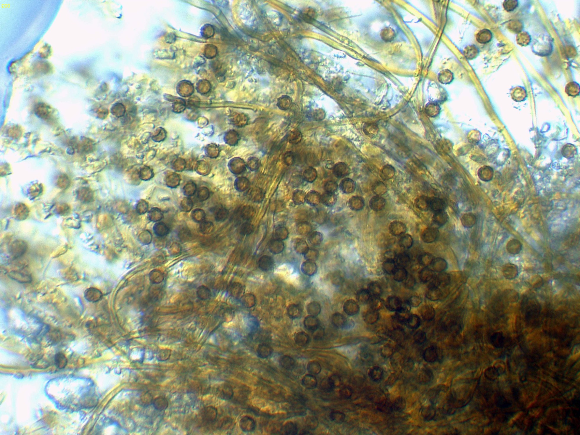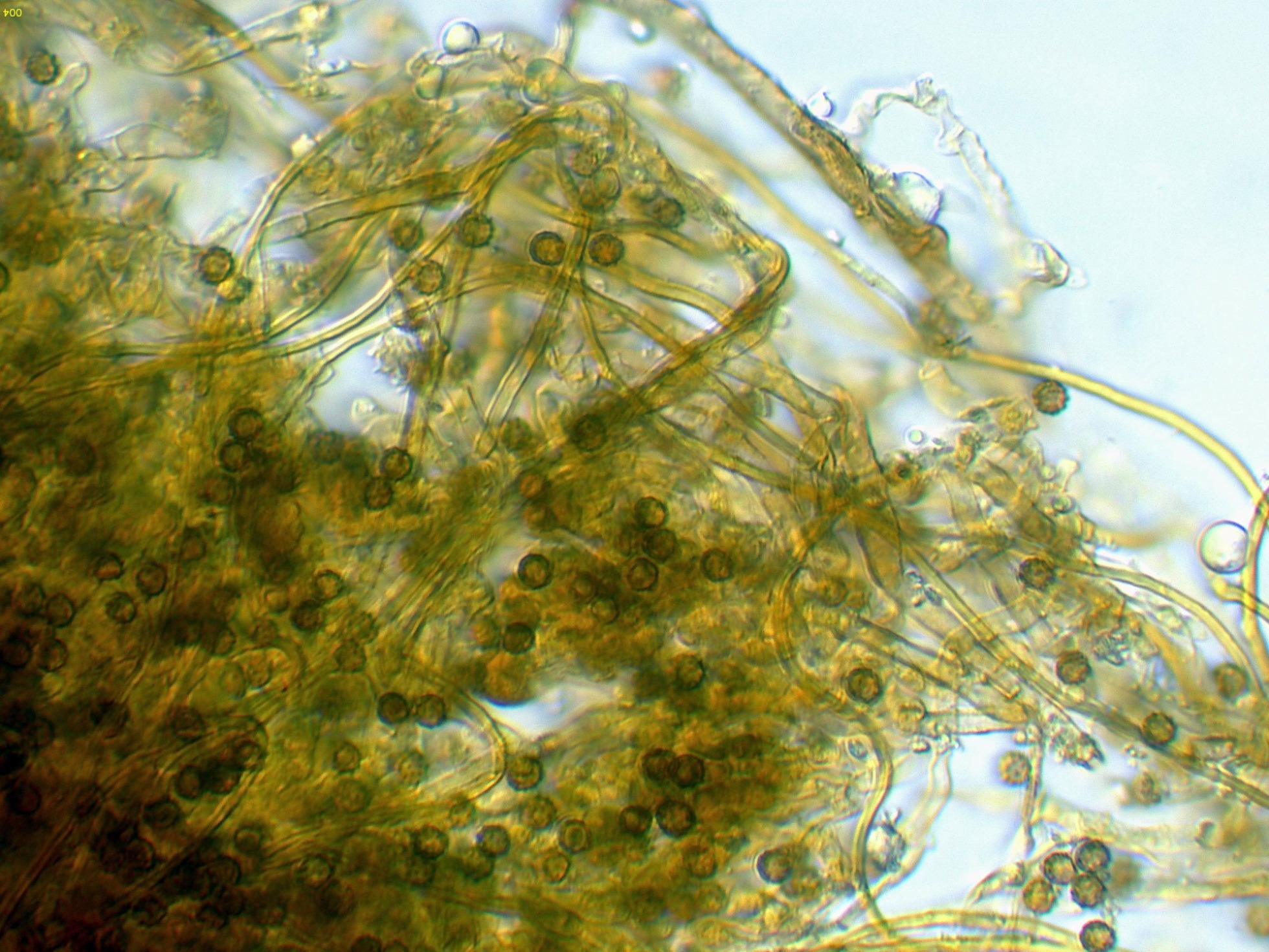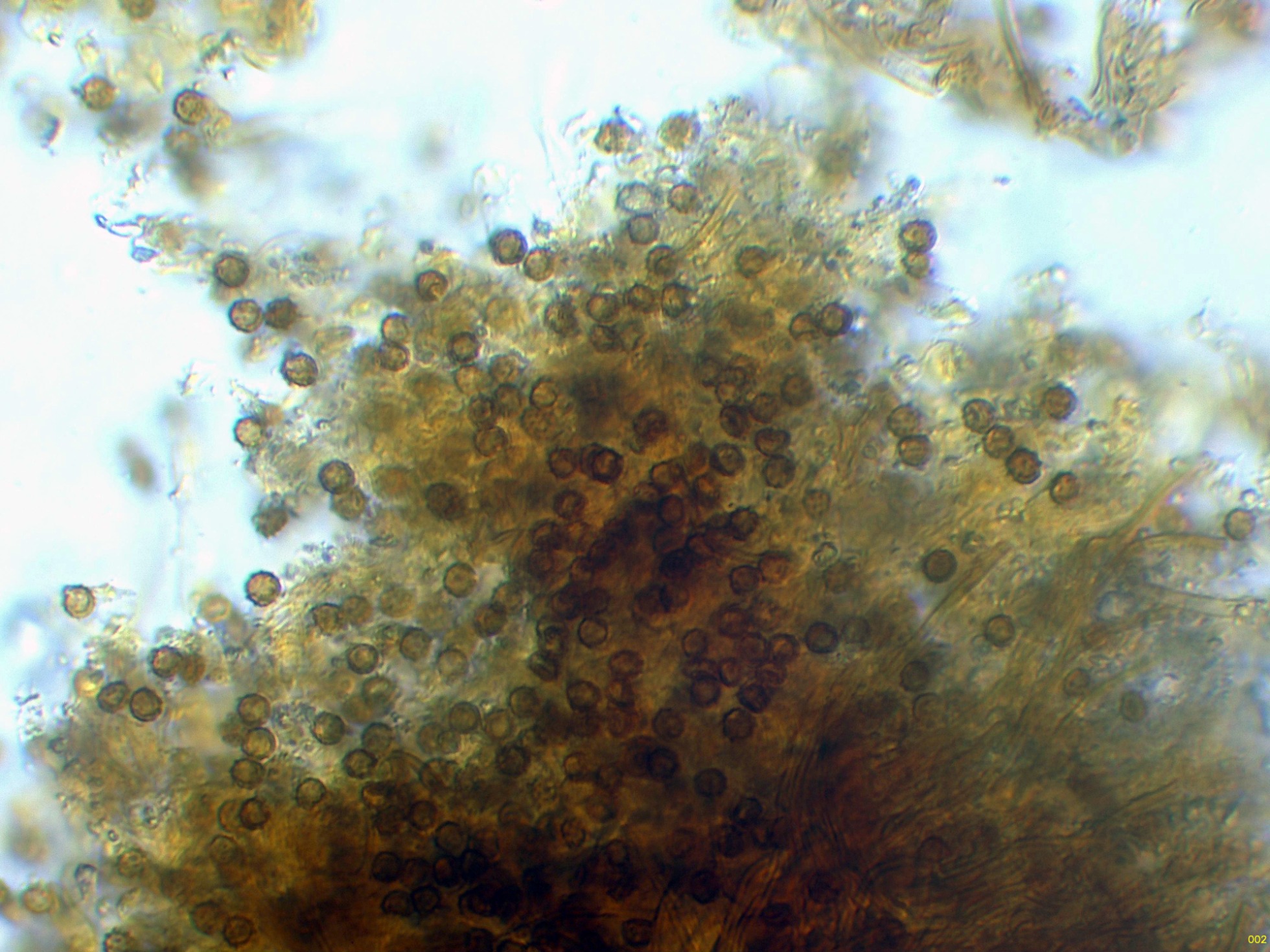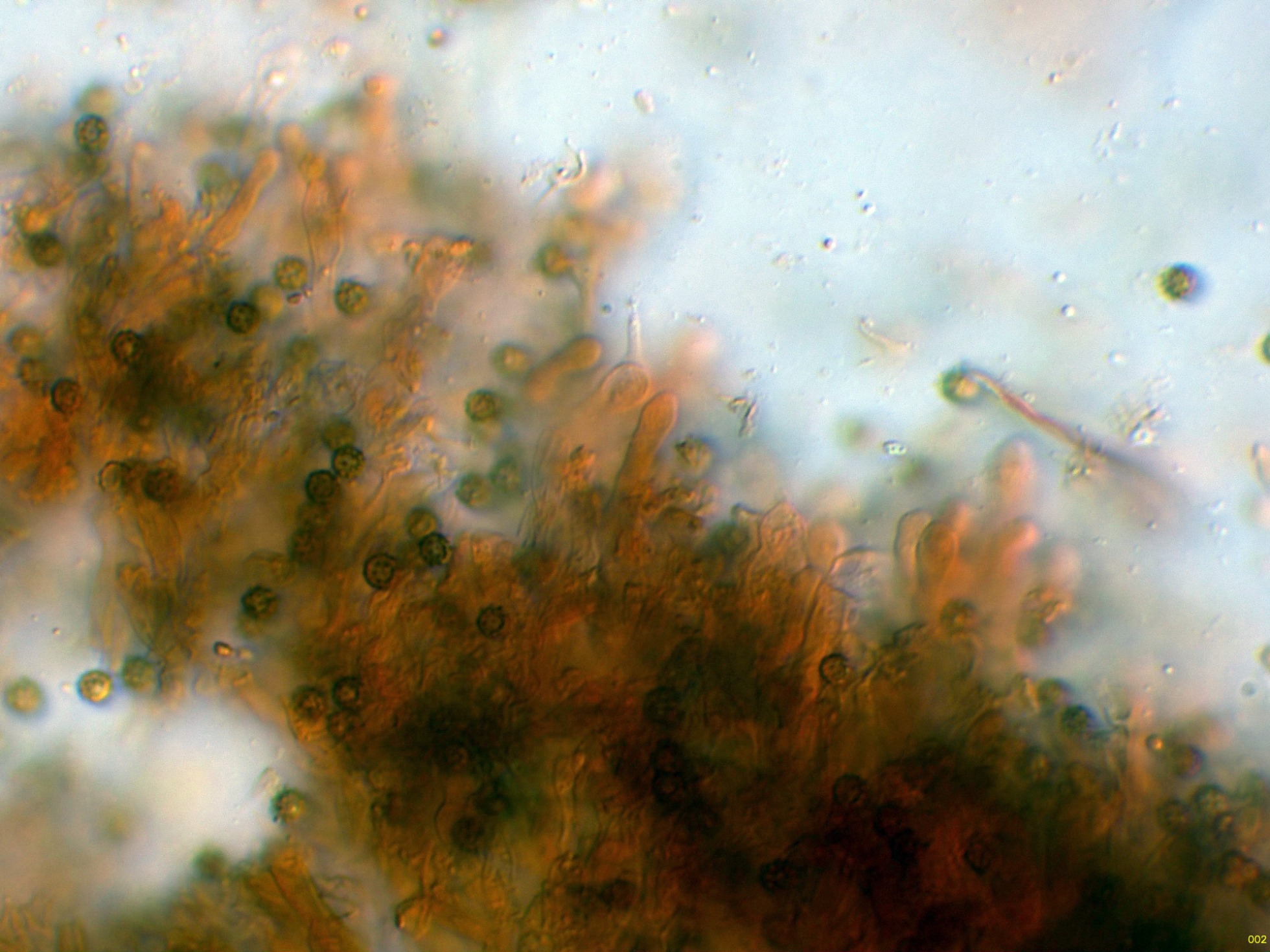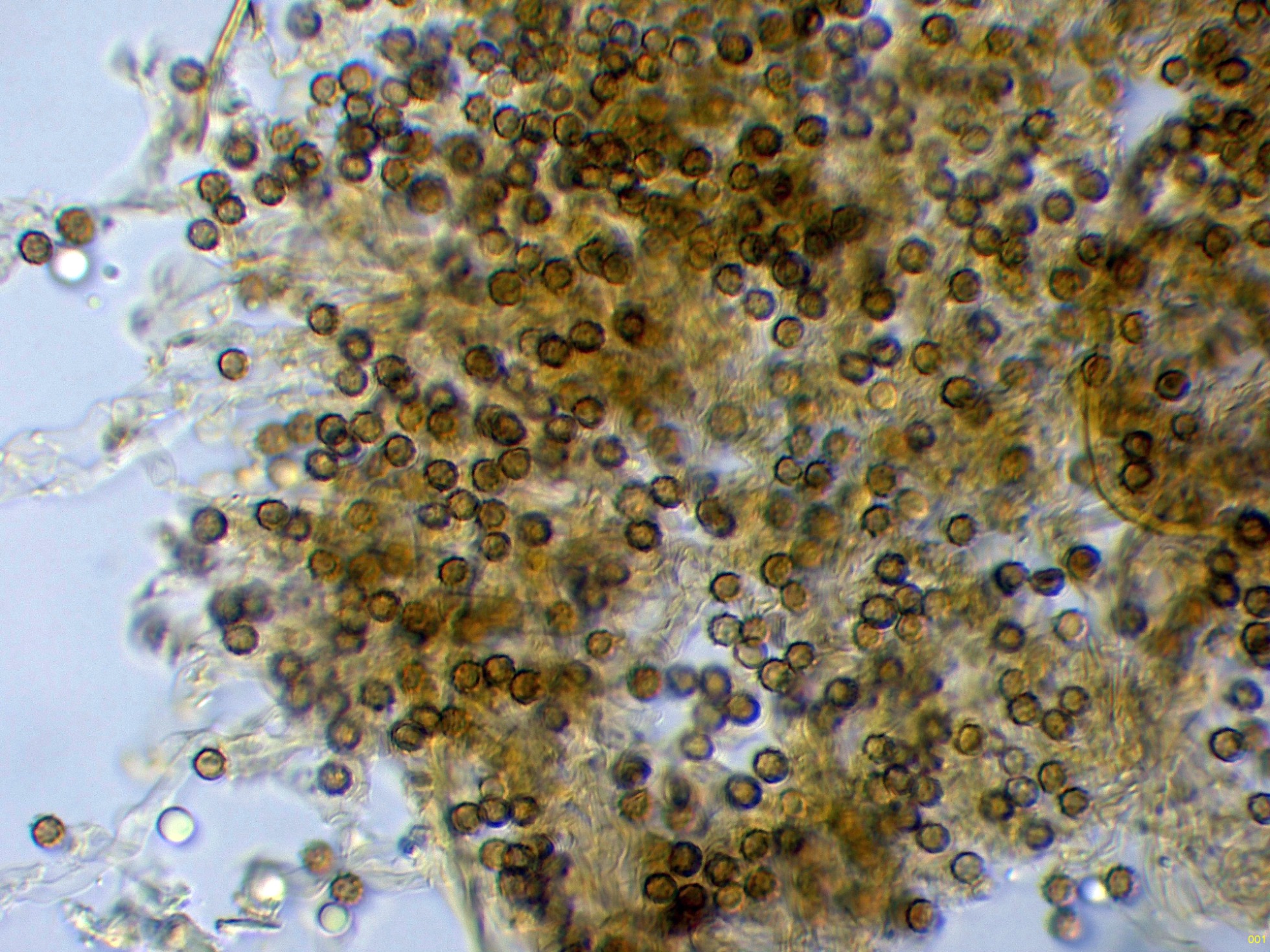 Observaciones: Teniendo en cuenta su microscopía, aunque sugiere una posible Tomentella, esta ya la debo descartar por sus muy pequeñas medidas esporales, también descarto una Tomentellopsis, esta última con esporas hialinas, asimismo debo descartar una Pseudotomentella, con esporas estas si pigmentadas pero de mayor tamaño, y aquí es cuando solo nos queda Amaurodon, utilizando las 2 Claves de que dispongo del género, con esporas esféricas ambas me conducen al Amaurodon viridis, especie que ya estudié en el pasado con basidiomas azul verdosos y esporas de mayor tamaño (4 a 5 micras), como tengo muy claro que en esta ocasión no se trata de Amaurodon viridis, y sin tener claro al 100% de que se trate ni tan siquiera de un Amaurodon, y además estando completamente convencido de que los datos moleculares en este caso tampoco aportarían nada o muy poco, dejo el tema abierto a futuros estudios como Amaurodon cf. y mi número de herbario.