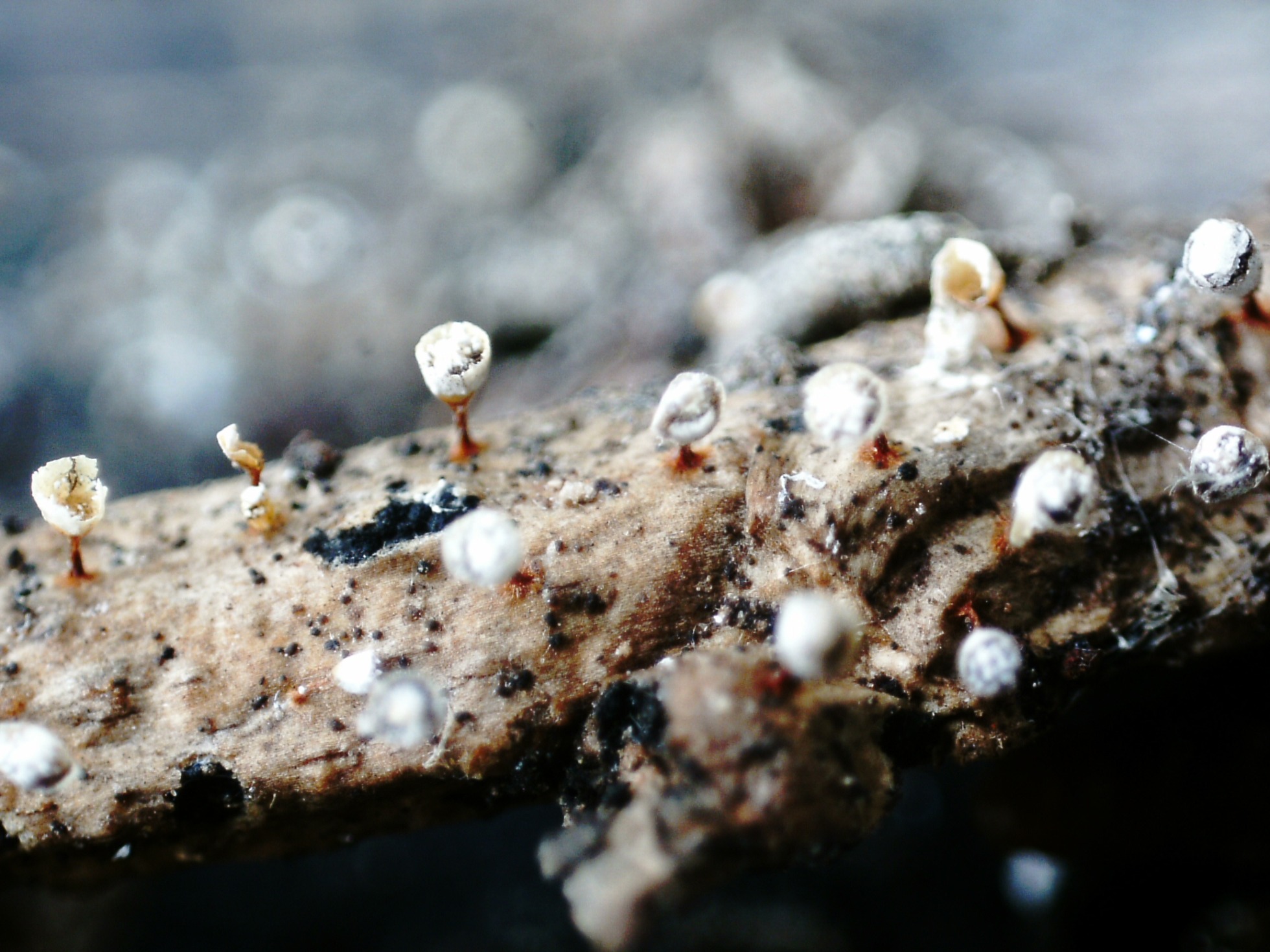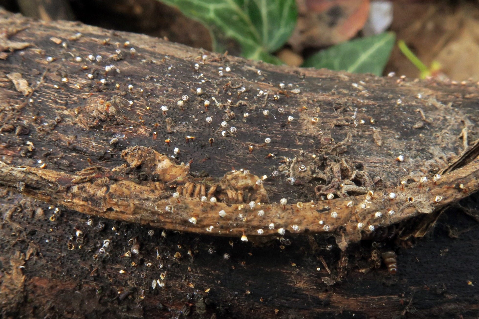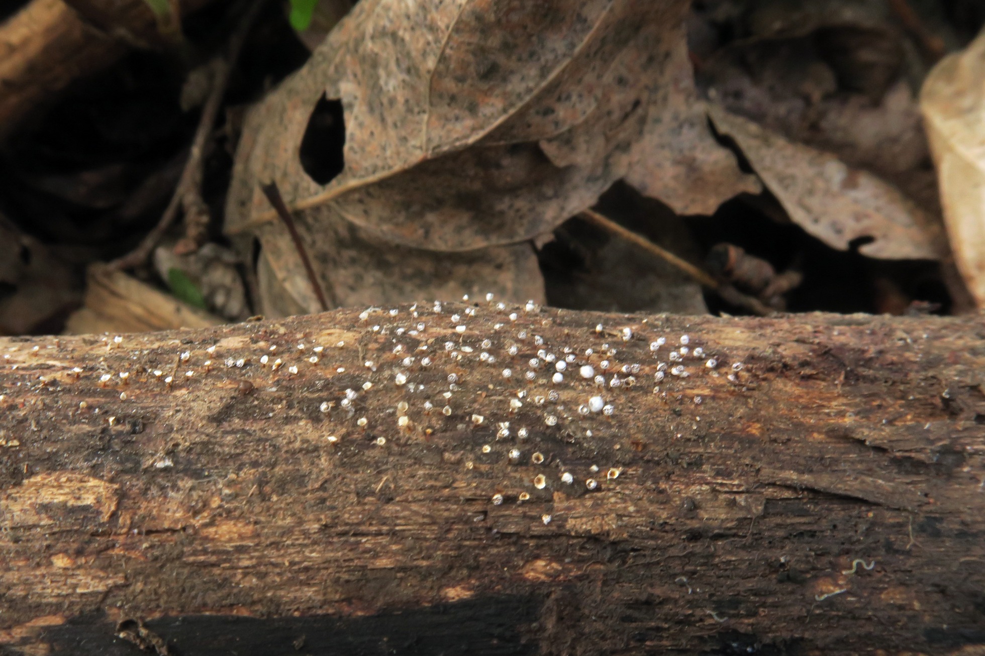 Una buena cantidad de ejemplares brotando de manera dispersa pero abundante tanto sobre la superficie de un tronco del suelo, así como sobre pequeñas ramitas cercanas.